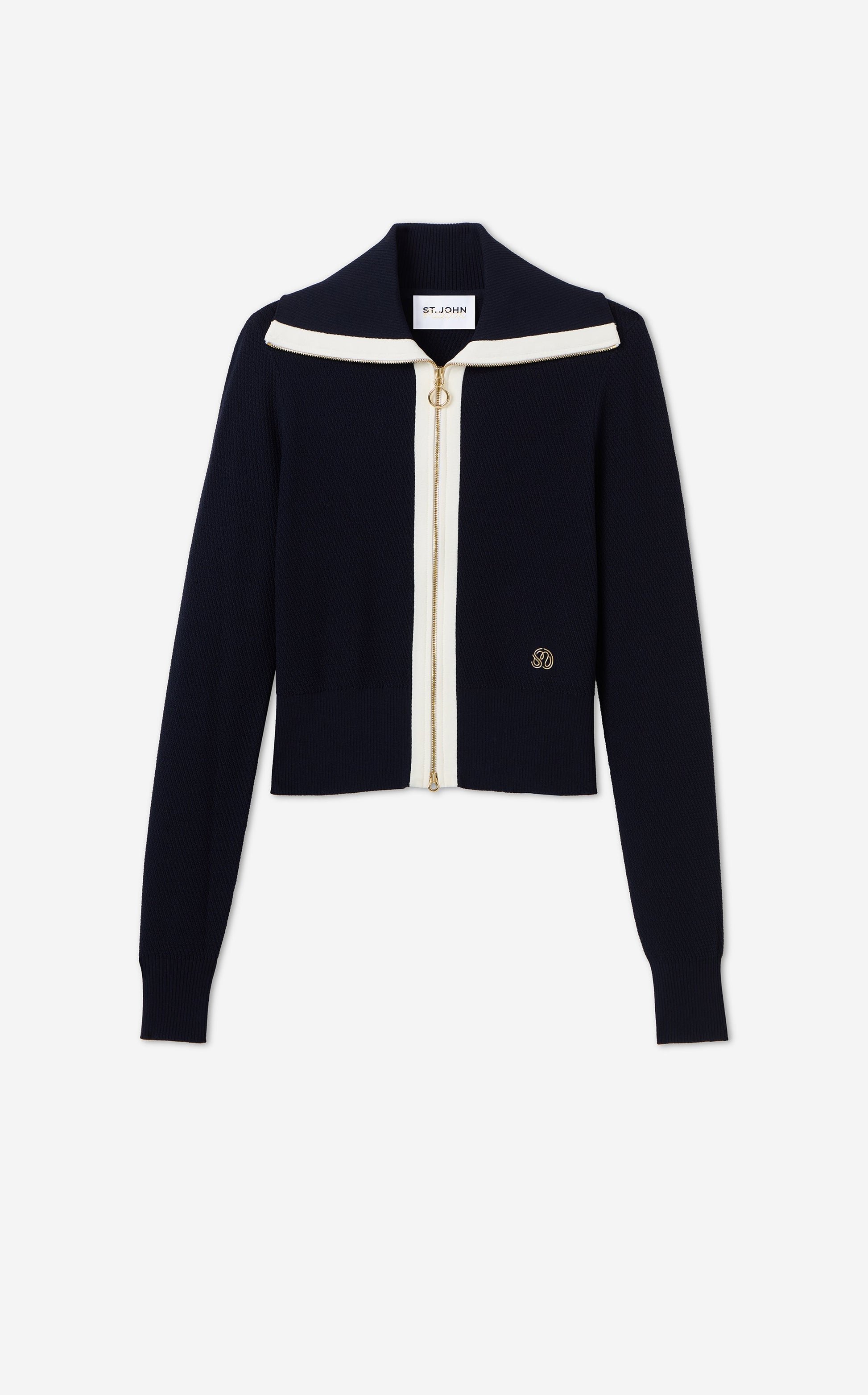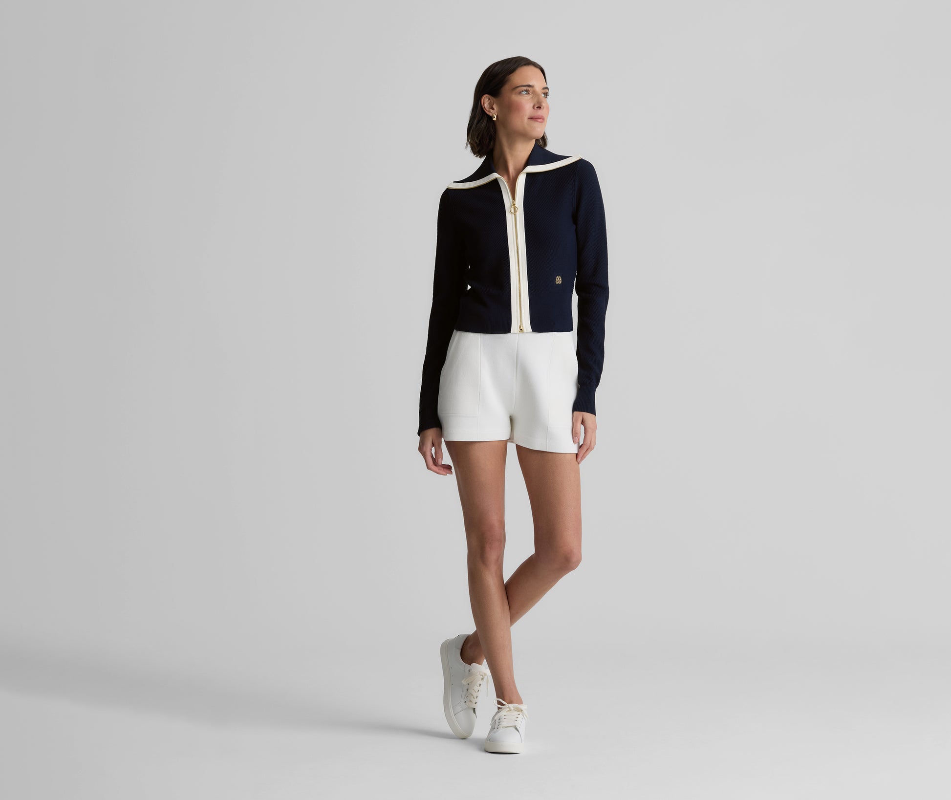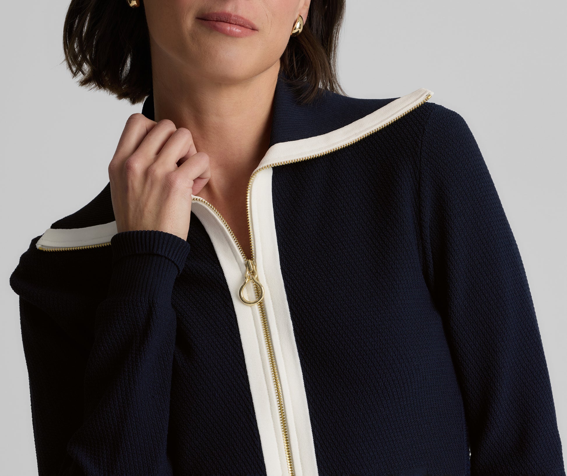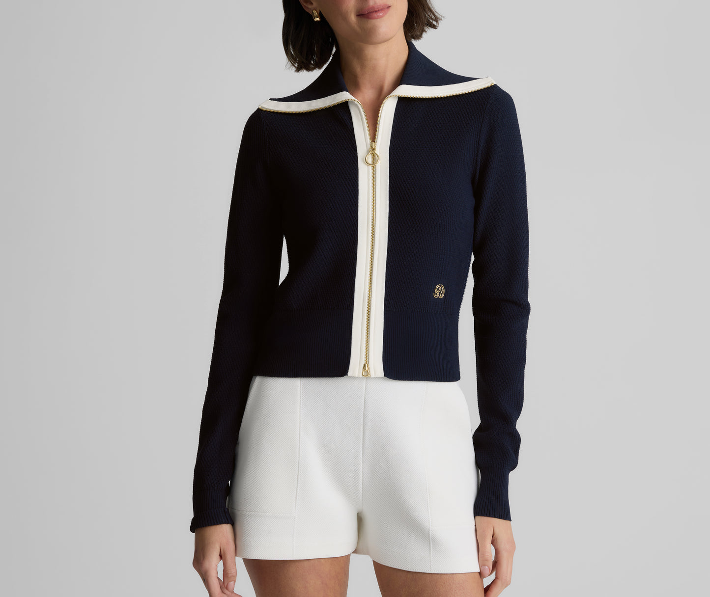 Created in an exclusive collaboration with influential golf brand Malbon, the Danielle offers a refined take on sporty style. Expertly crafted from a lightweight, flexible knit, this jacket features ribbed detailing at the collar, cuffs, and hem for a clean, contoured fit. Elegant accents like gleaming gold hardware and Malbon’s signature embroidered logo add even more luxury, making it a polished layer both on and off the greens.