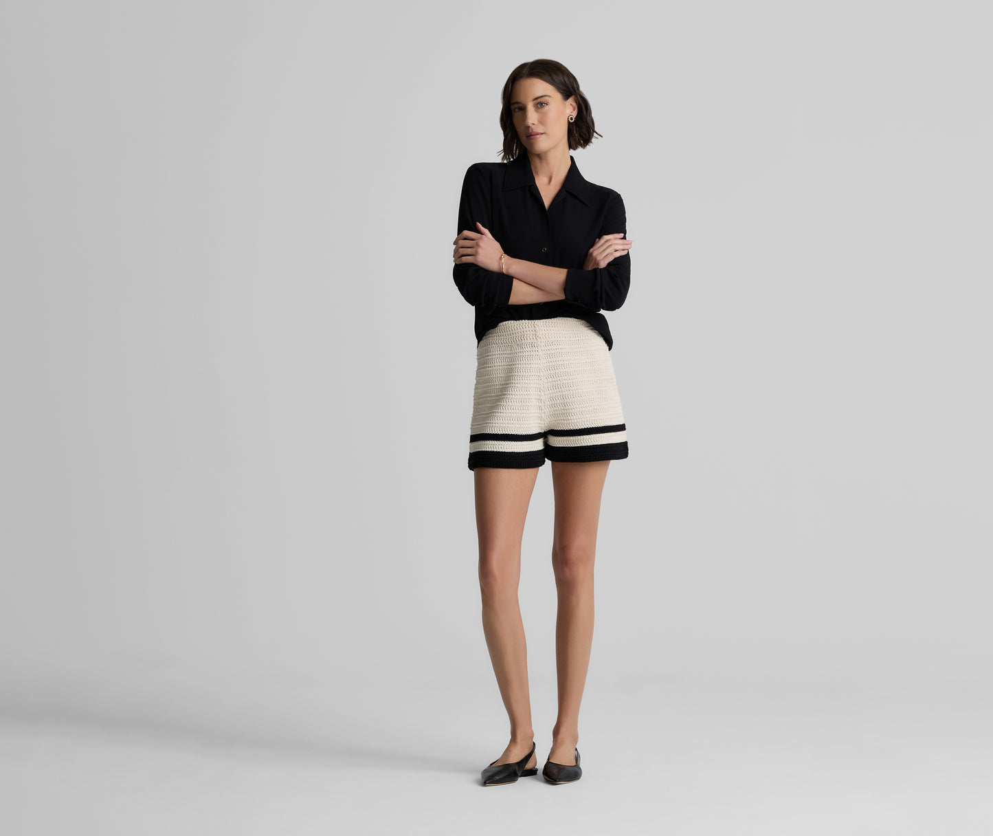 Slightly sporty yet decidedly sophisticated, this Striped Pointelle Knit short reimagines a vintage style for the modern day muse. The Chelsea’s comfortably relaxed fit and breezy feel make it ideal for sunny day wear—especially when paired with the Reagan Sweater to create the chicest set—and the classic stripe and minimalist palette offer endless versatility.