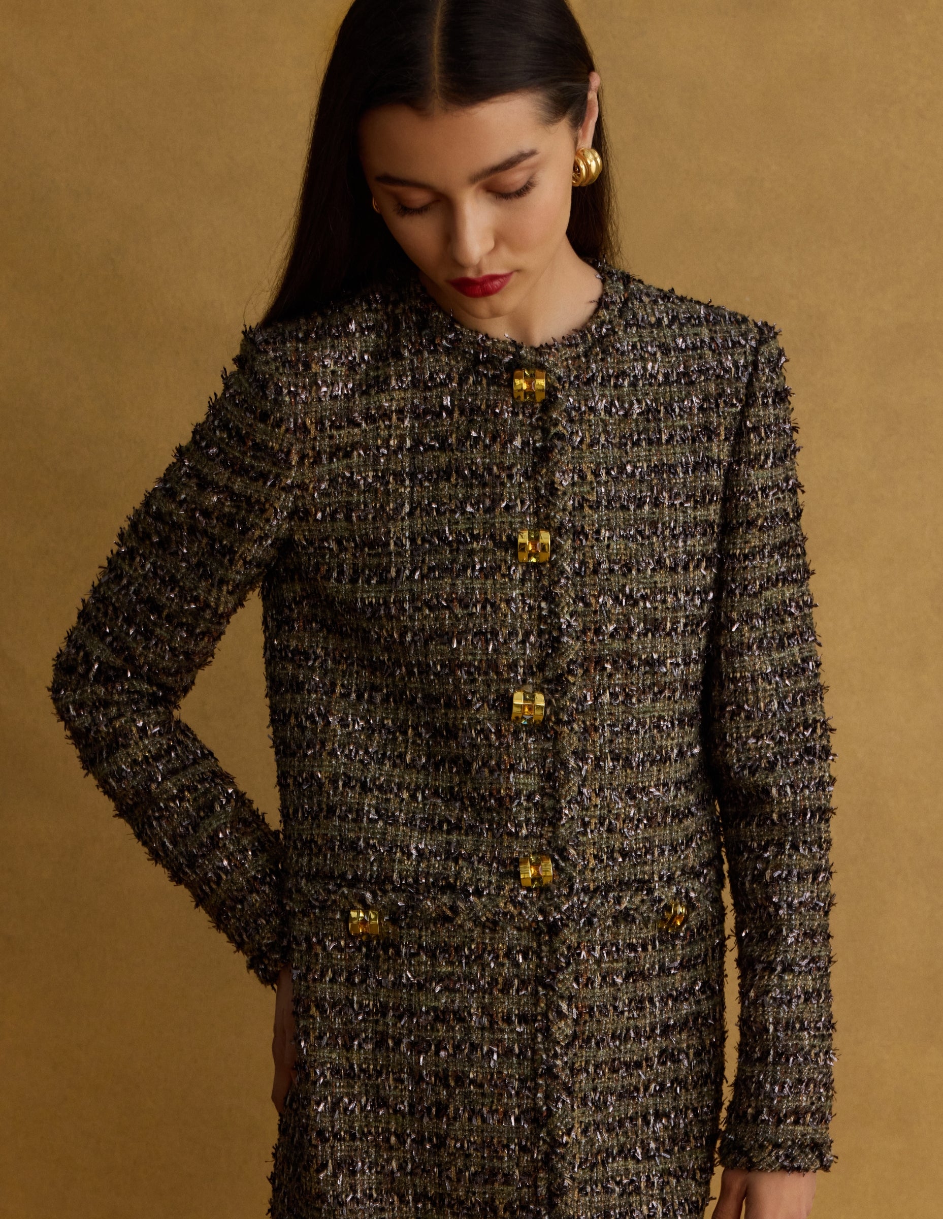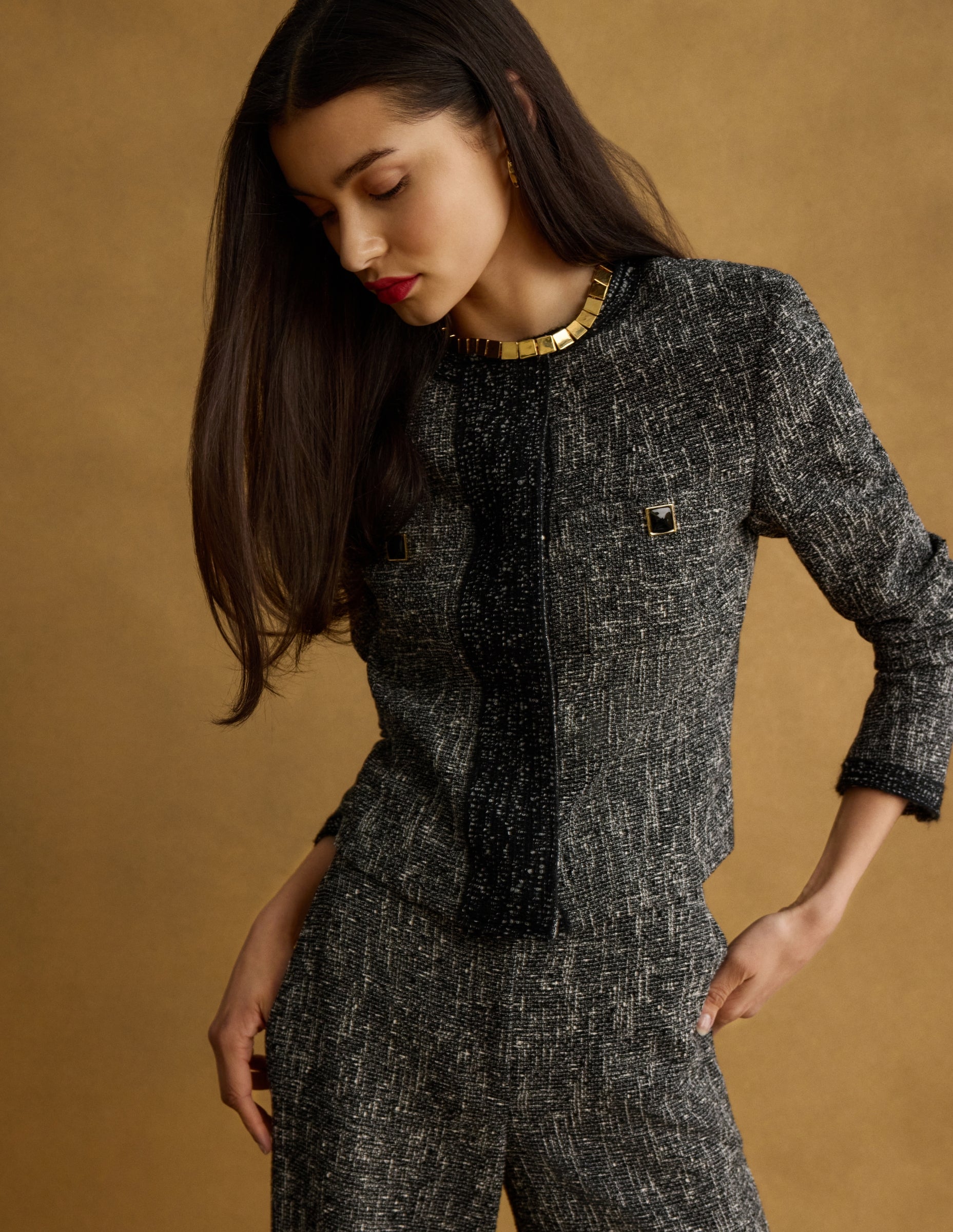 While black may be our natural pick for nighttime, the Fall 2024 Collection puts a spin on the shade. First, we see modern mesh weave deep olive hues in the most intricate and flawless knit. Tweeds blend various hues with darker neutrals for a balanced look and beautiful eyelash texture, highlighted by statement St. John’s signature buttons. Black dresses play with hardware and cut-outs for youthful yet always age-appropriate twist on the expected black dresses. And monochromatic suiting transitions from day to night with bold gold accessories and a bold red lip. So while black may look different this season, it remains the definition of chic and the color we’ll always gravitate to for fall – and forever.