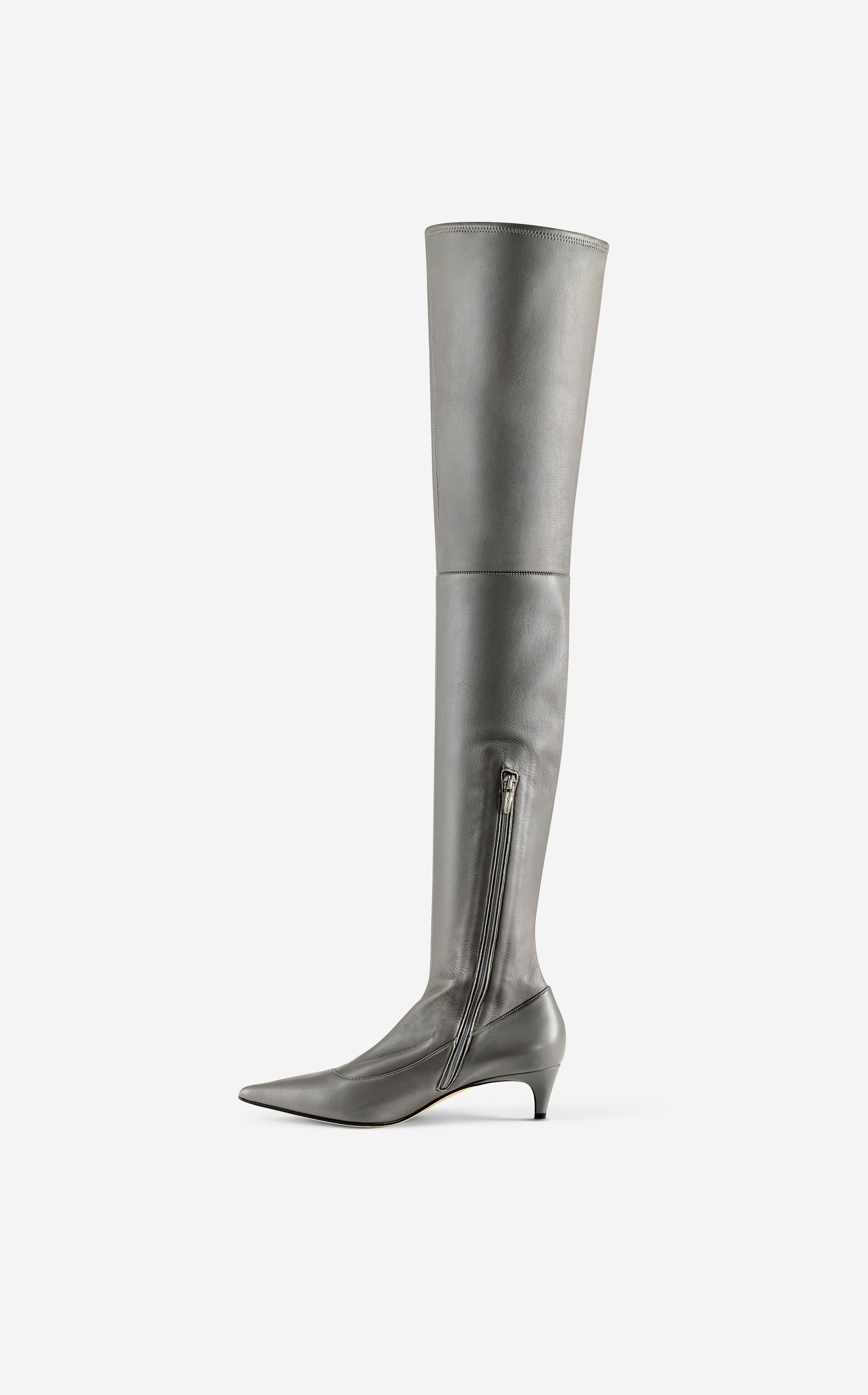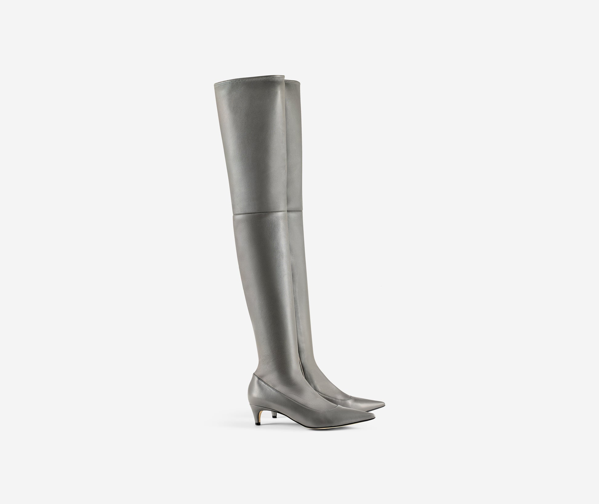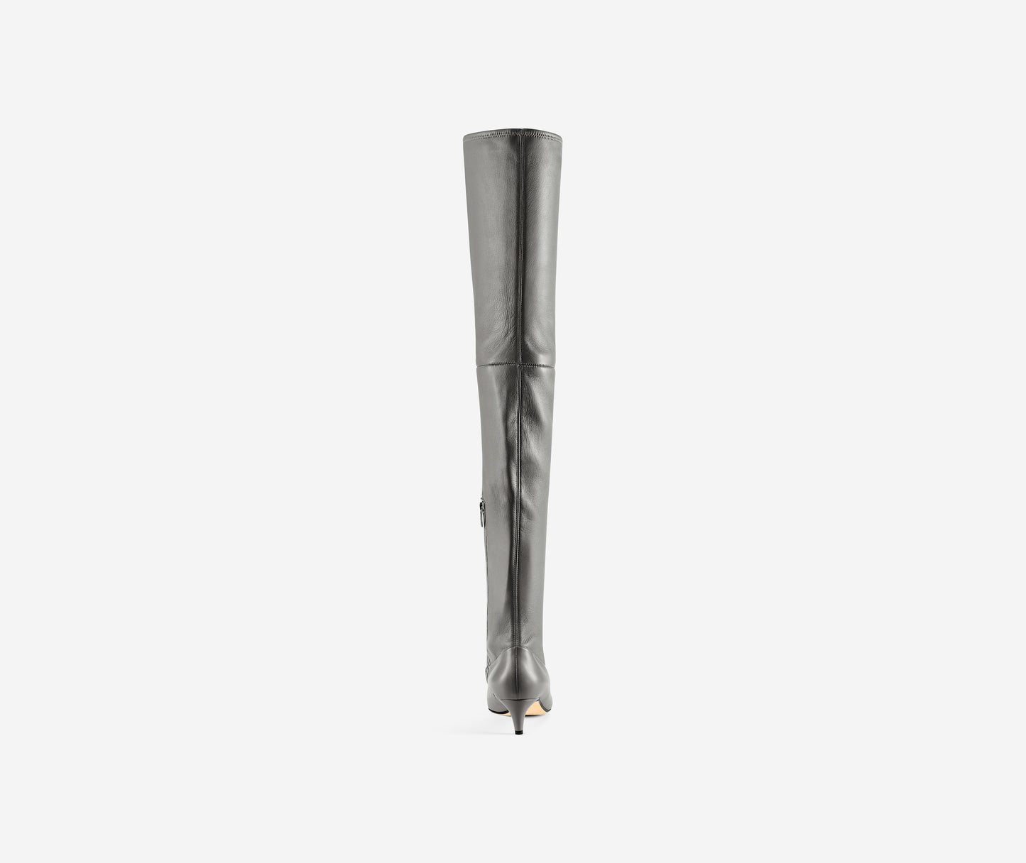 Stretch Nappa leather reaches above the knee in this bold and beautiful kitten heel boot with a center seam for an even more elongating look.