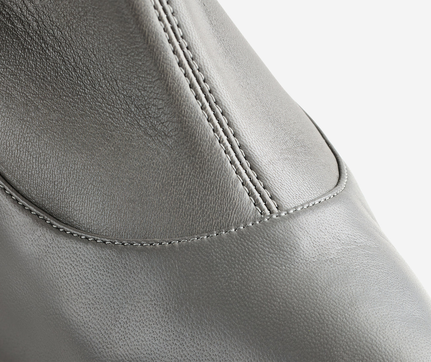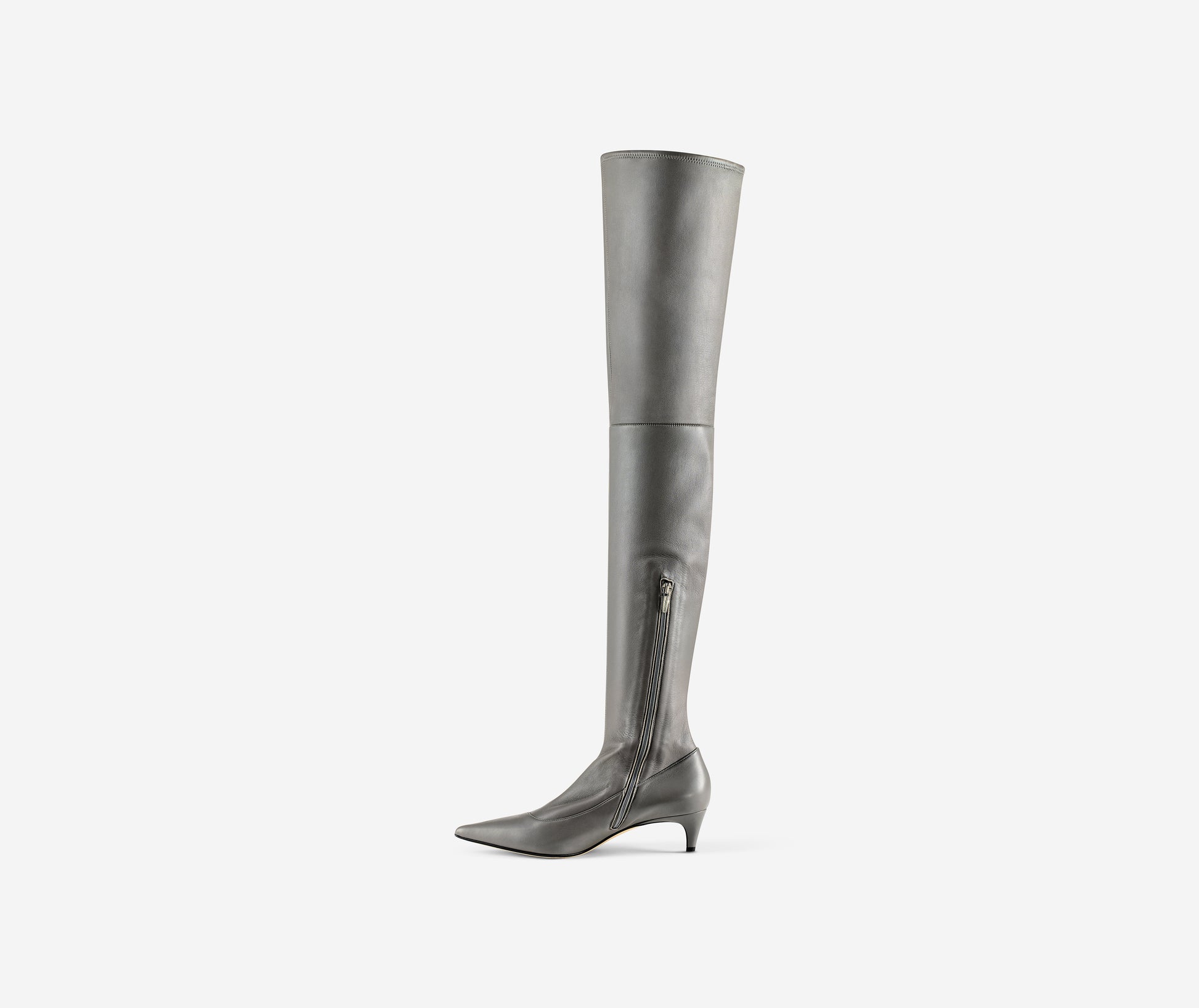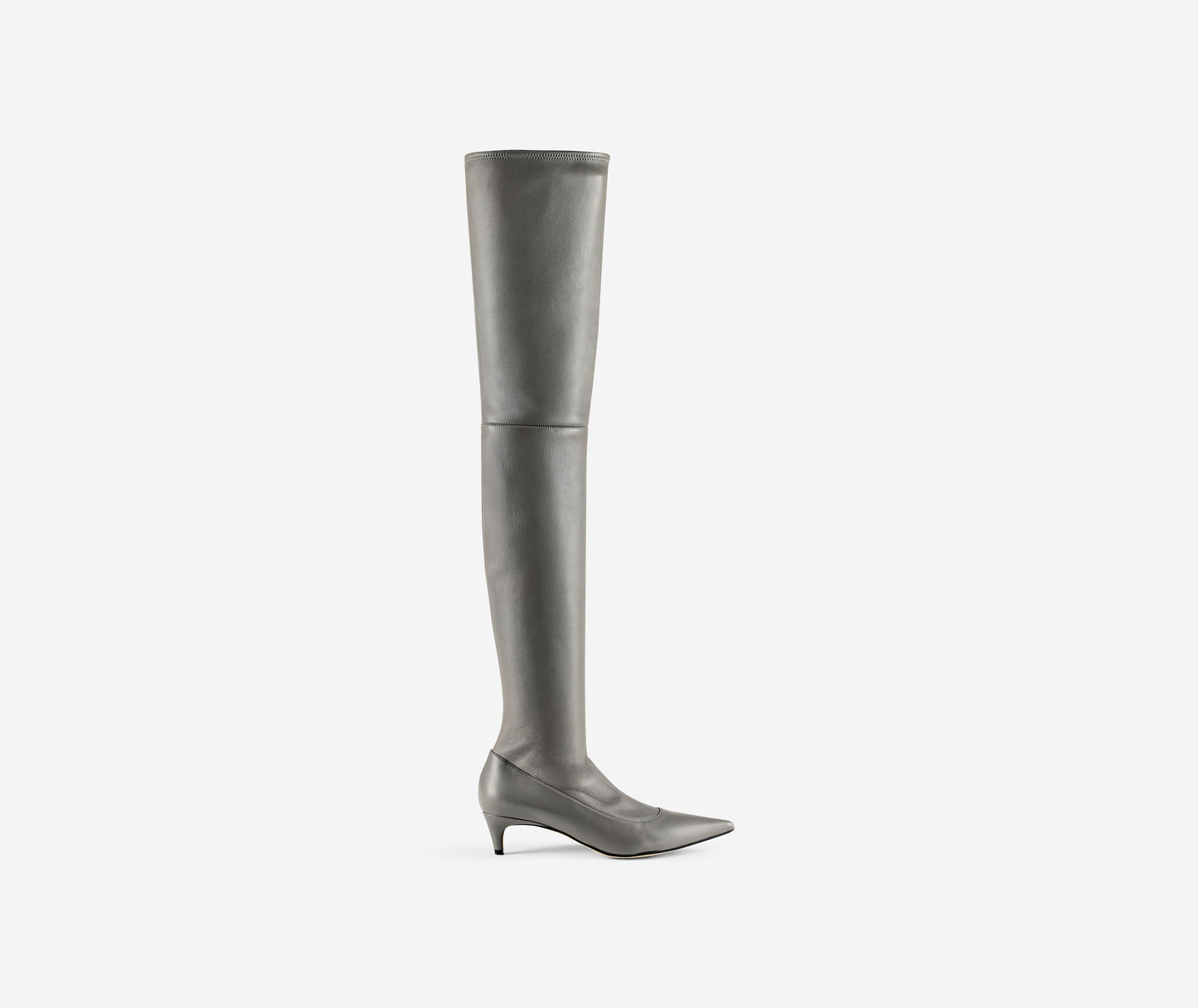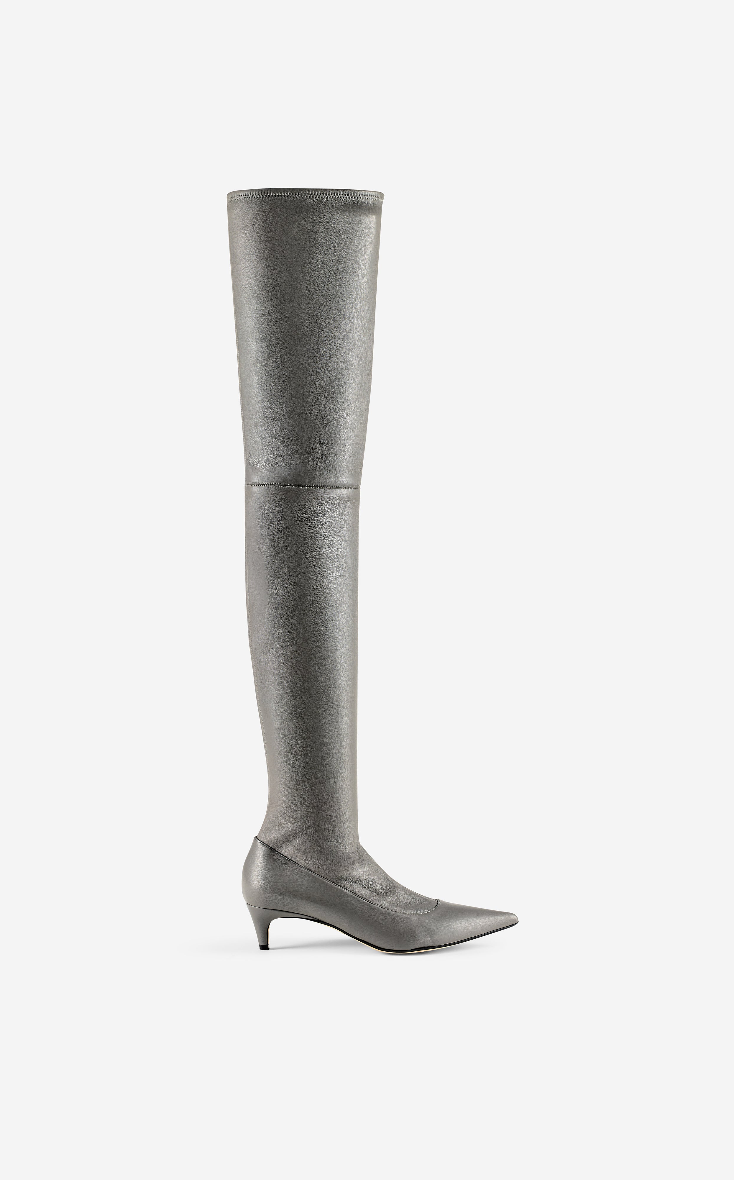 Stretch Nappa leather reaches above the knee in this bold and beautiful kitten heel boot with a center seam for an even more elongating look.