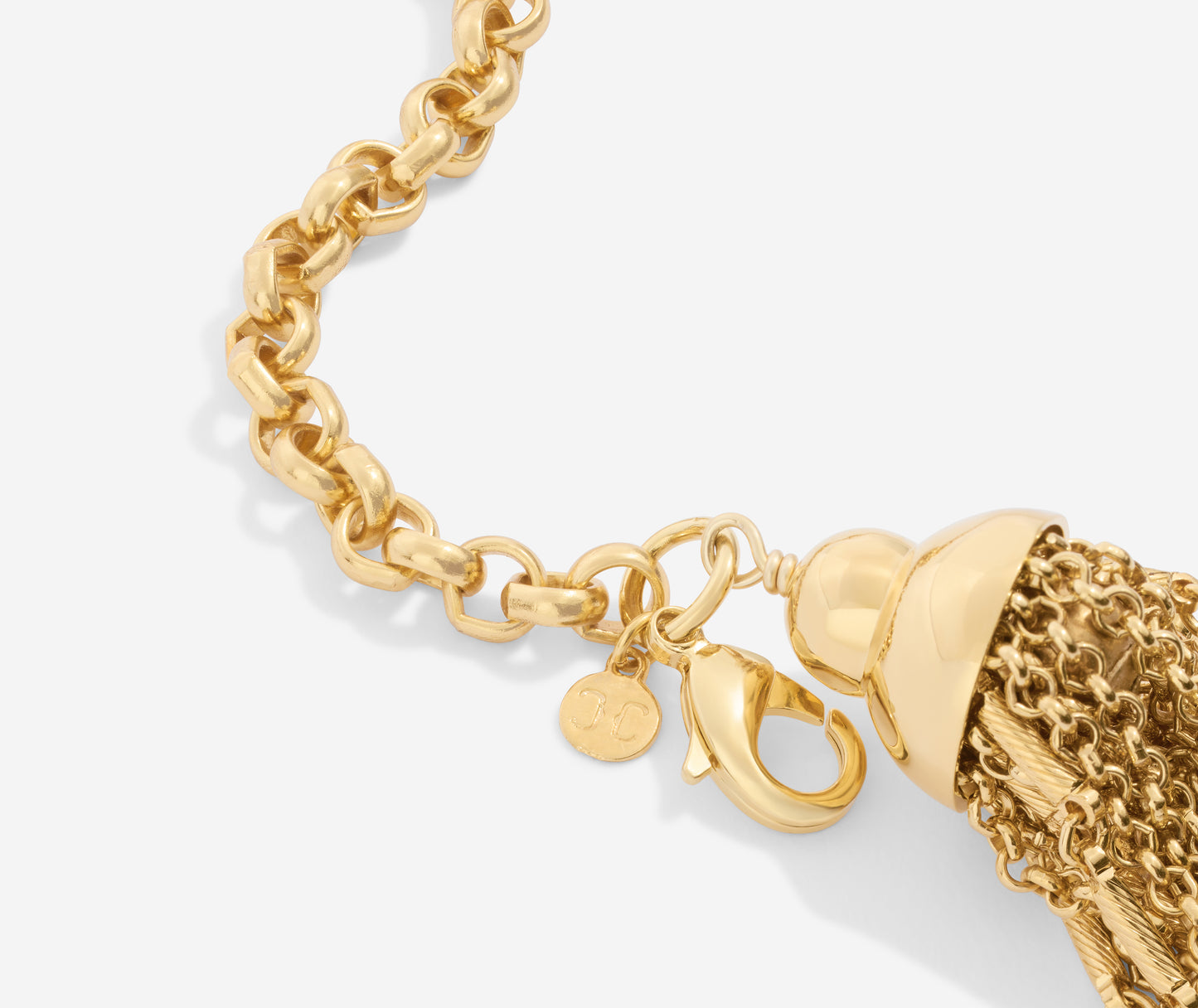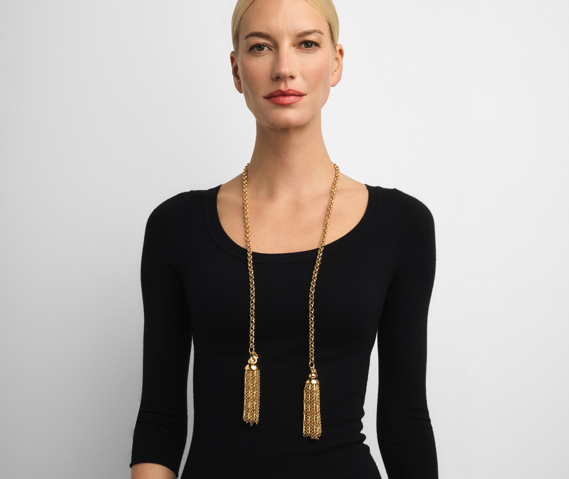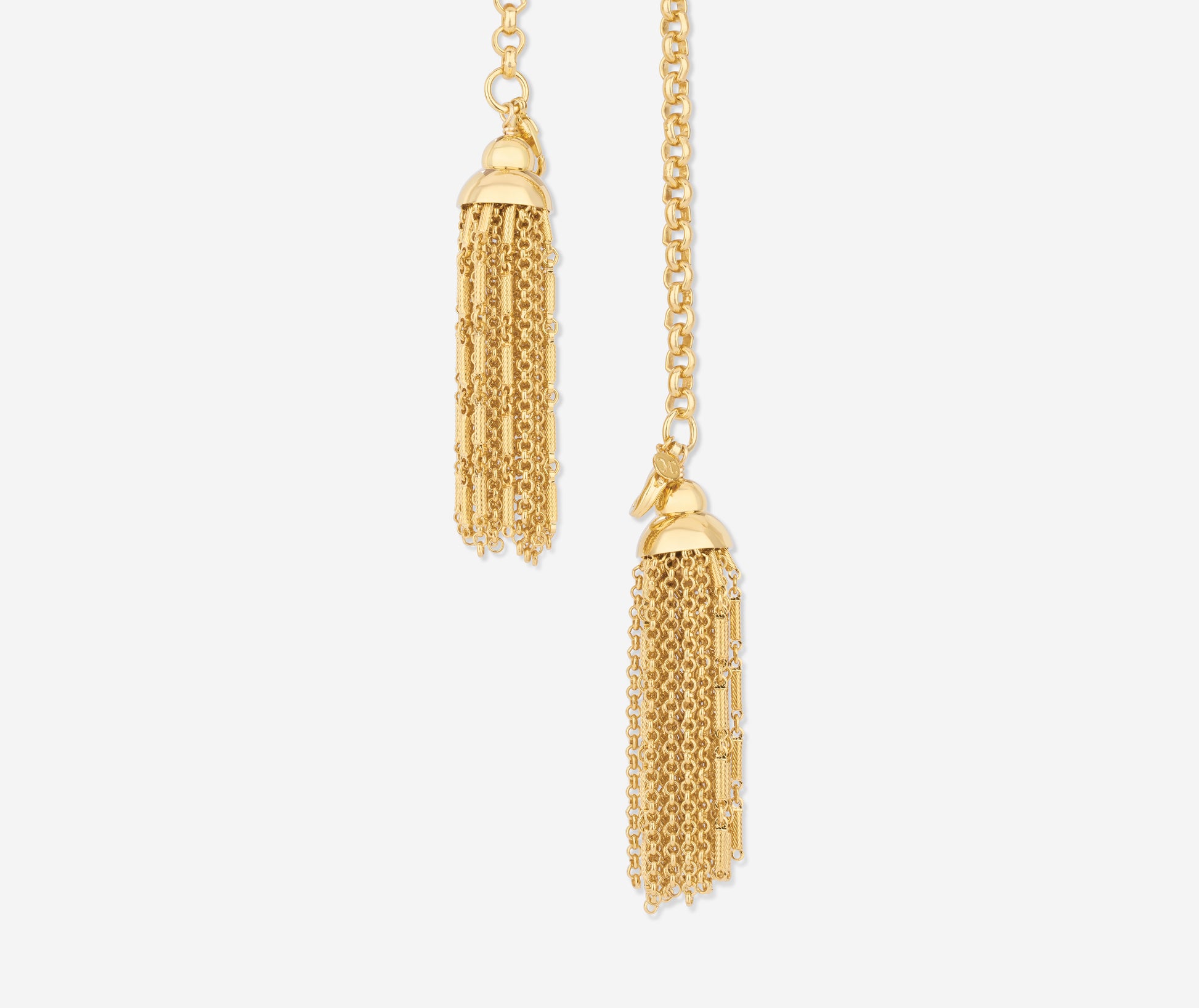 This lariat-style necklace drapes effortlessly atop any top, as the tassels weigh down the open ends for an effortlessly cool look. It can also be worn as hip jewelry or as a handbag chain.
