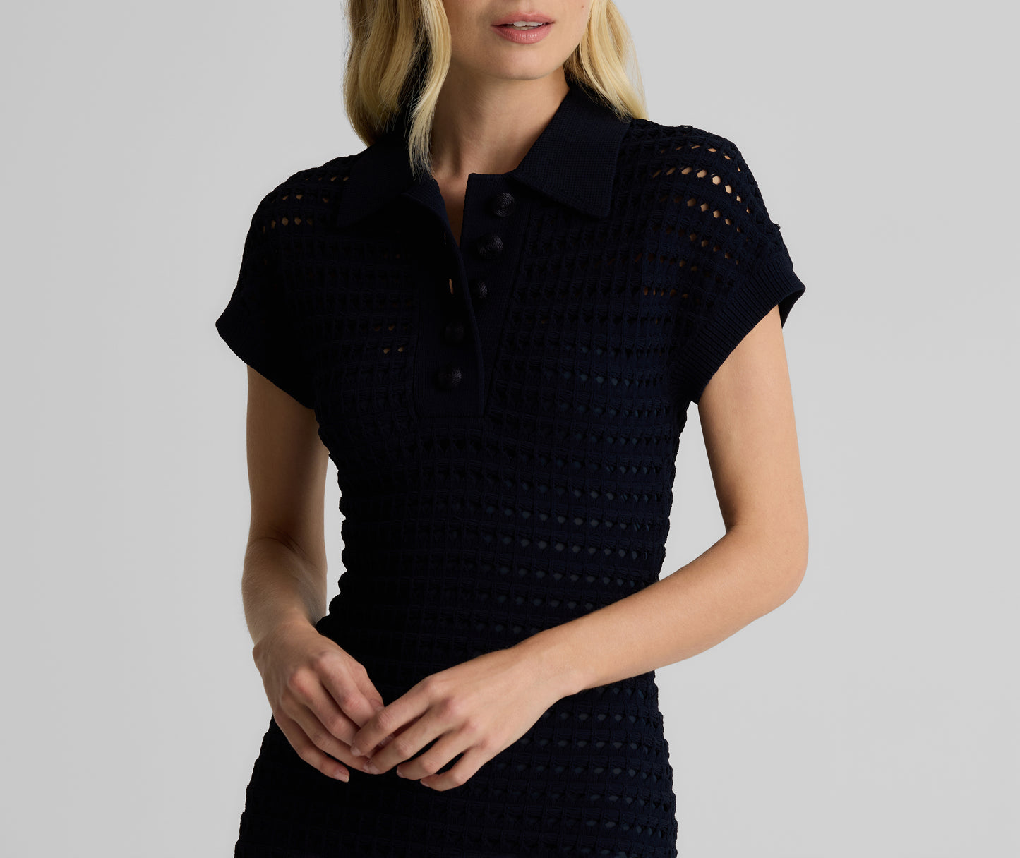 Our textured, airy Pointelle Knits gives the Casey its subtly vintage appeal. Complete with coordinating decorative buttons and delicate cap sleeves, this reimagined polo dress feels fresh for the modern woman without losing its sense of nostalgia.