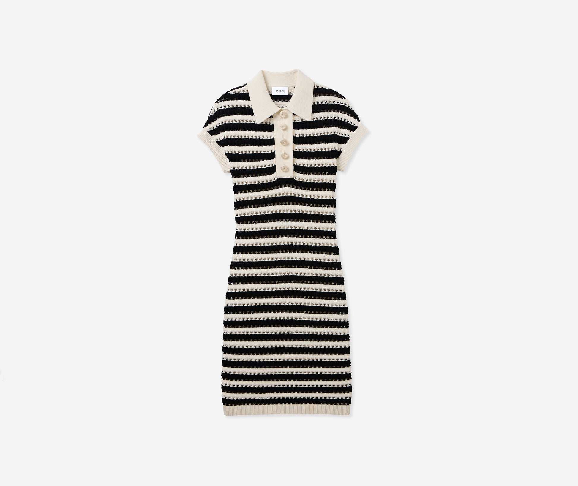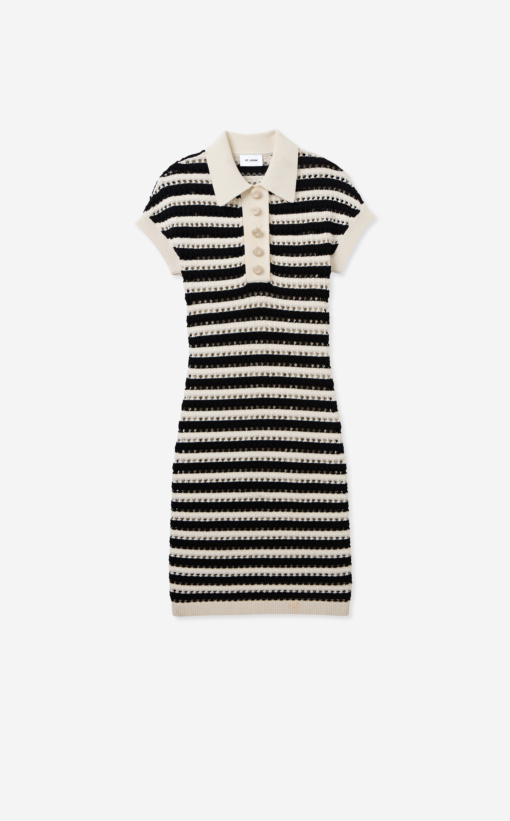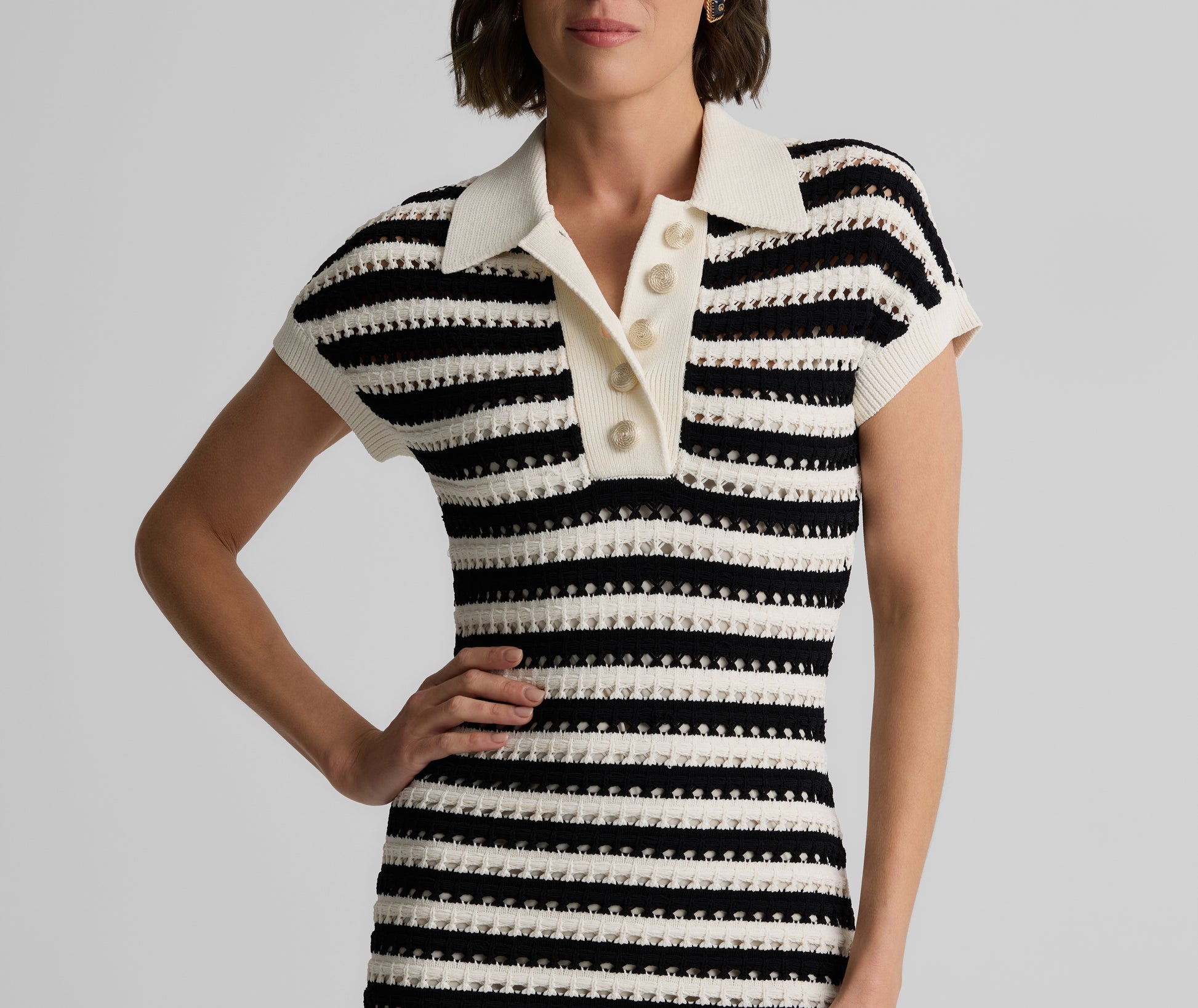 The Casey updates the classic polo silhouette with a modern twist. Crafted in our breezy Pointelle Knit in bold Ecru and Black stripes and finished with delicate cap sleeves and decorative fabric buttons, this figure flattering dress is subtly sporty, yet undeniably refined for luxurious luncheons and other afternoon outings with a chic, laid-back dress code.