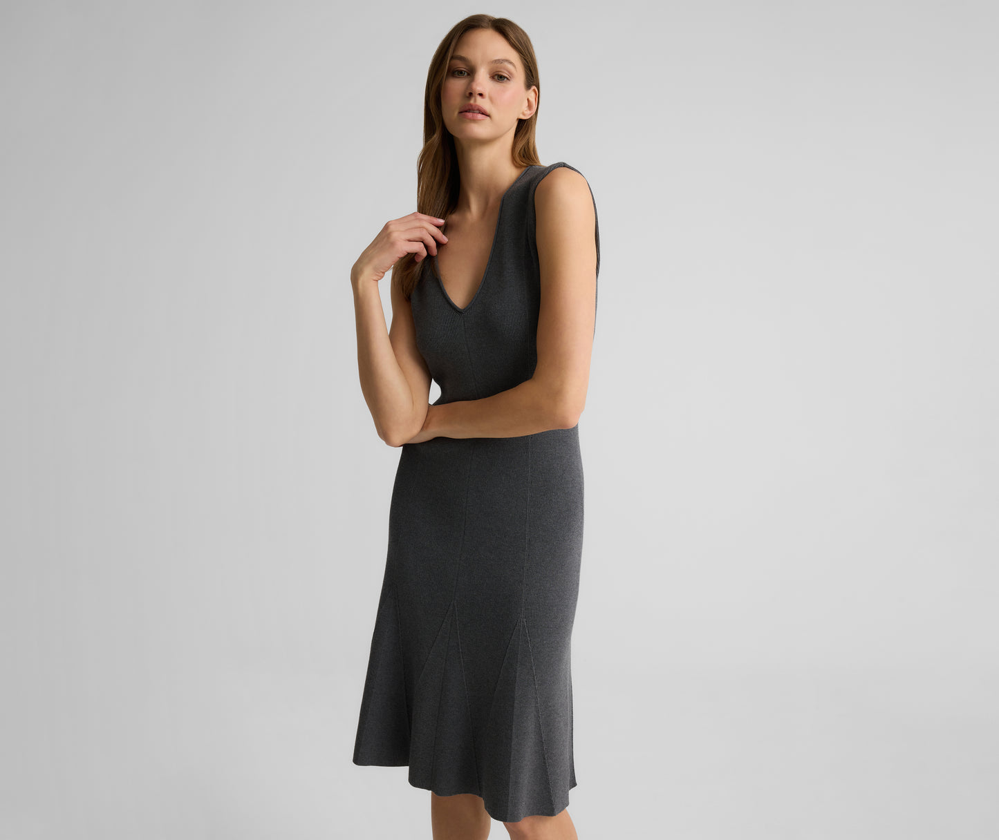 Crafted from curve-hugging Engineered Rib Knit, the Velma appeals to the modern minimalist while setting itself apart with standout details. This flattering knee-length dress features a deep V-neckline to create an elongated look while the godets give it a gentle flared shape. Worn on its own or paired with the Maura Jacket, it juxtaposes softness and strength for an updated take power dressing.