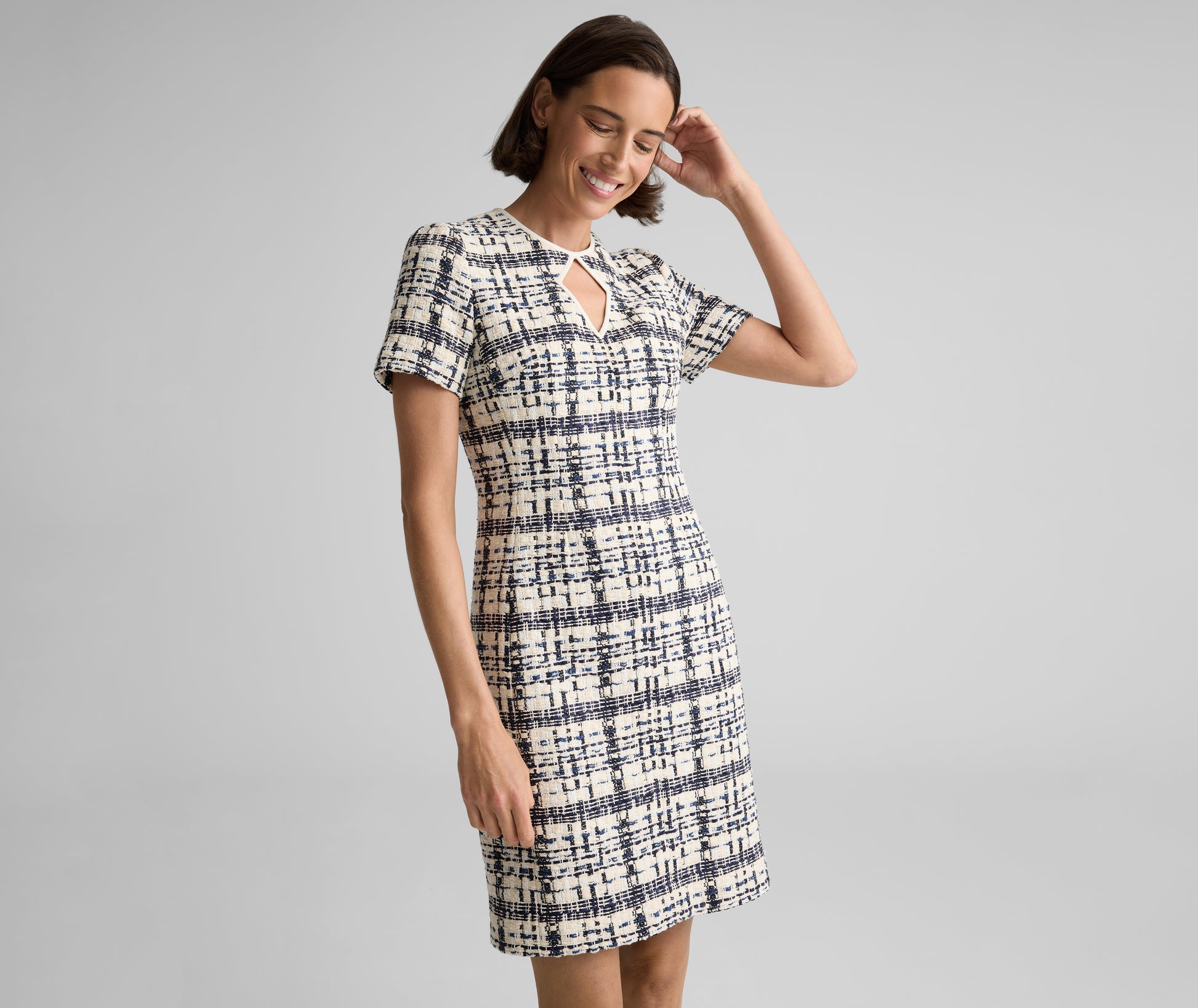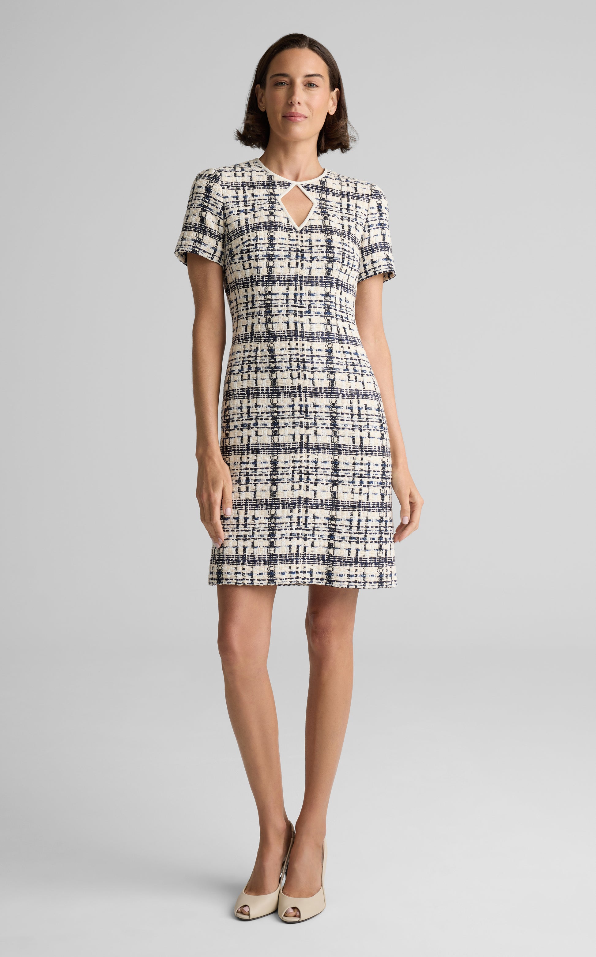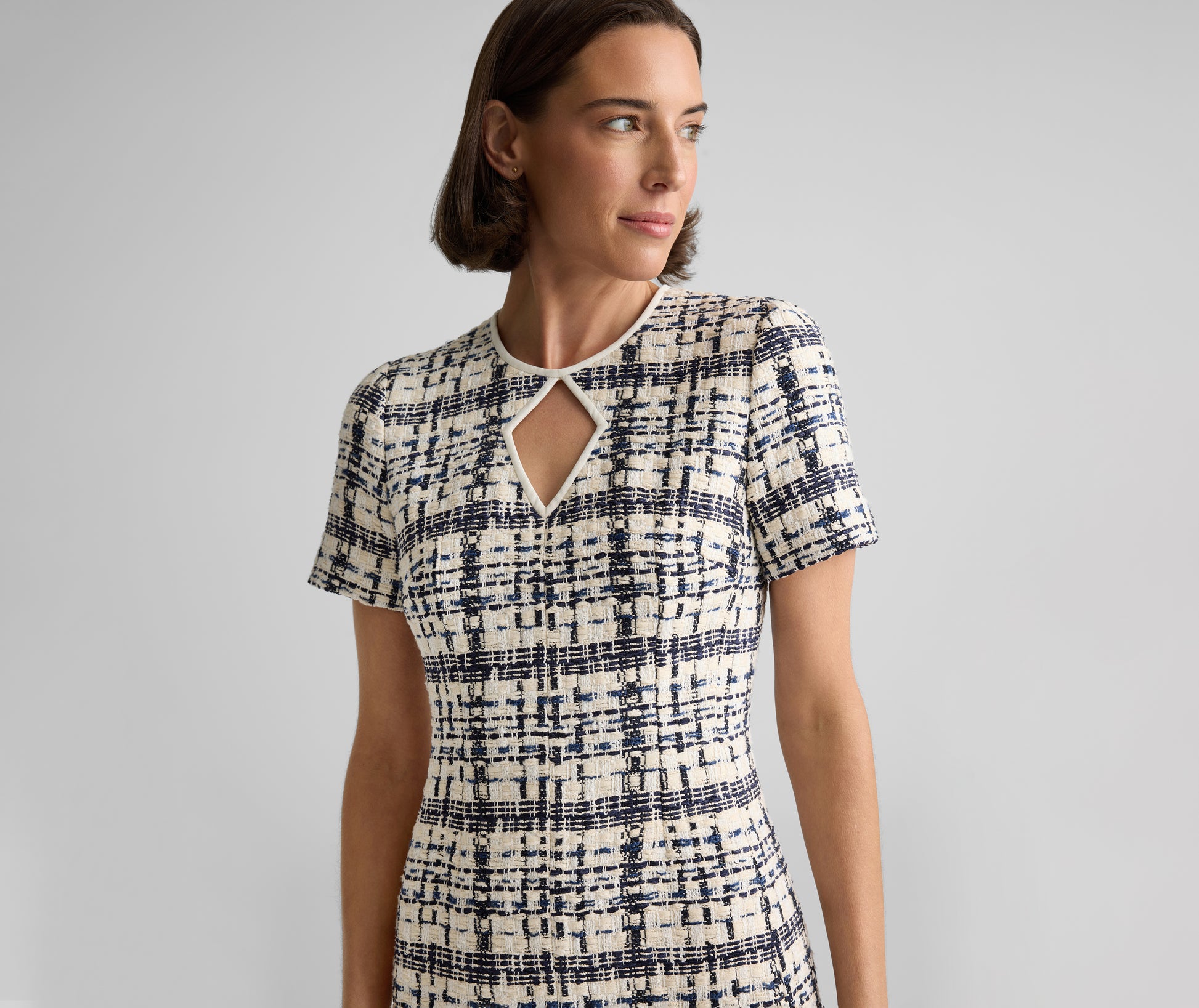 A study in timeless sophistication, the Emma brings a poised presence to every occasion. Made from St. Tropez Tweed—our take on Prince of Wales plaid—and accented with a diamond keyhole neckline, this chic sheath balances versatility with refinement; pair with the coordinating Amara Jacket for added polish or a boyfriend cardigan for a more relaxed look.