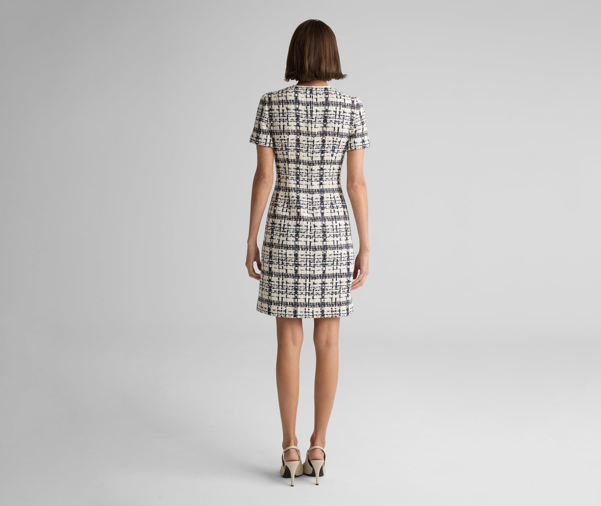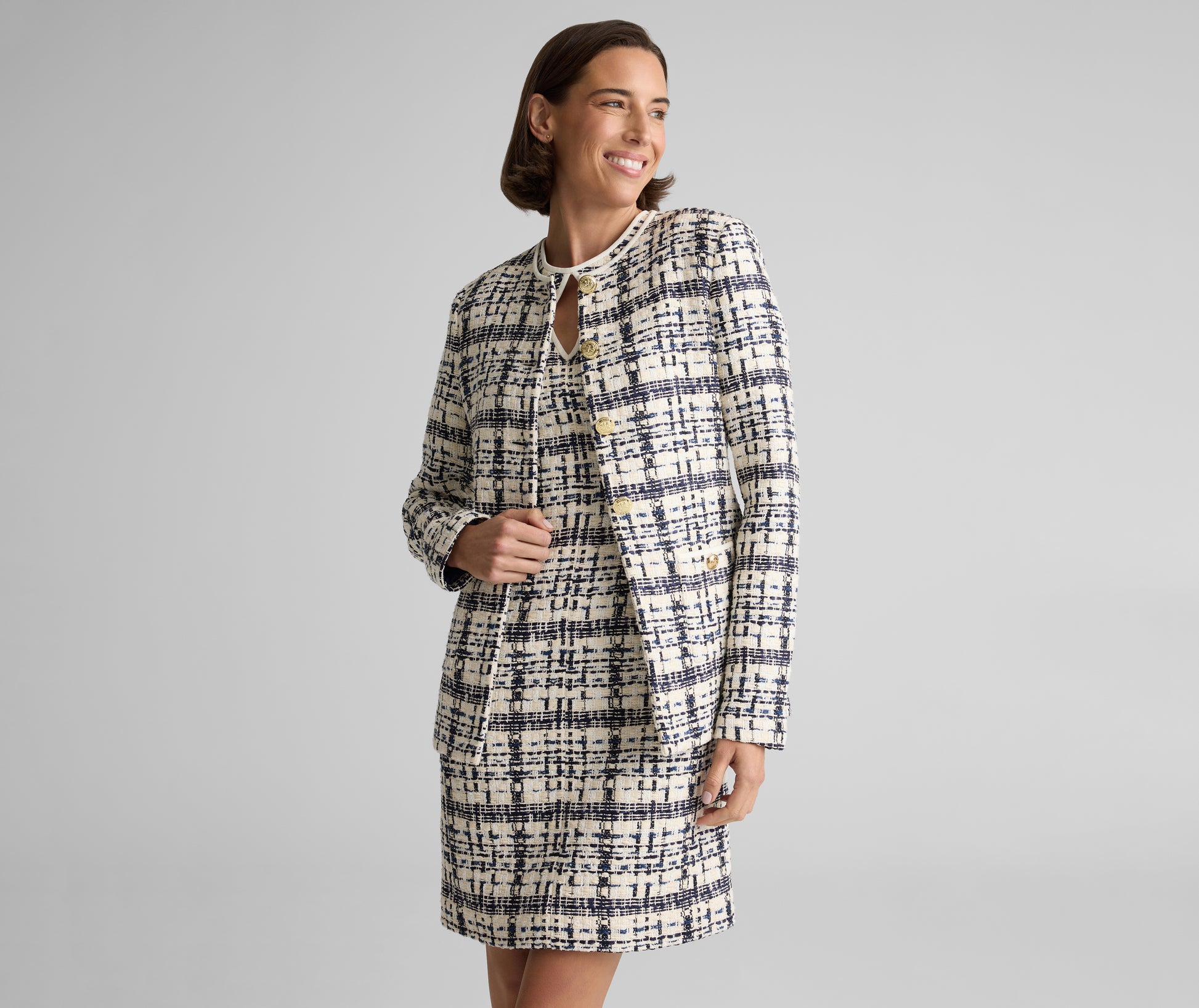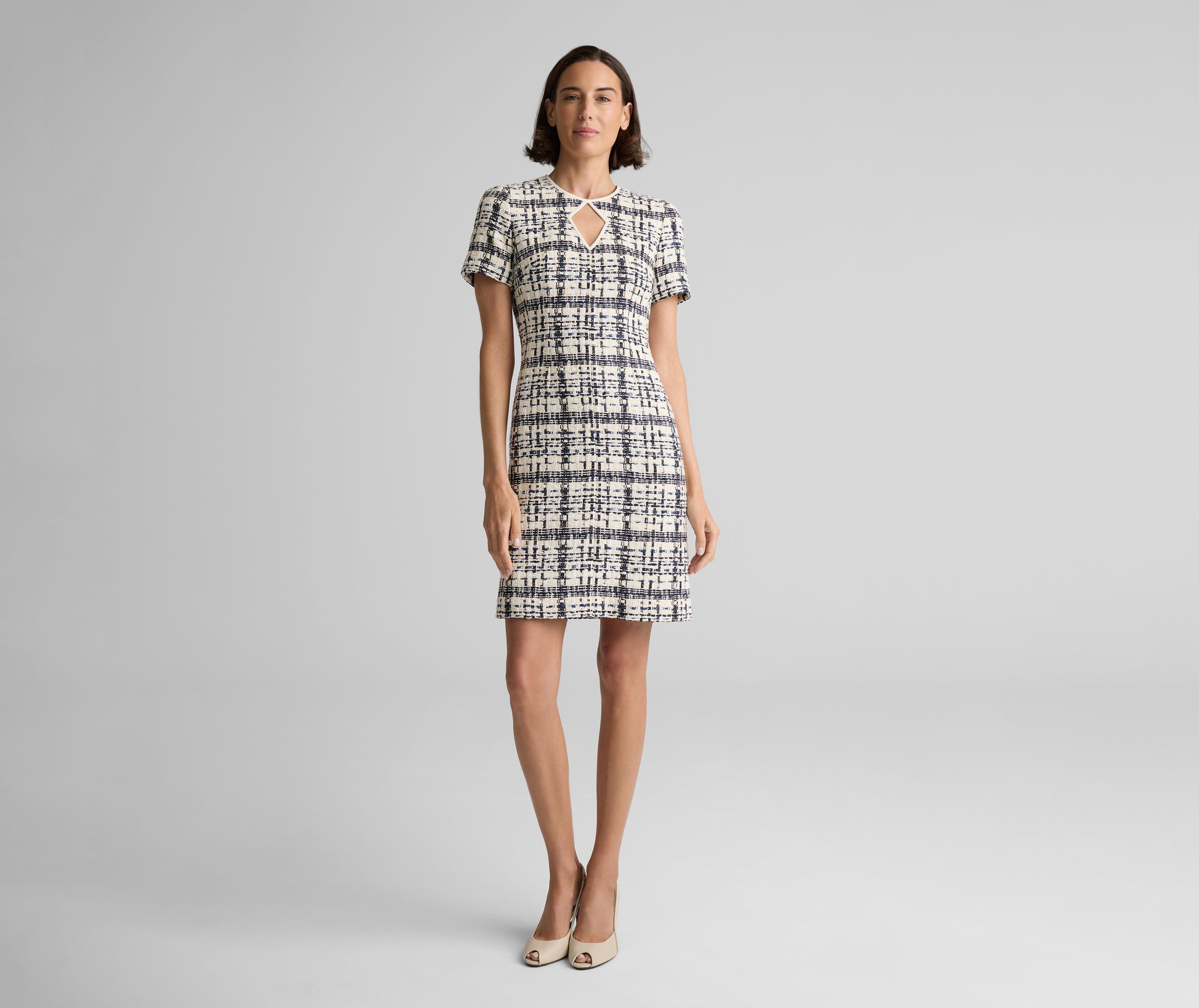 A study in timeless sophistication, the Emma brings a poised presence to every occasion. Made from St. Tropez Tweed—our take on Prince of Wales plaid—and accented with a diamond keyhole neckline, this chic sheath balances versatility with refinement; pair with the coordinating Amara Jacket for added polish or a boyfriend cardigan for a more relaxed look.