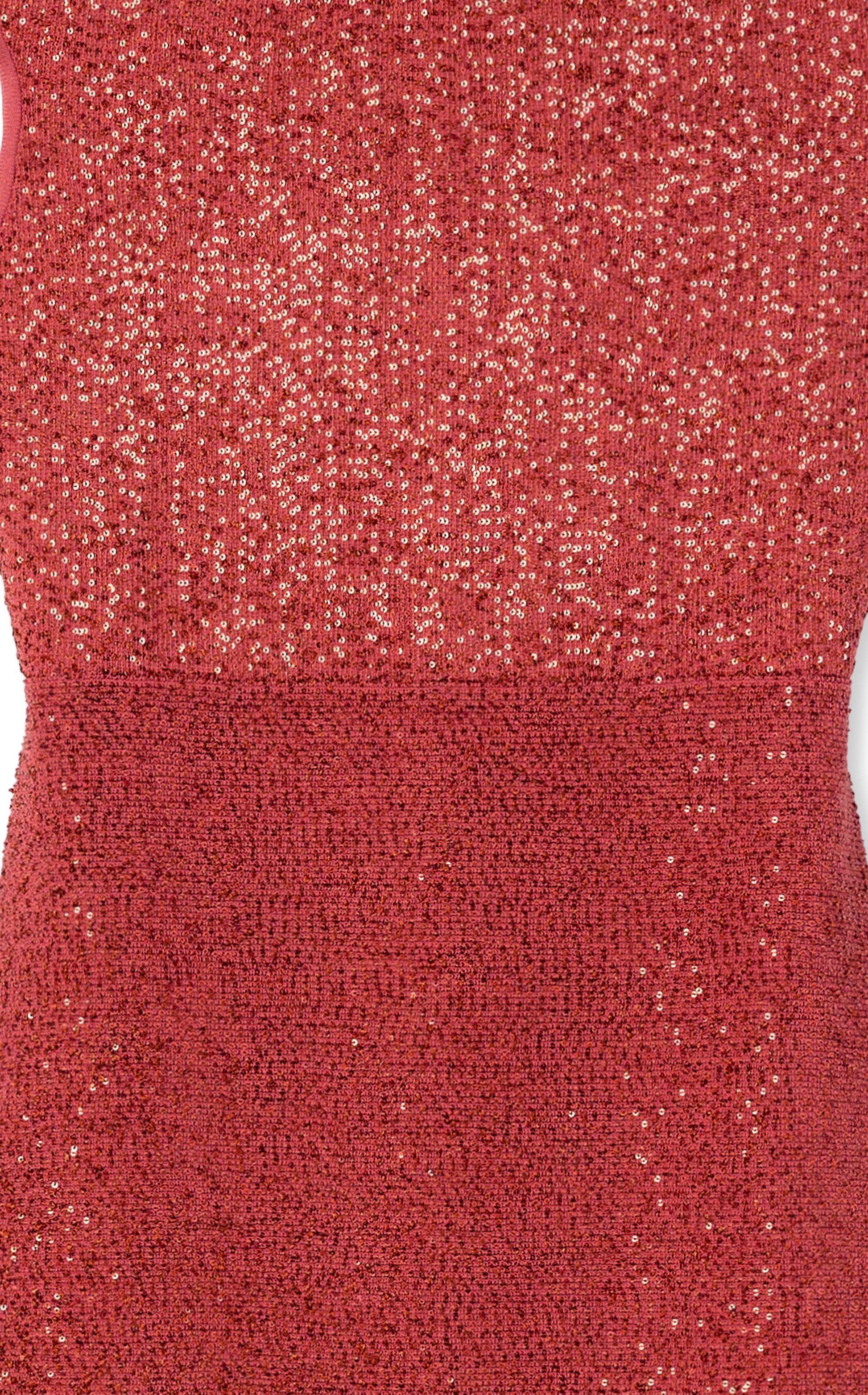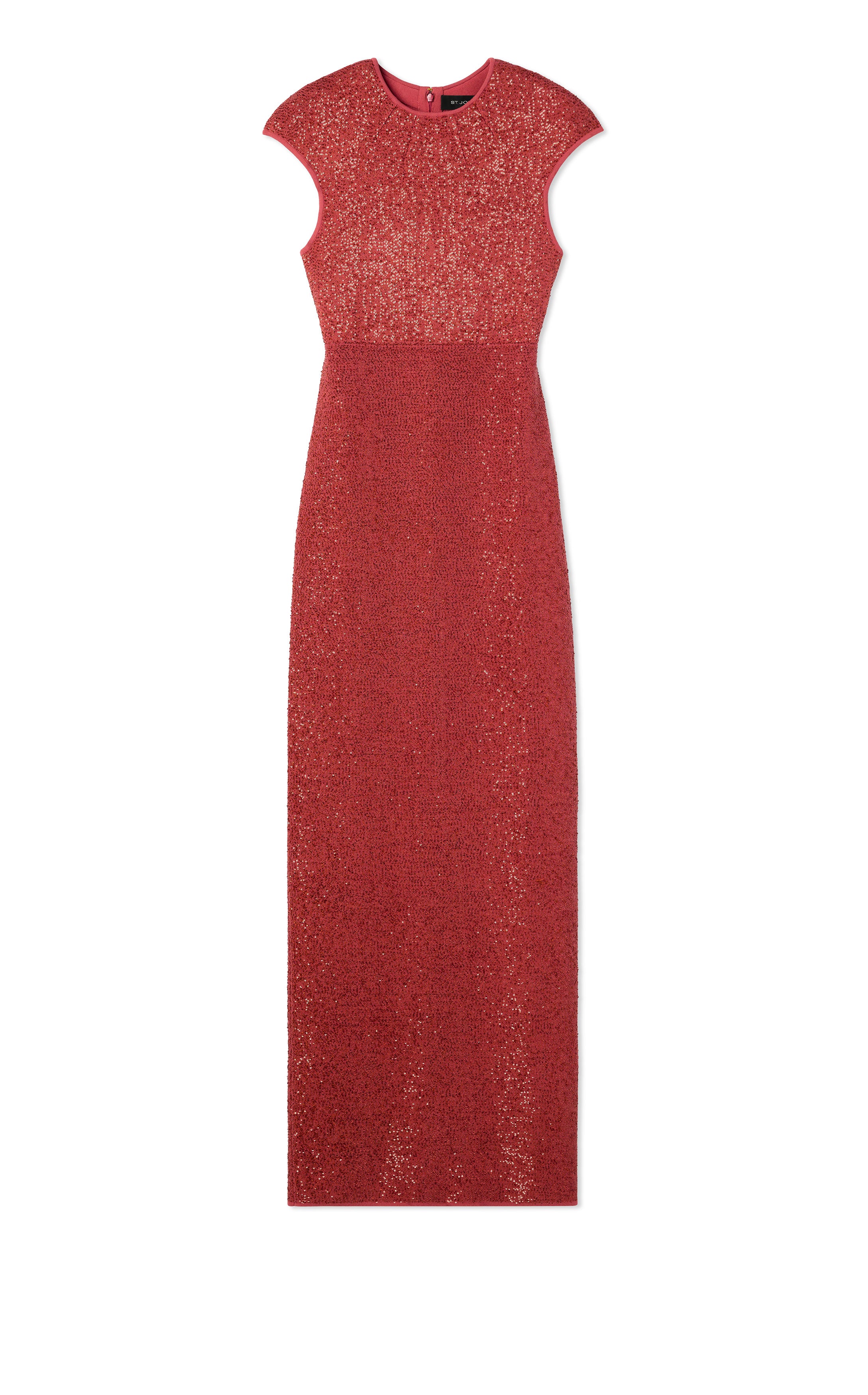 An effortless statement of glamour, this gown is crafted in stretch sequin knit that catches the light with every movement. The sleek silhouette is defined by a high round neckline, sculpted cap sleeves, and a floor-length finish, balancing modern simplicity with radiant allure. Perfect for evening occasions, it offers both elegance and ease with a subtle stretch that enhances the fit.