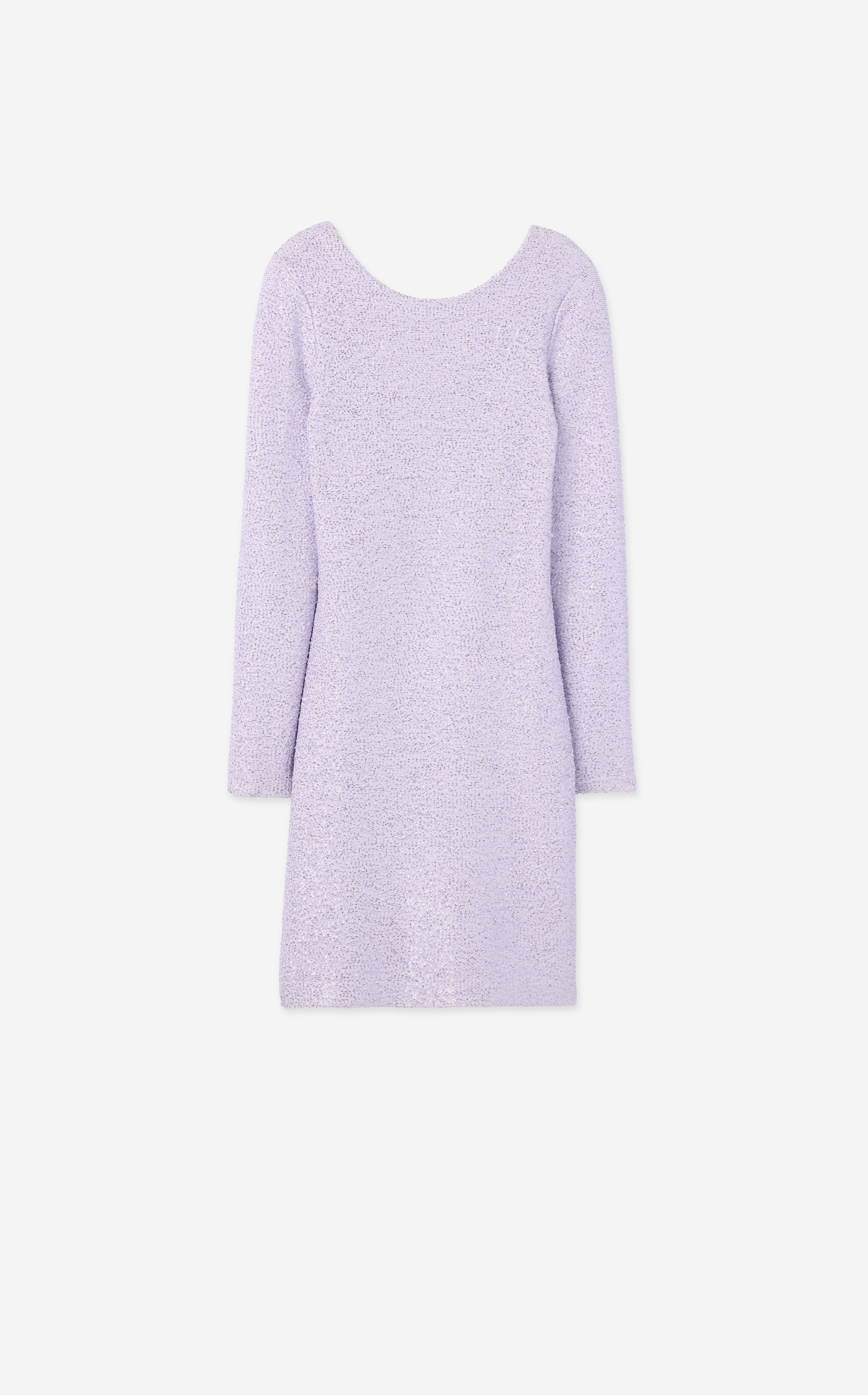 Stretch sequin knit shapes this long sleeve, straight cut short dress that adds sparkle to a classic for evening, as a scoop back adds 360-degree appeal.