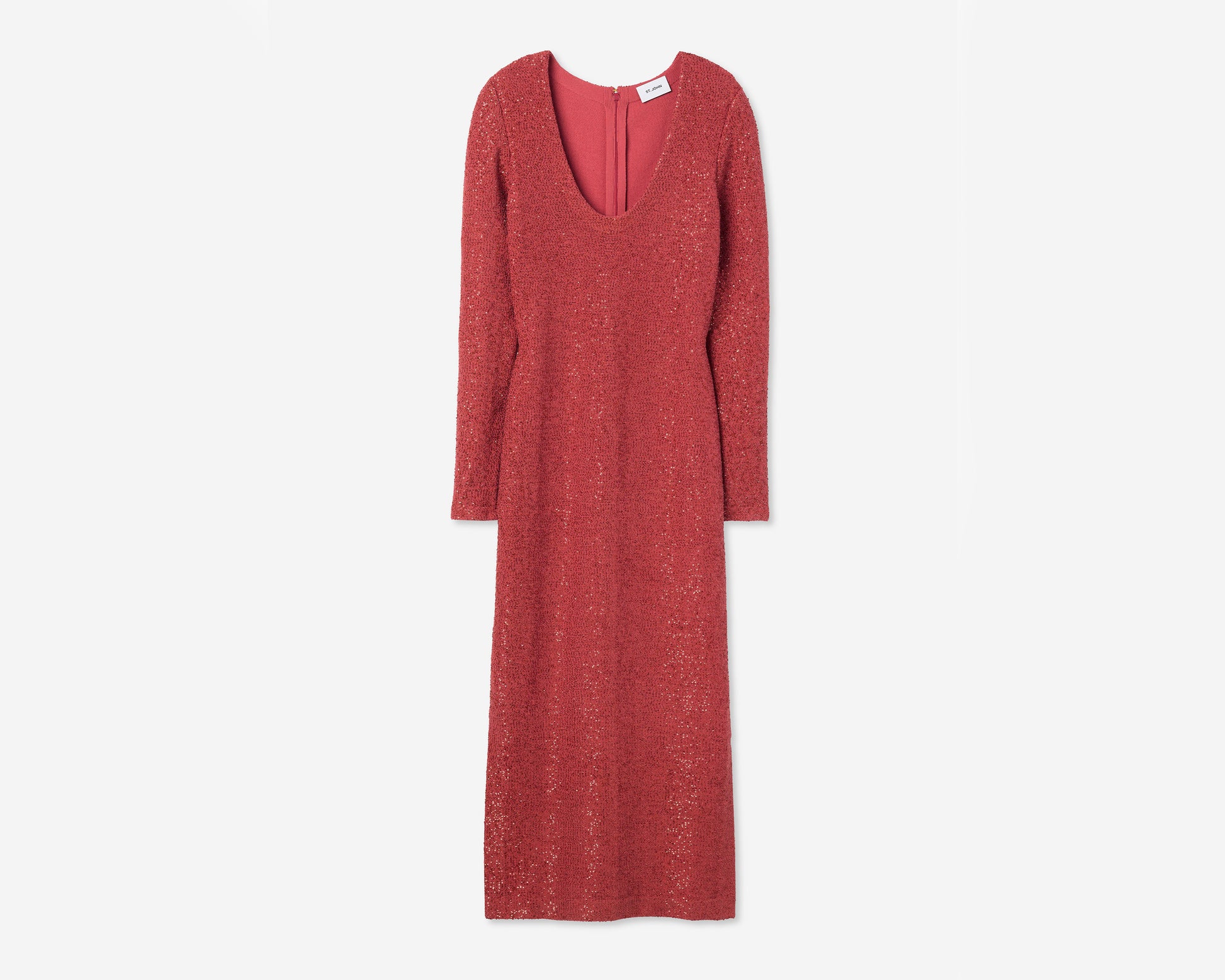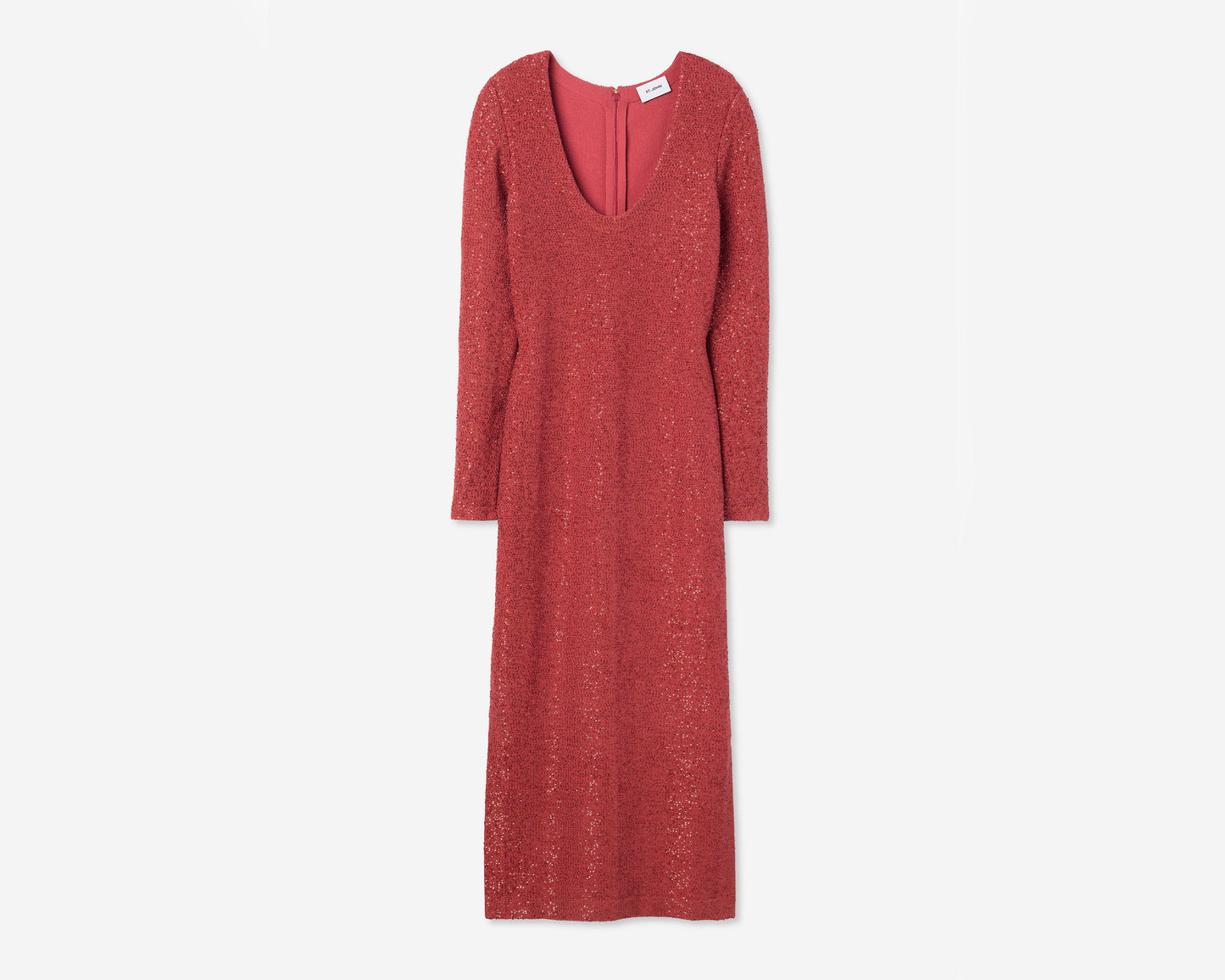 A perfect midi length elongates the figure in this stretch sequin knit long sleeve V-neck dress with dual side slits.