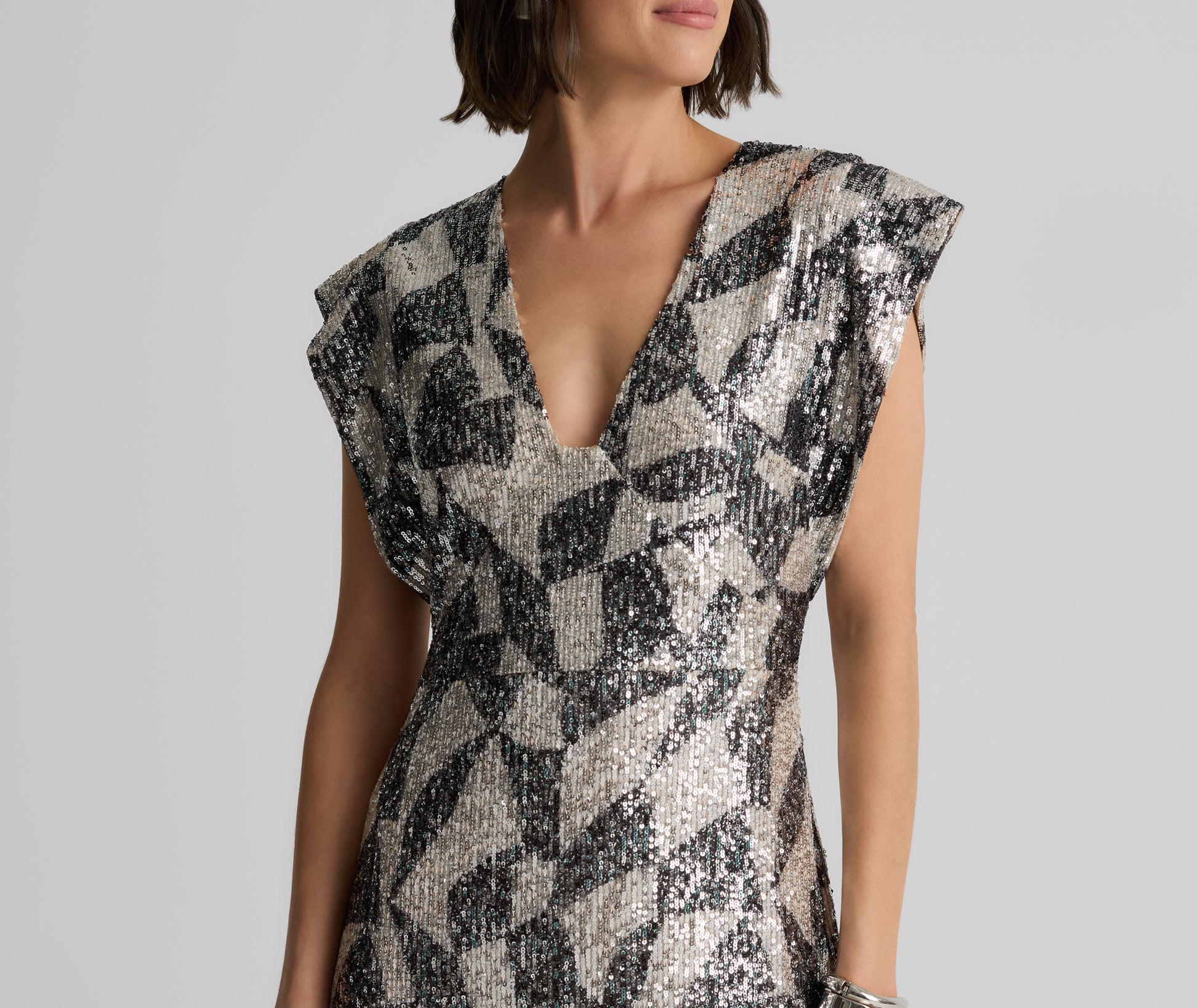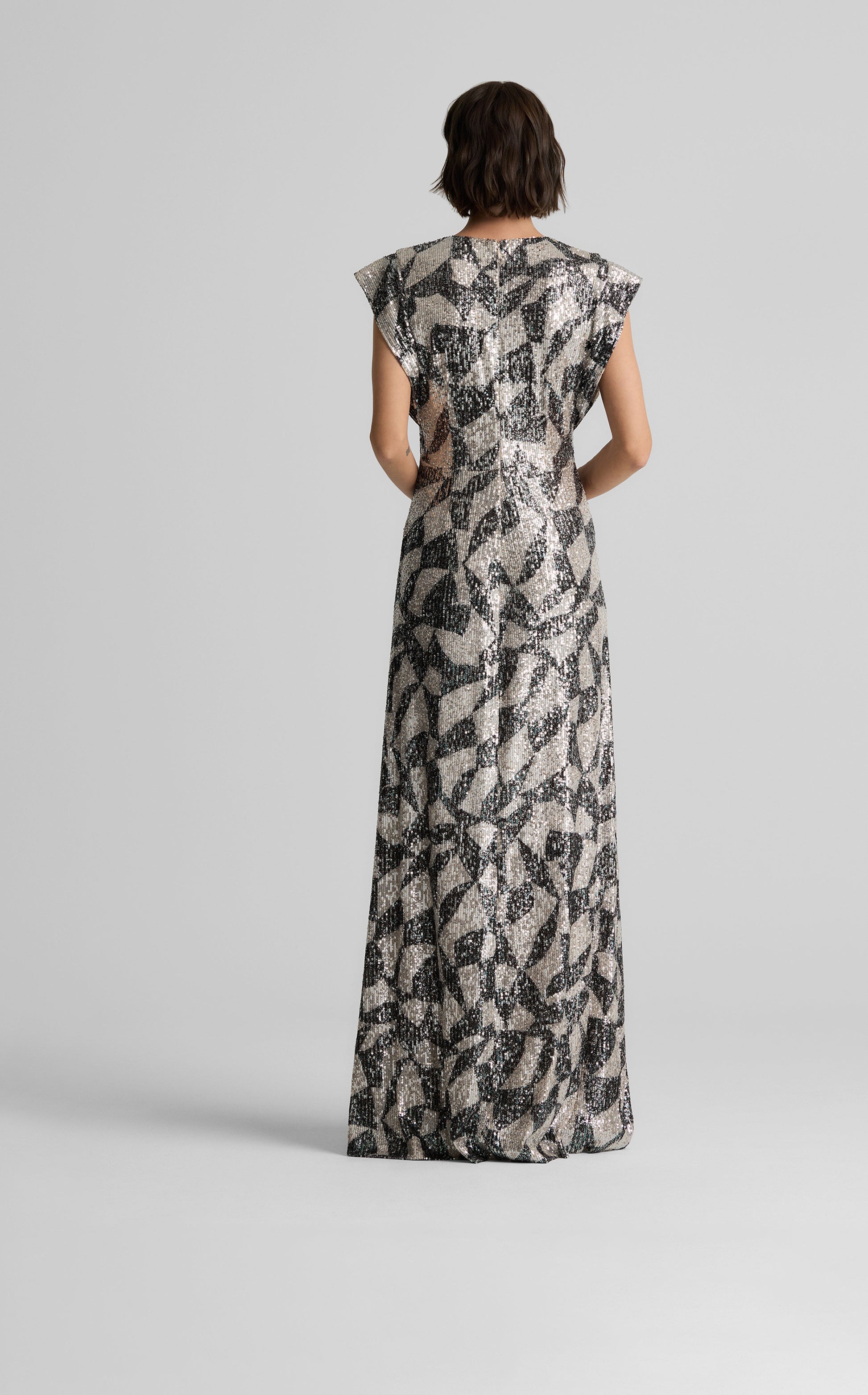 The London juxtaposes bold geometry and high-impact glamour for a fresh take on formal wear. From its dolman cap sleeves to its floor-skimming hemline, this head-turning gown is covered in shimmering paillettes to capture the light as it floats through the room with equal effortlessness and elegance.