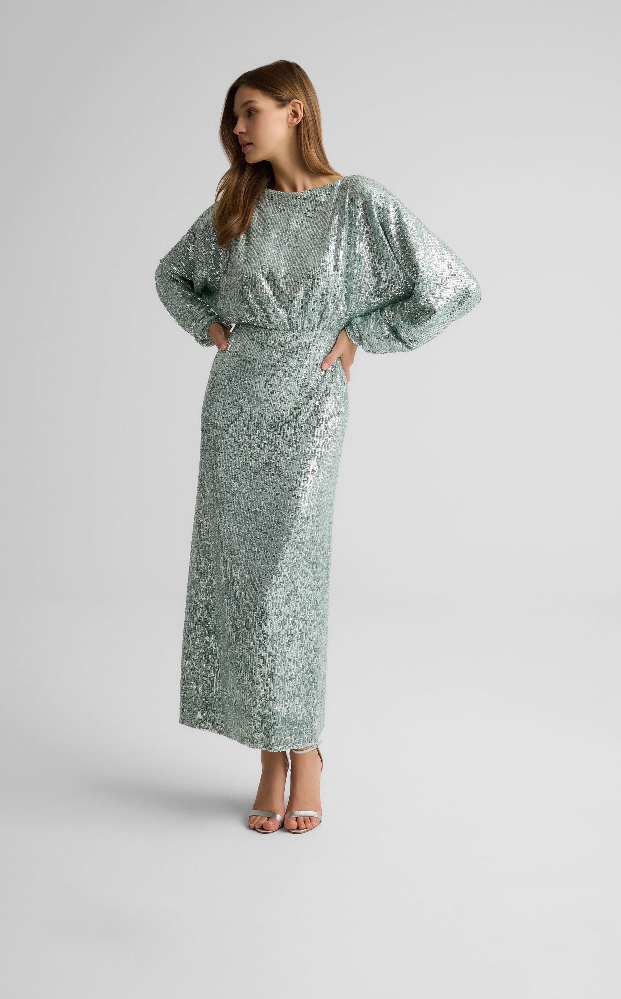 Radiant and refined, the Emmy was designed to take the spotlight. Stretch paillette offers maximum shine as well as ease of movement, while the open back is a restrained yet dramatic reveal that gives this gown its elegant appeal.