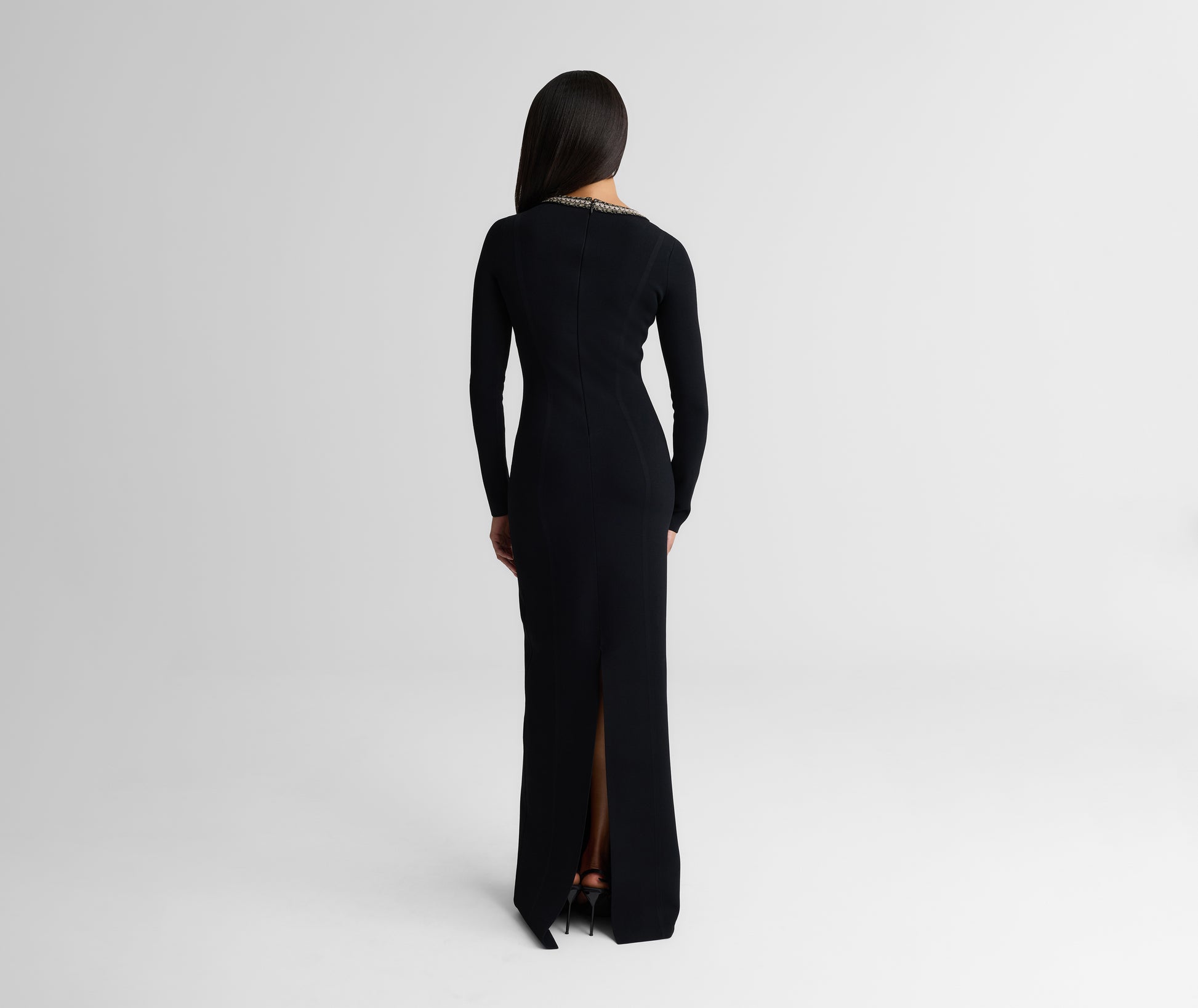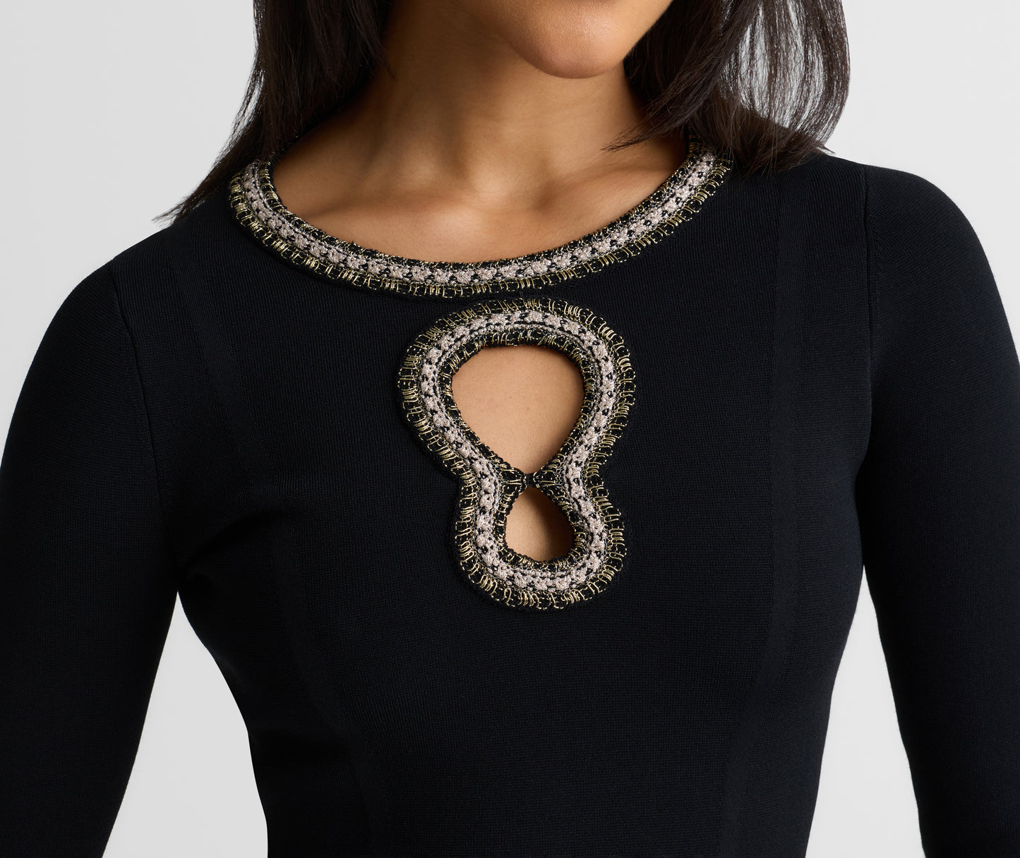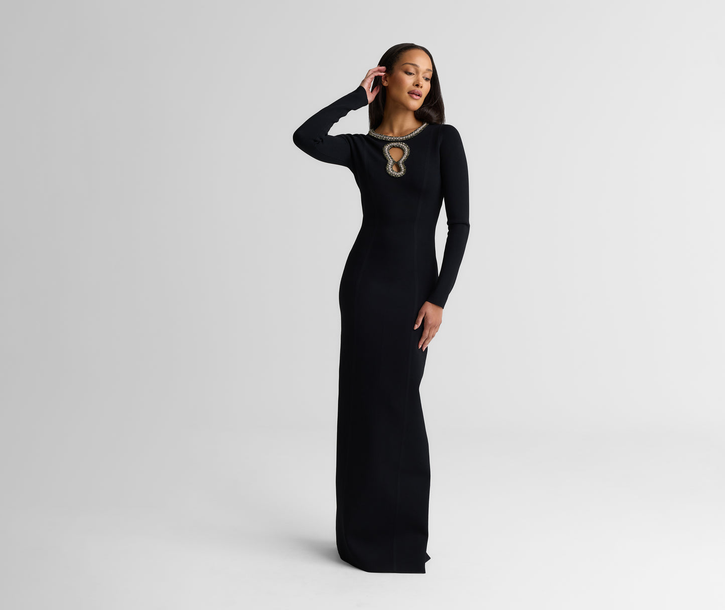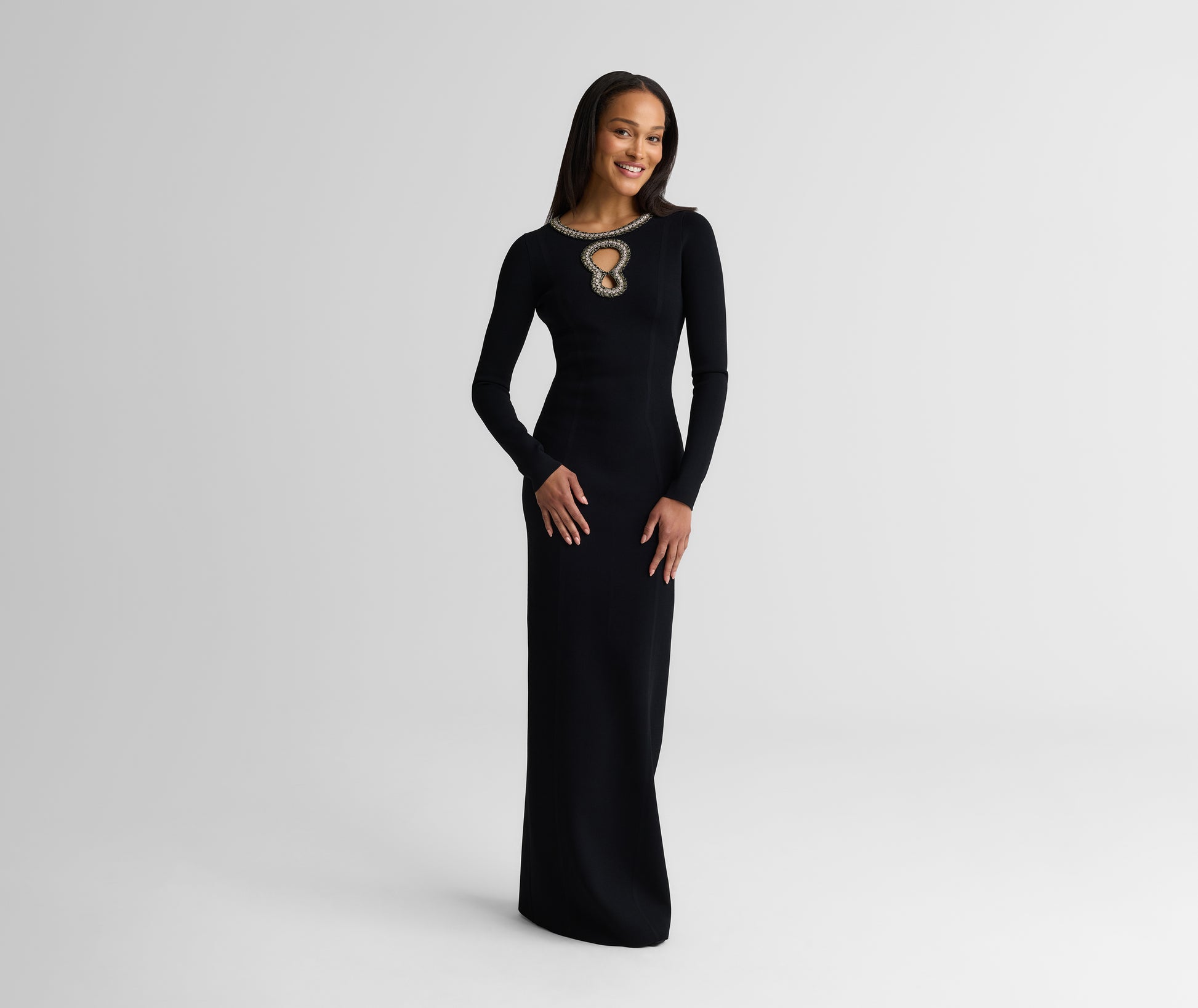 An archival design revived with modern details, the Alina represents quintessential St. John style. Signature Santa Roma Knit gives this dynamic gown its ease of wear, while a keyhole neckline with dazzling trim offers instant icon status.