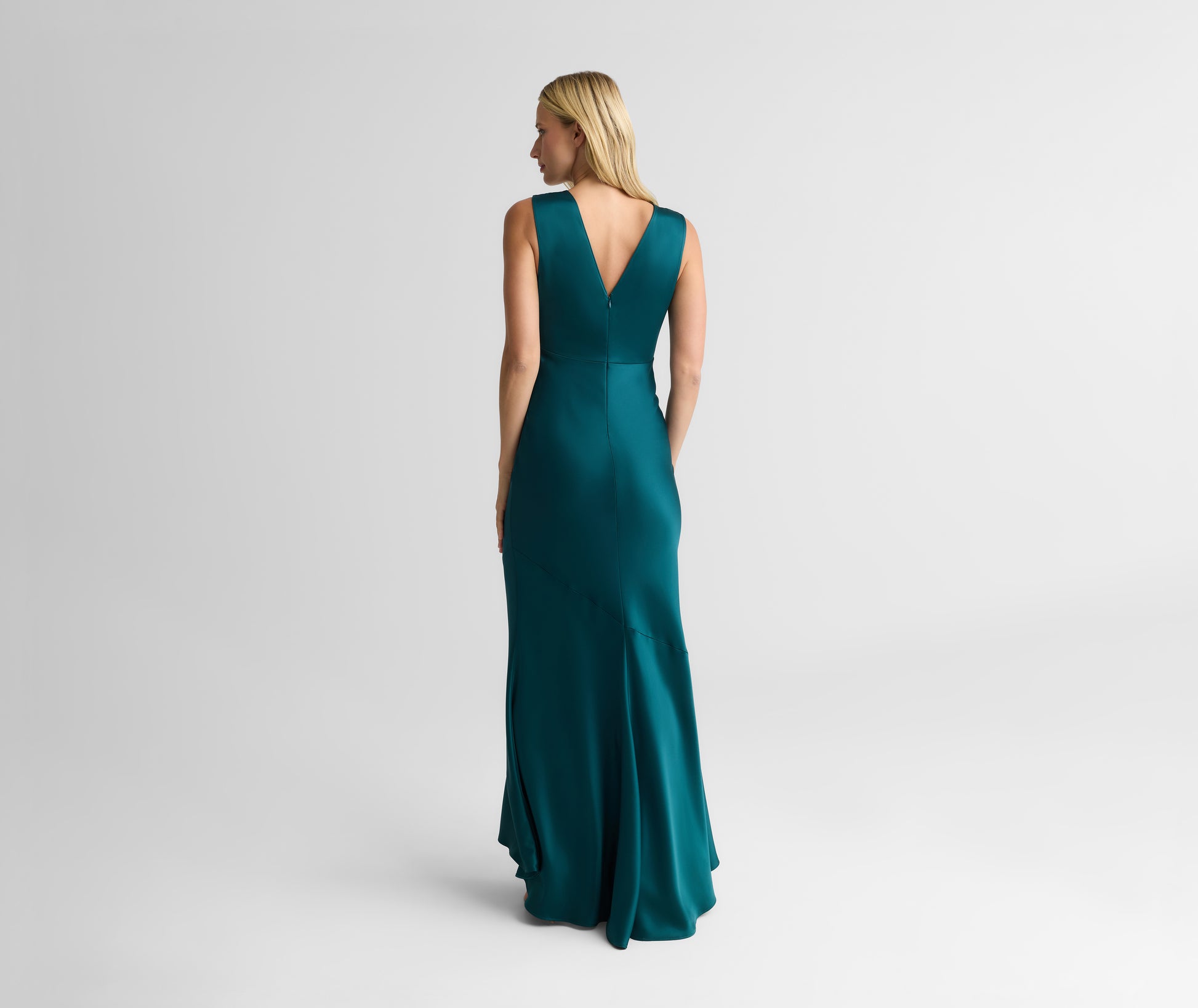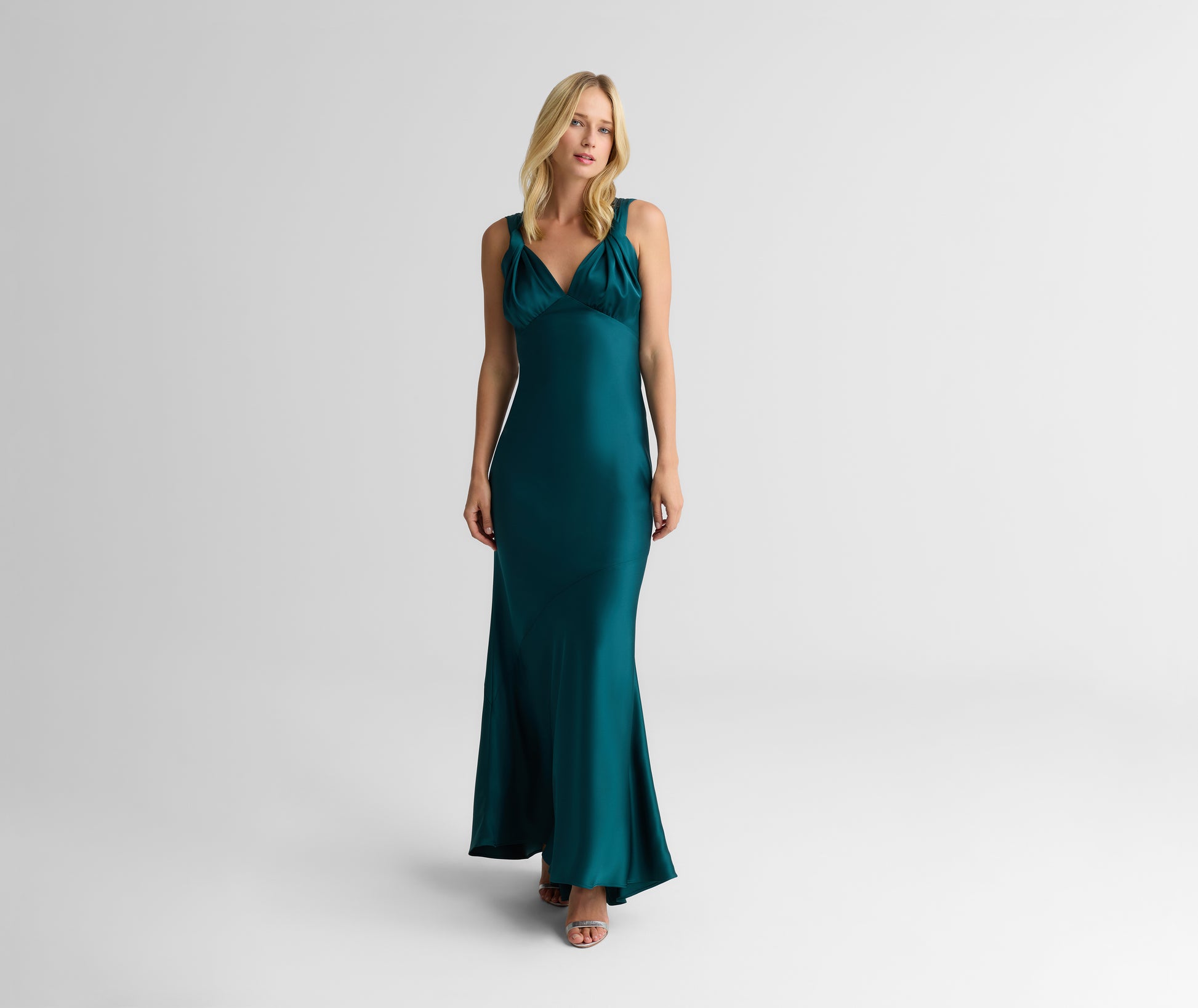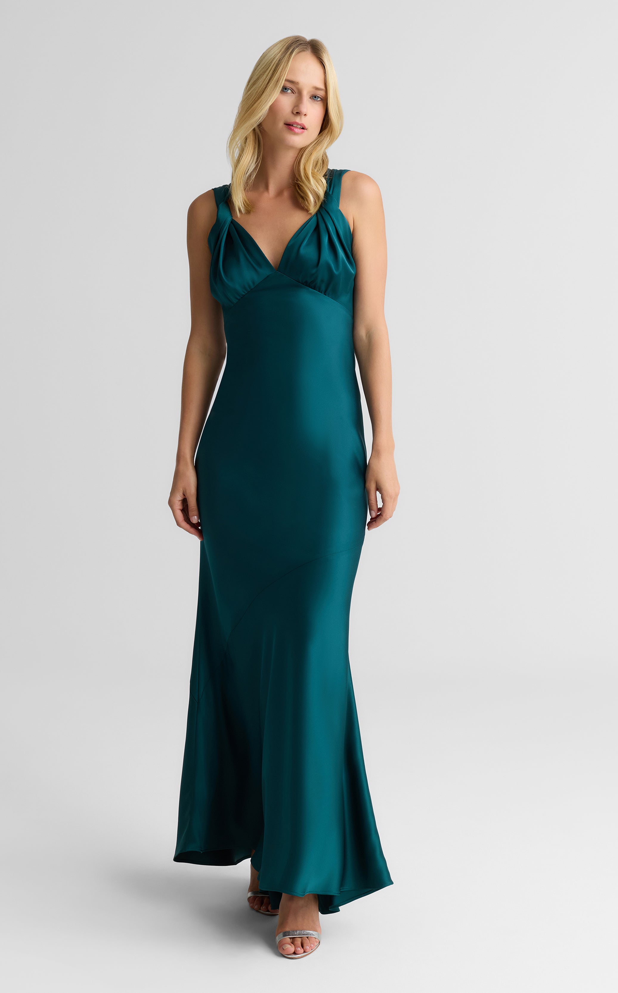 Minimalist yet striking, the Wendy moves with luxurious sophistication in every step. This timeless silhouette cut from bias cut liquid satin is elevated with a plunging neckline tied strap detail for added intrigue.