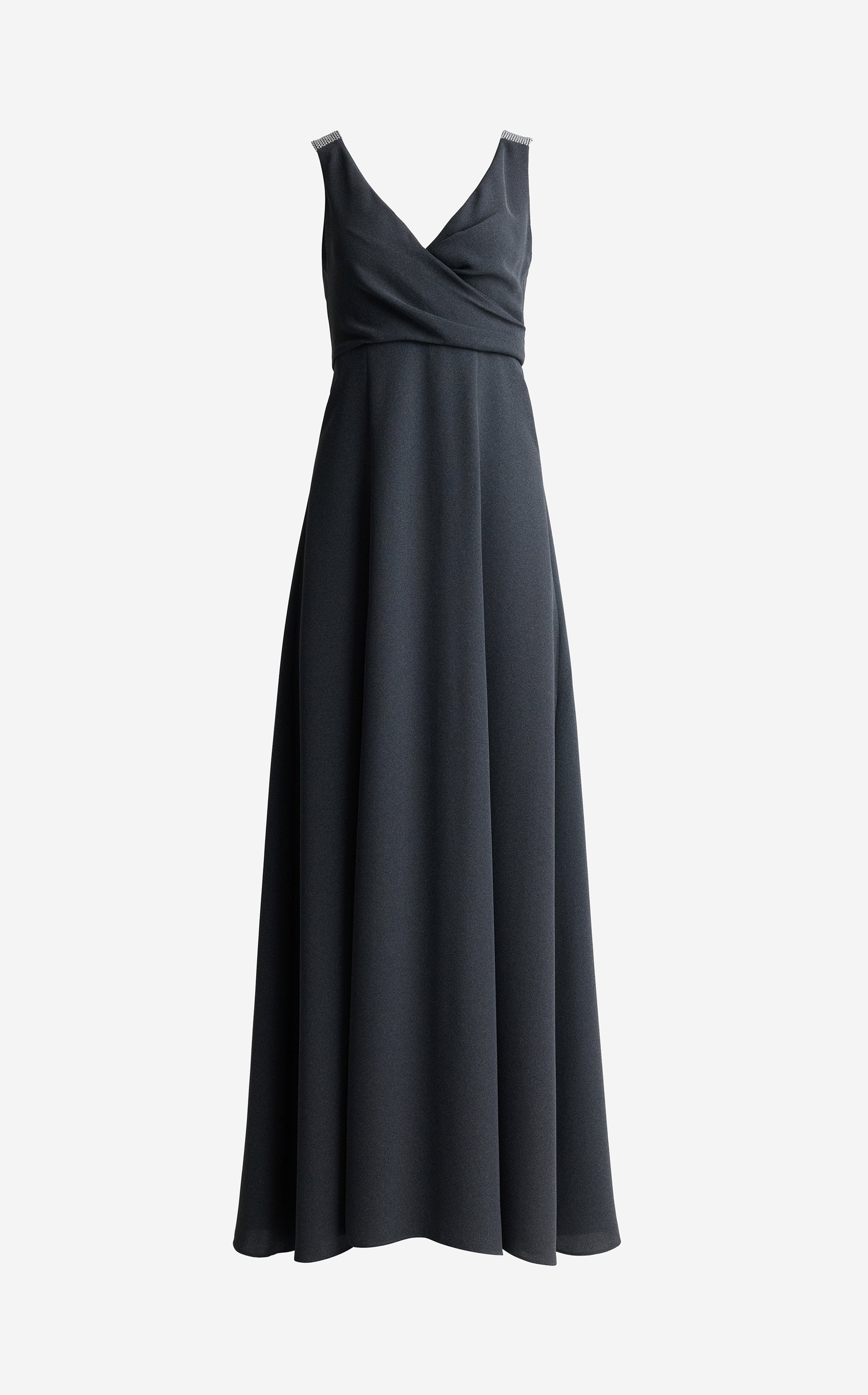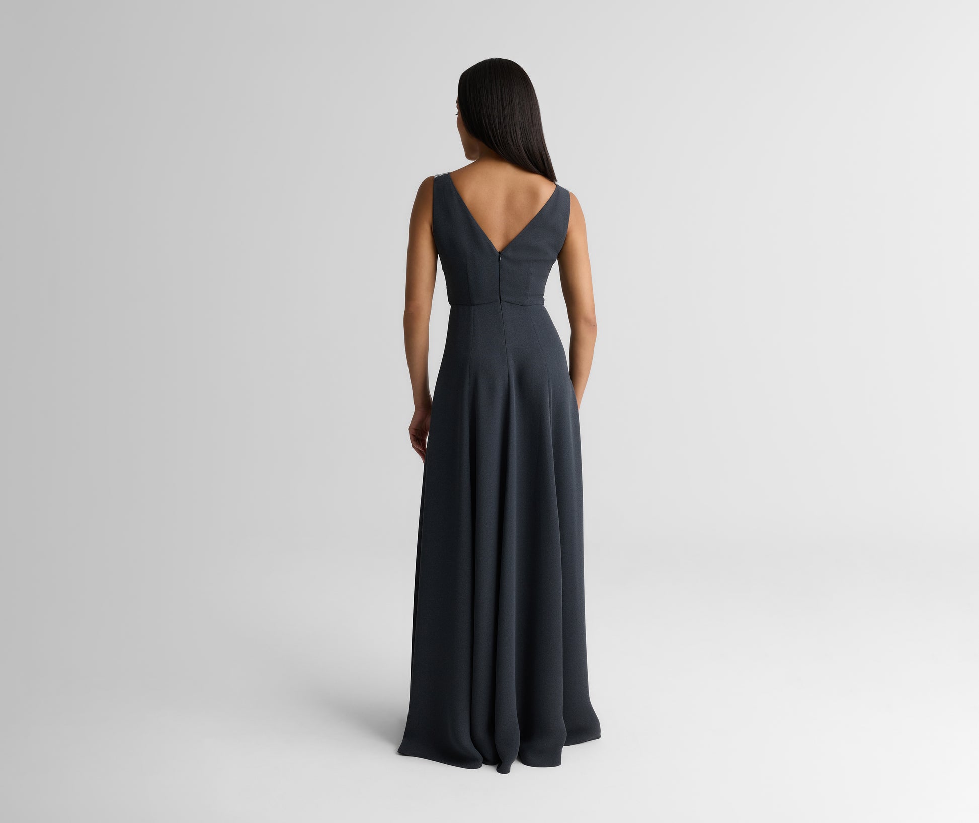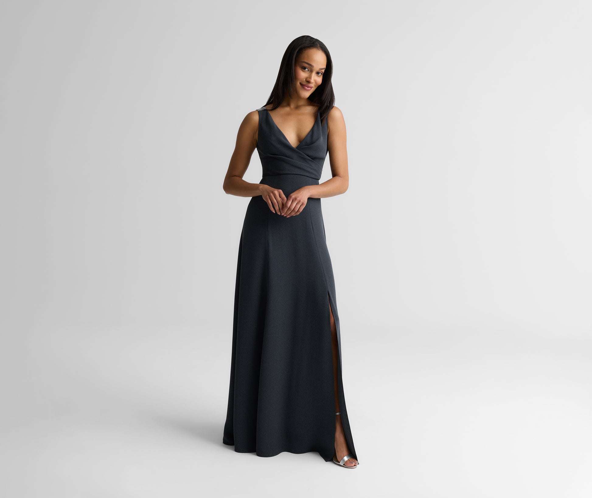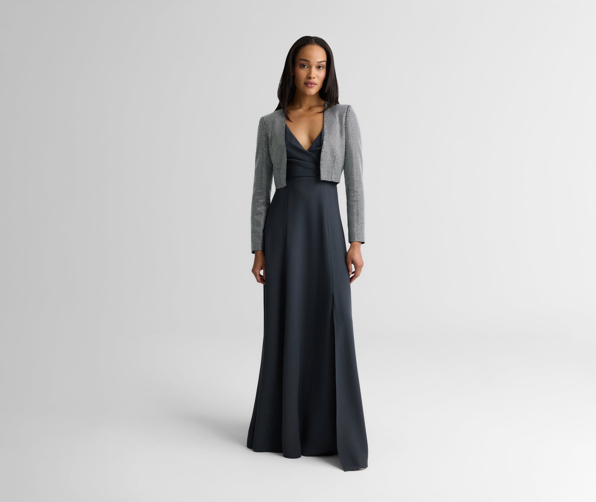 For a chic alternative to the classic little black dress, the Tess elevates a minimalist silhouette through standout details. Fluid crepe and princess panels give this gown a softly structured shape that’s incredibly flattering while a front slit and pavé sequin shoulder detail amp up the glamour.