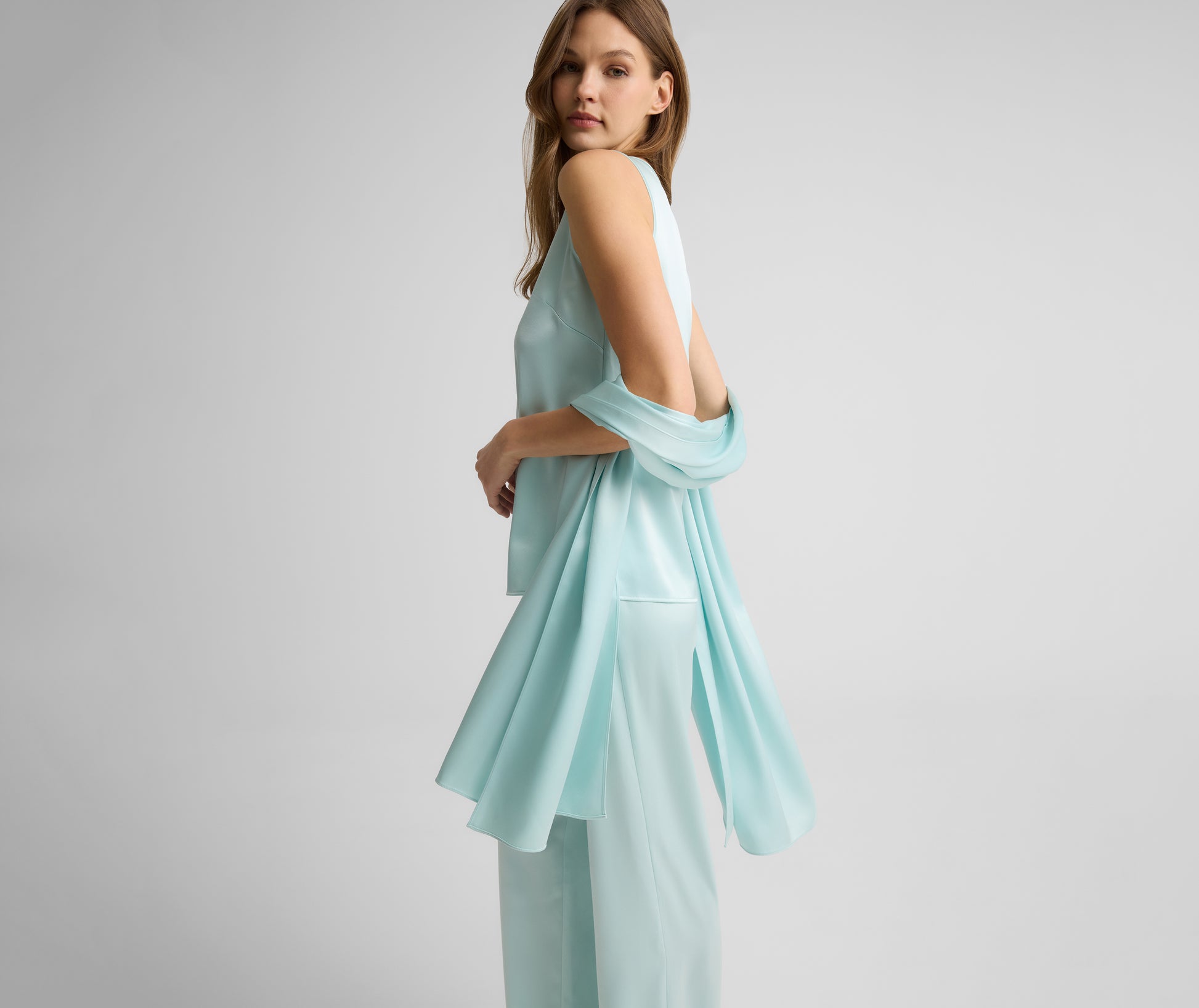 An essential yet luxurious layer for your evening attire, the Winslet is cut from sumptuous Liquid Silk in airy Aqua to drape gracefully across the body when you desire additional coverage. Wear this elegant wrap over a classically formal black dress as a pop of color, or pair with the Sara to create a chic coordinated moment.