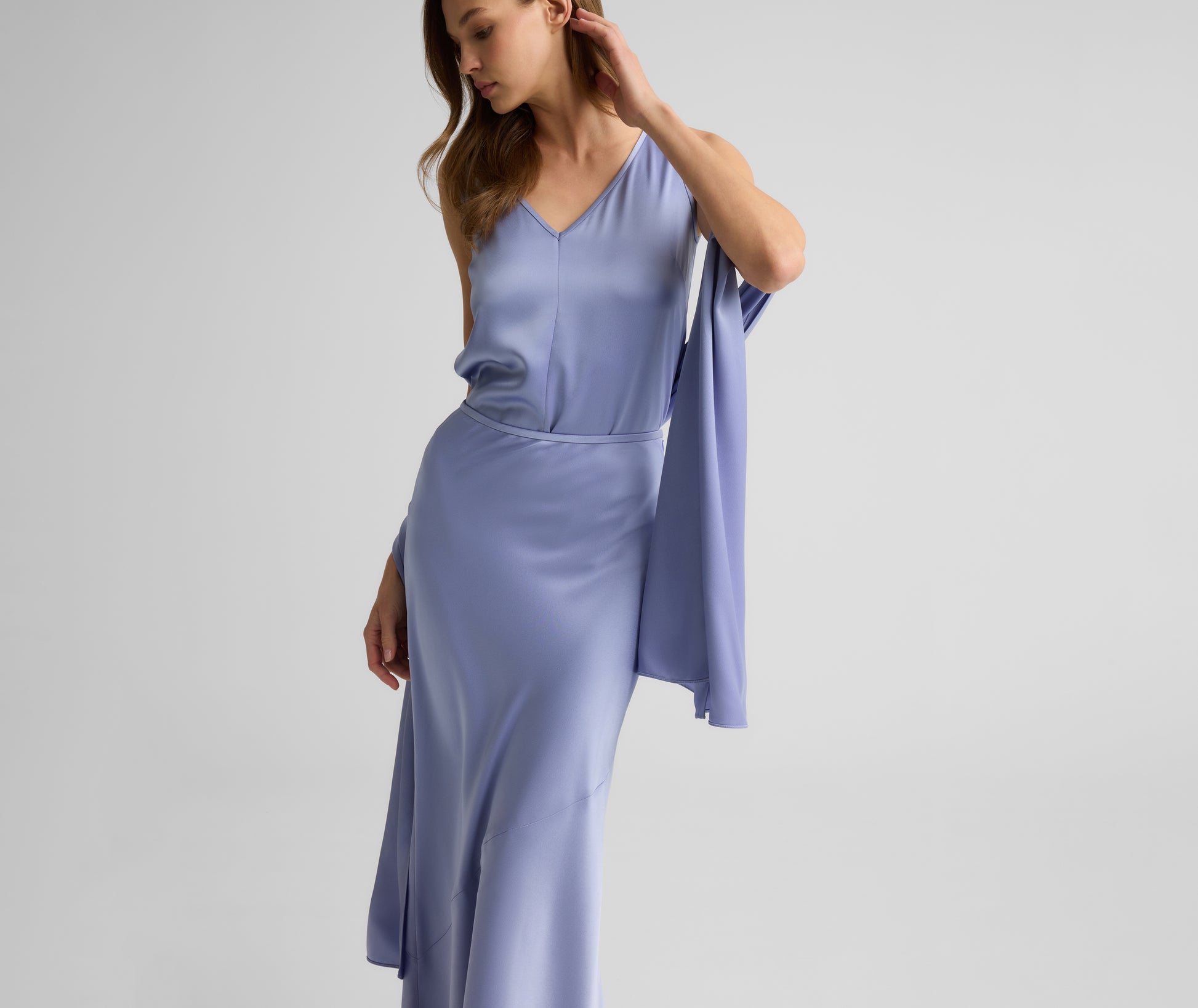 An essential yet luxurious layer for your evening attire, the Winslet is cut from sumptuous Liquid Silk in soothing Iris to drape gracefully across the body when you desire additional coverage. Wear this elegant wrap over a classically formal black dress as a pop of color, or pair with the Sara to create a chic coordinated moment.