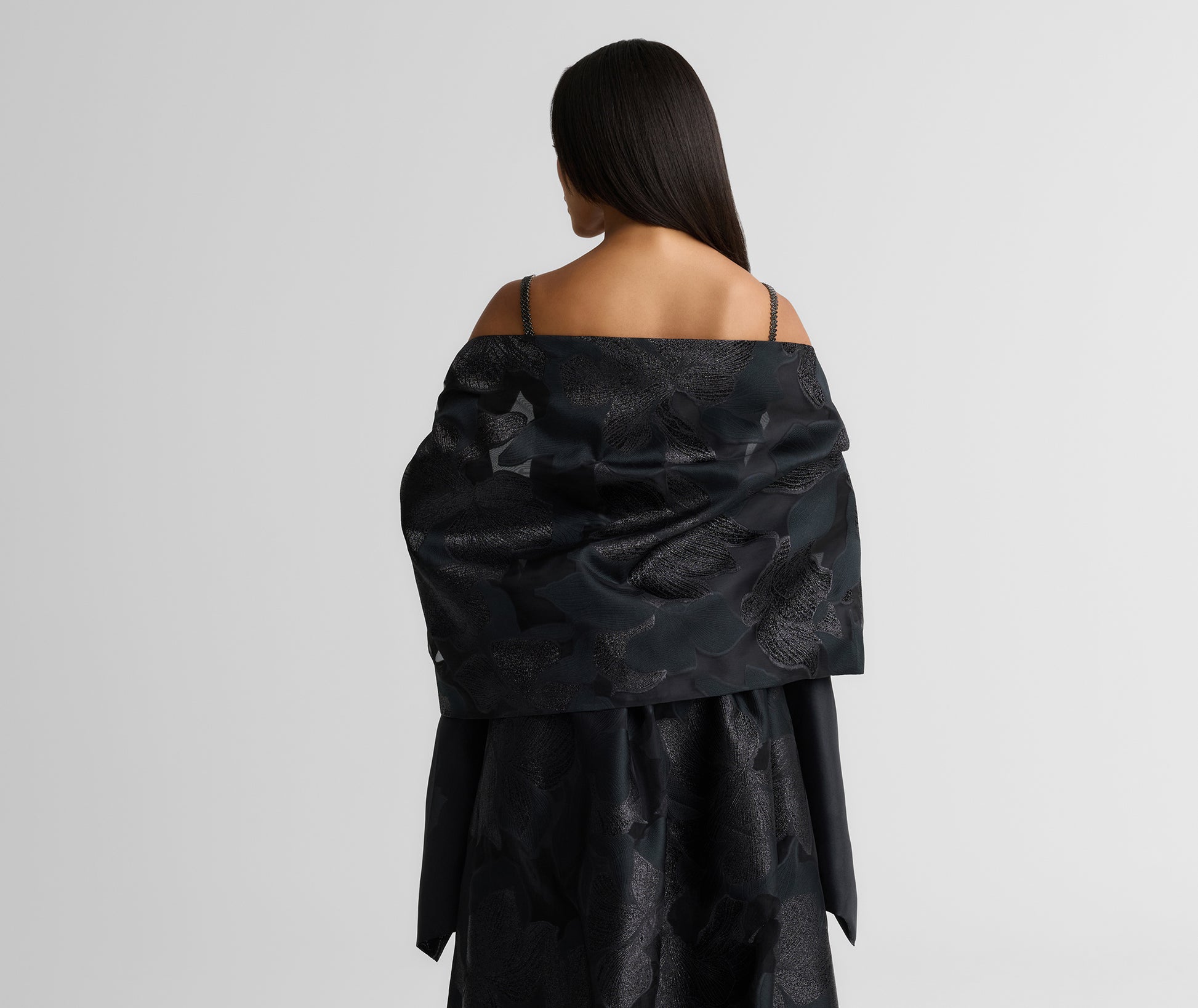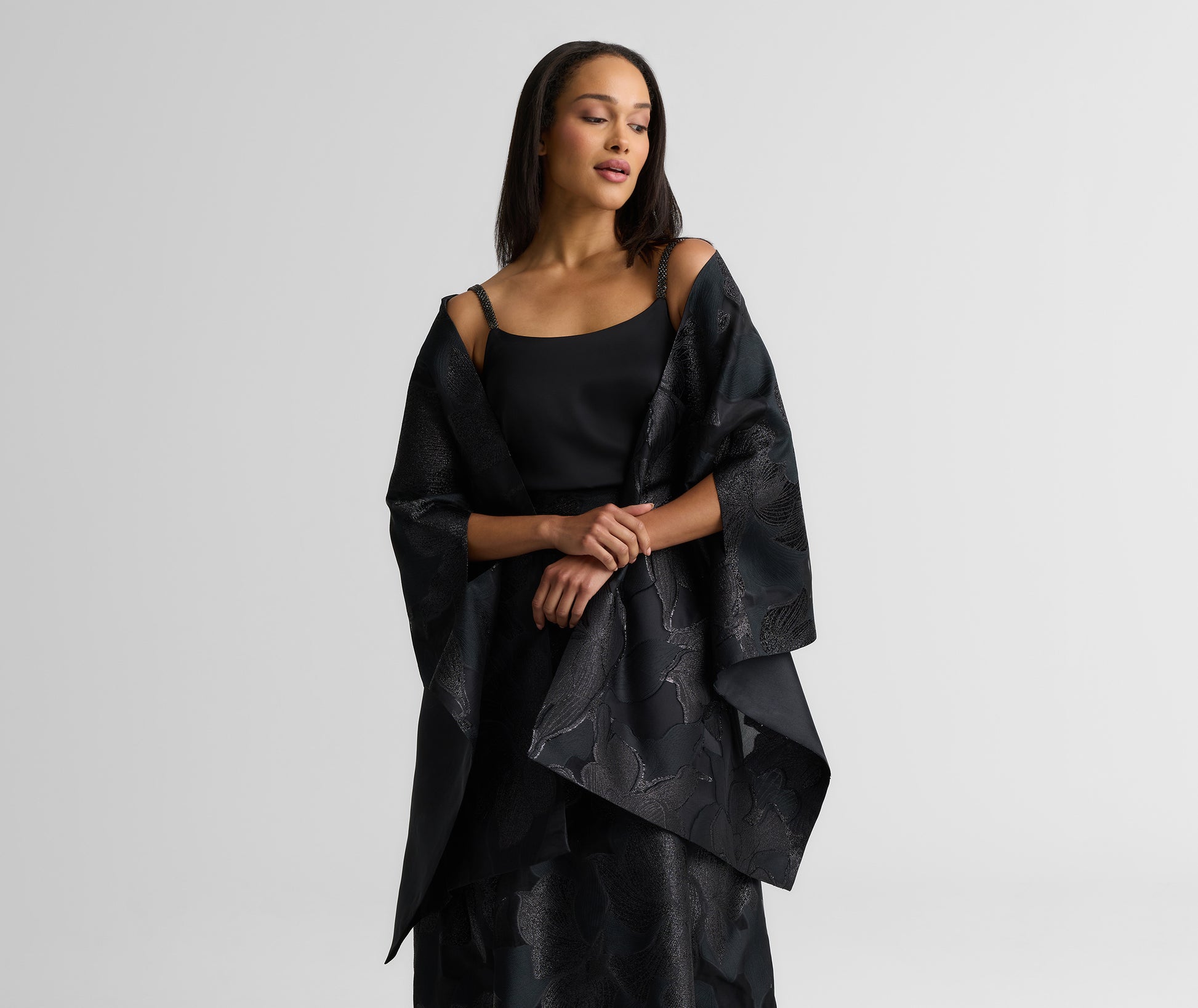 An added layer of elegance, the Georgia instantly uplifts your evening attire. Cut from floaty Floral Organza in classic Black, this wrap features arm cutouts for easy, versatile wear, whether styled with simple sheath dress or the Bethany Skirt to create a coordinated look.