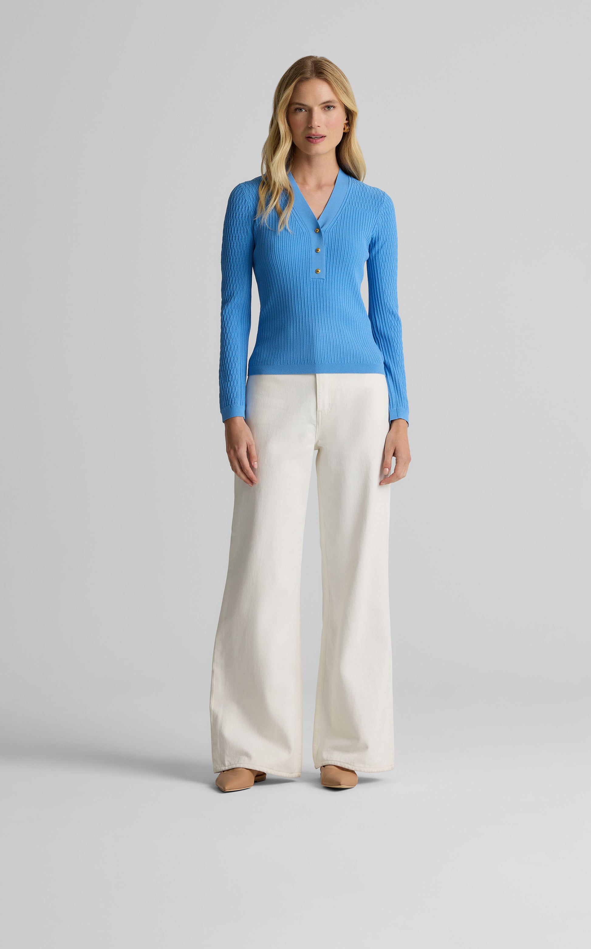 With its slim fit, graceful V-neckline, and delicate gold buttons, this fine ribbed knit sweater in light, bright Periwinkle will instantly become a treasured staple of the modern woman’s wardrobe. Wear the Remy to the office with tailored pants or on days off with denim—it brings effortless sophistication to every ensemble.