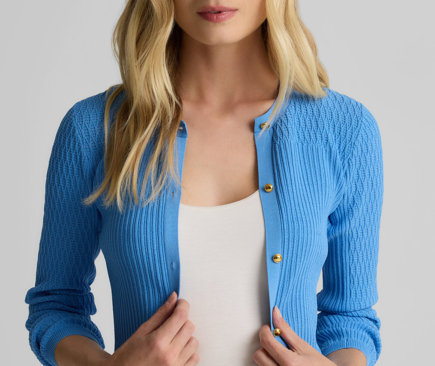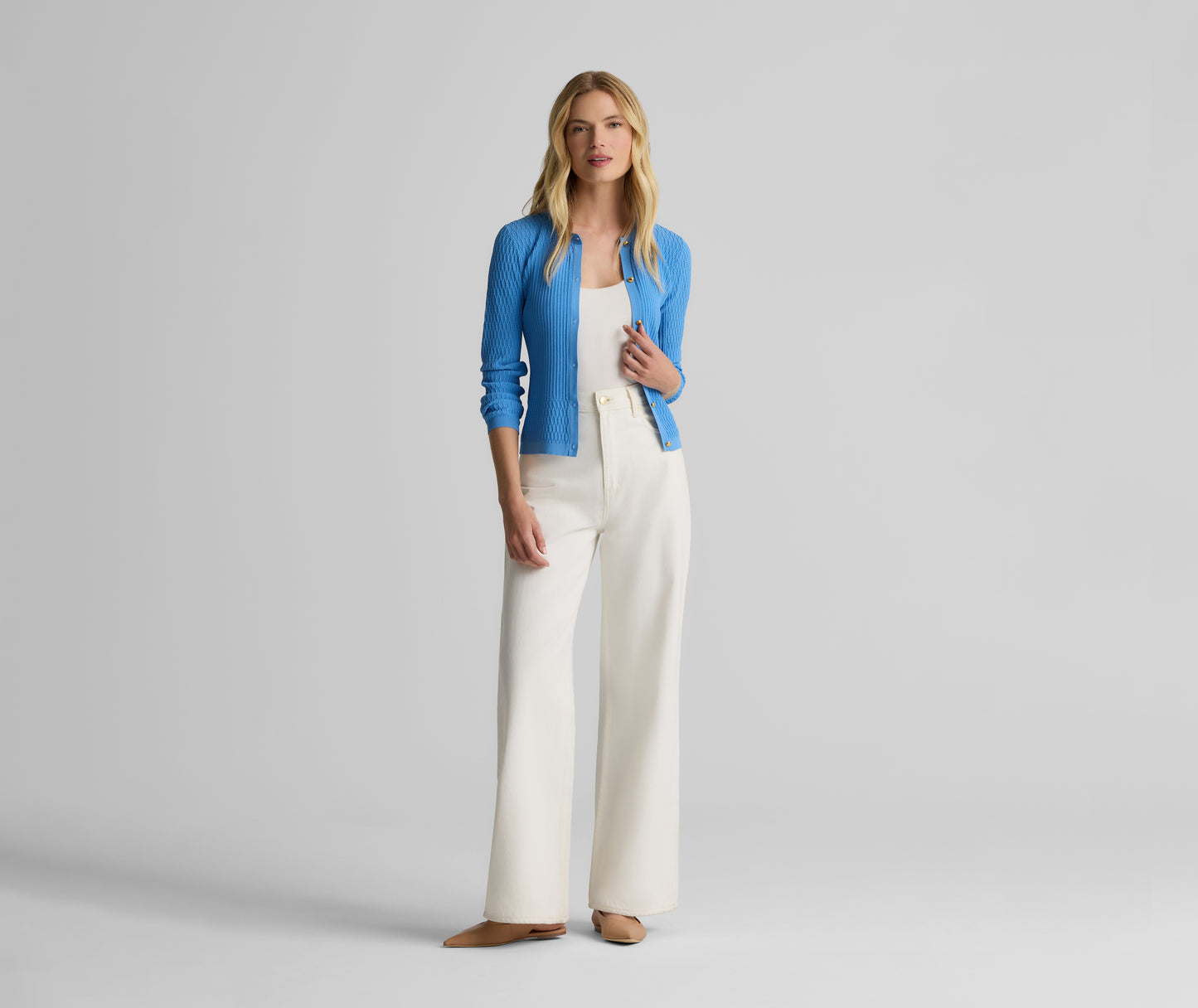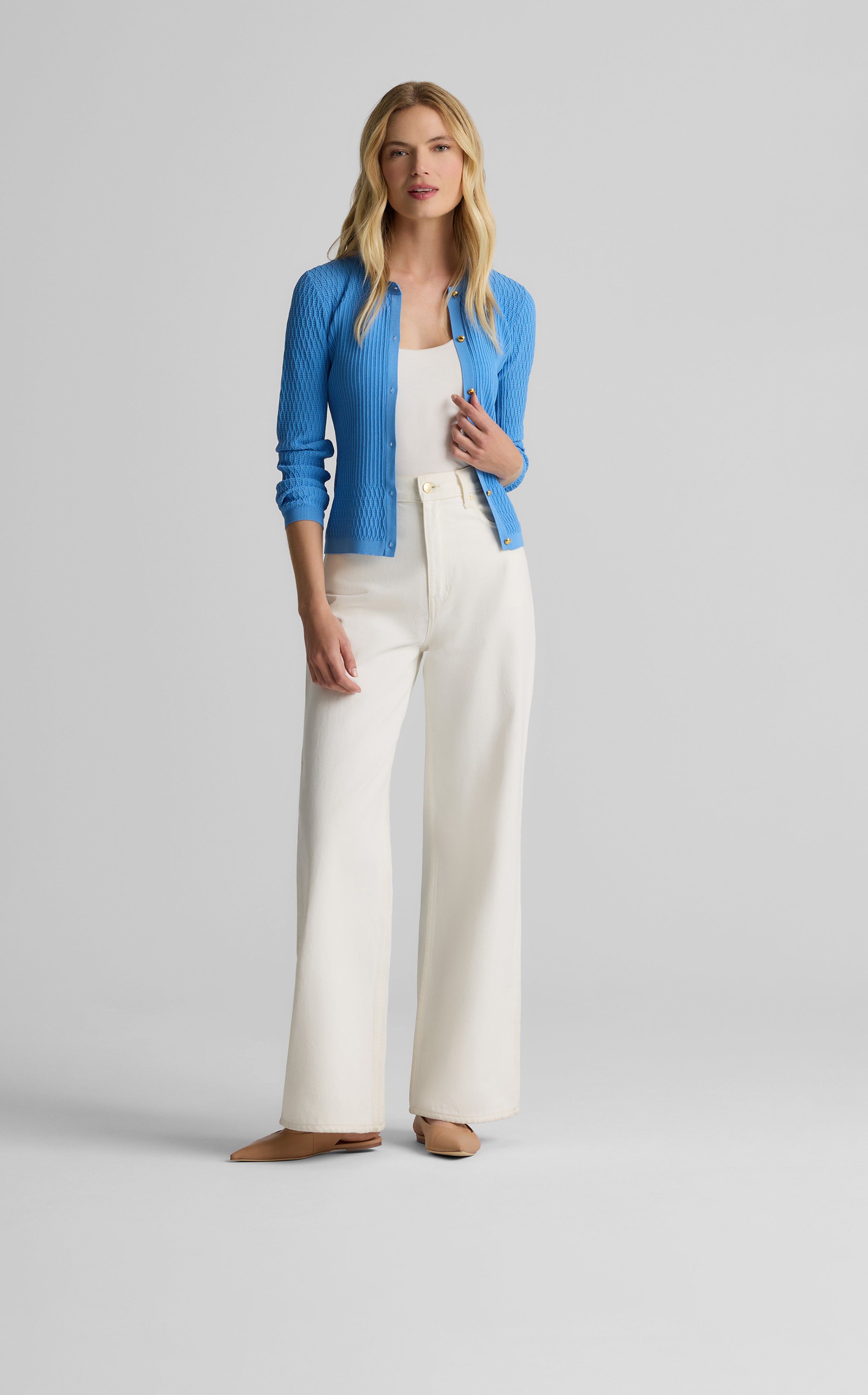 The River’s slim fit and delicately ribbed texture gives the classic cardigan an elevated update. Made from our Fine Mixed Knit and subtly embellished with gold buttons, this luxurious layering piece in bright Periwinkle pairs perfectly with the Wren Shell to create a coordinated twin set, but can also be mixed and matched with other tees and camisoles for endless possibilities.