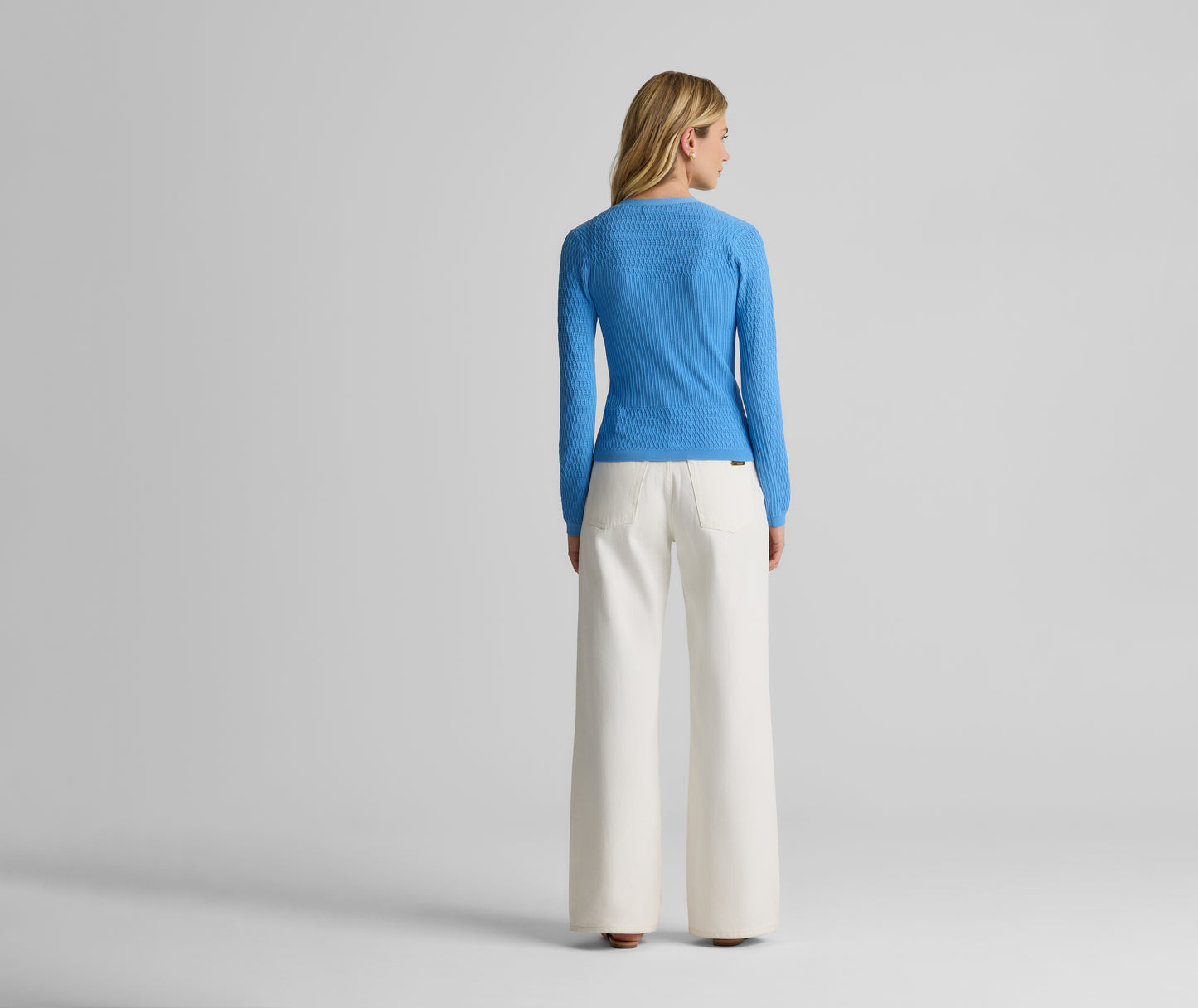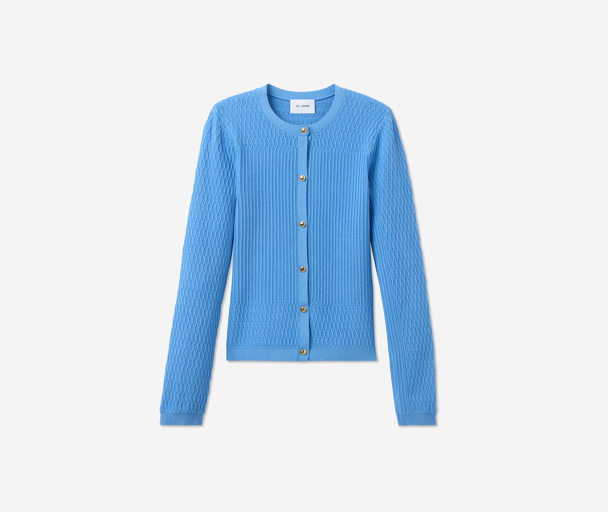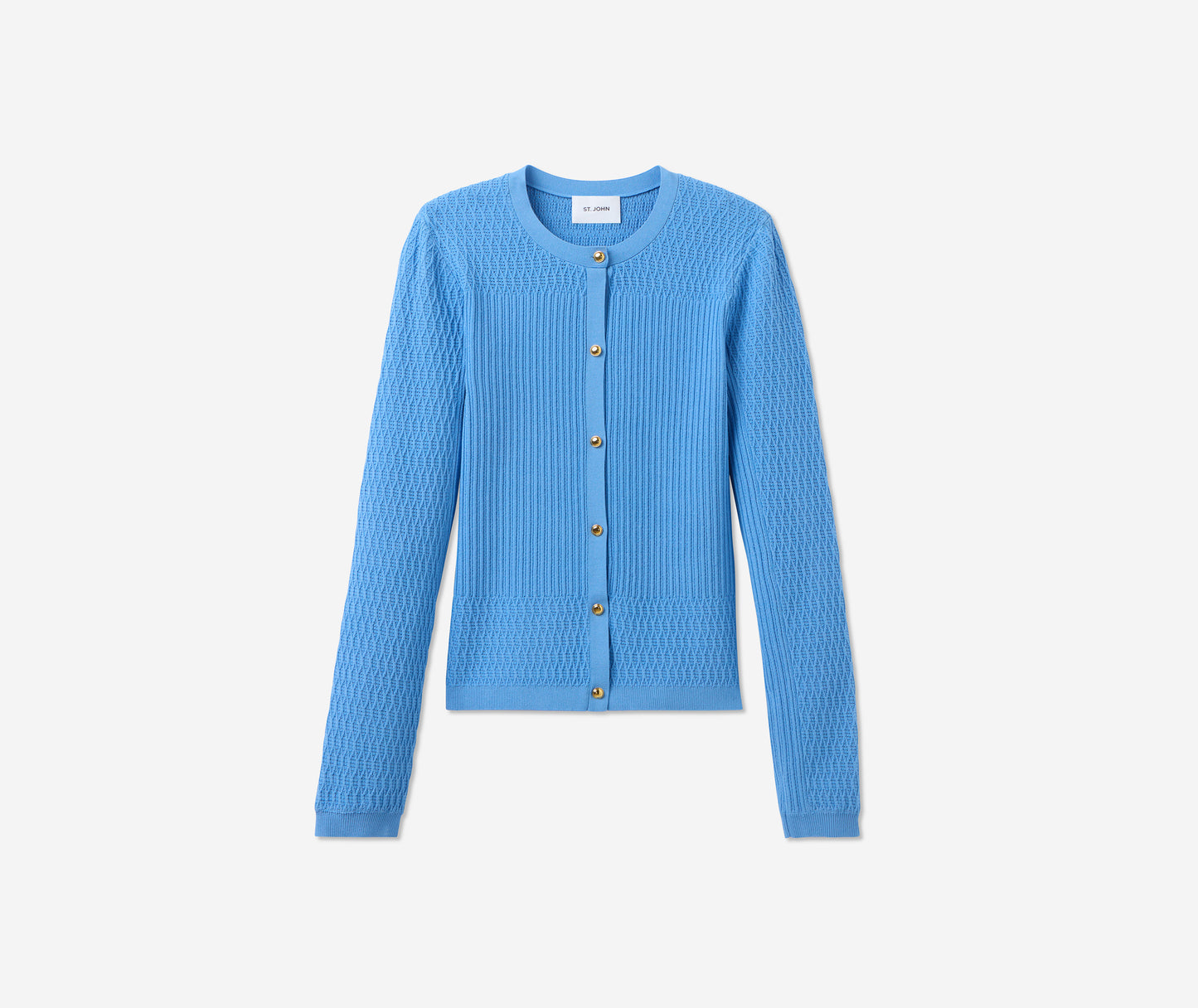 The River’s slim fit and delicately ribbed texture gives the classic cardigan an elevated update. Made from our Fine Mixed Knit and subtly embellished with gold buttons, this luxurious layering piece in bright Periwinkle pairs perfectly with the Wren Shell to create a coordinated twin set, but can also be mixed and matched with other tees and camisoles for endless possibilities.