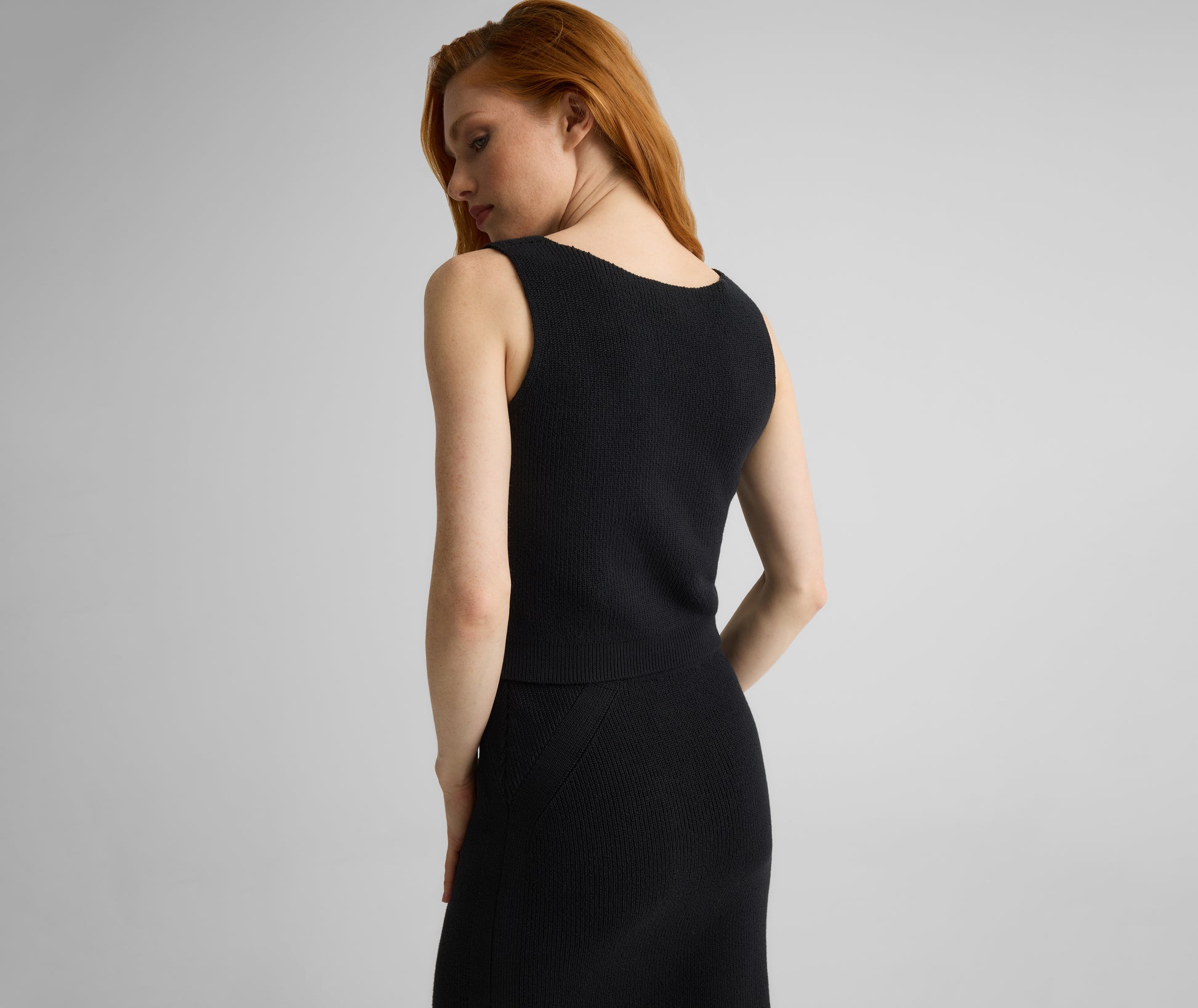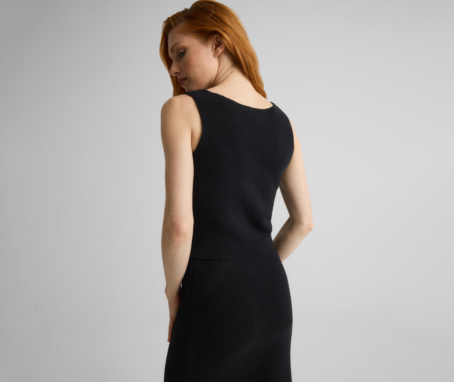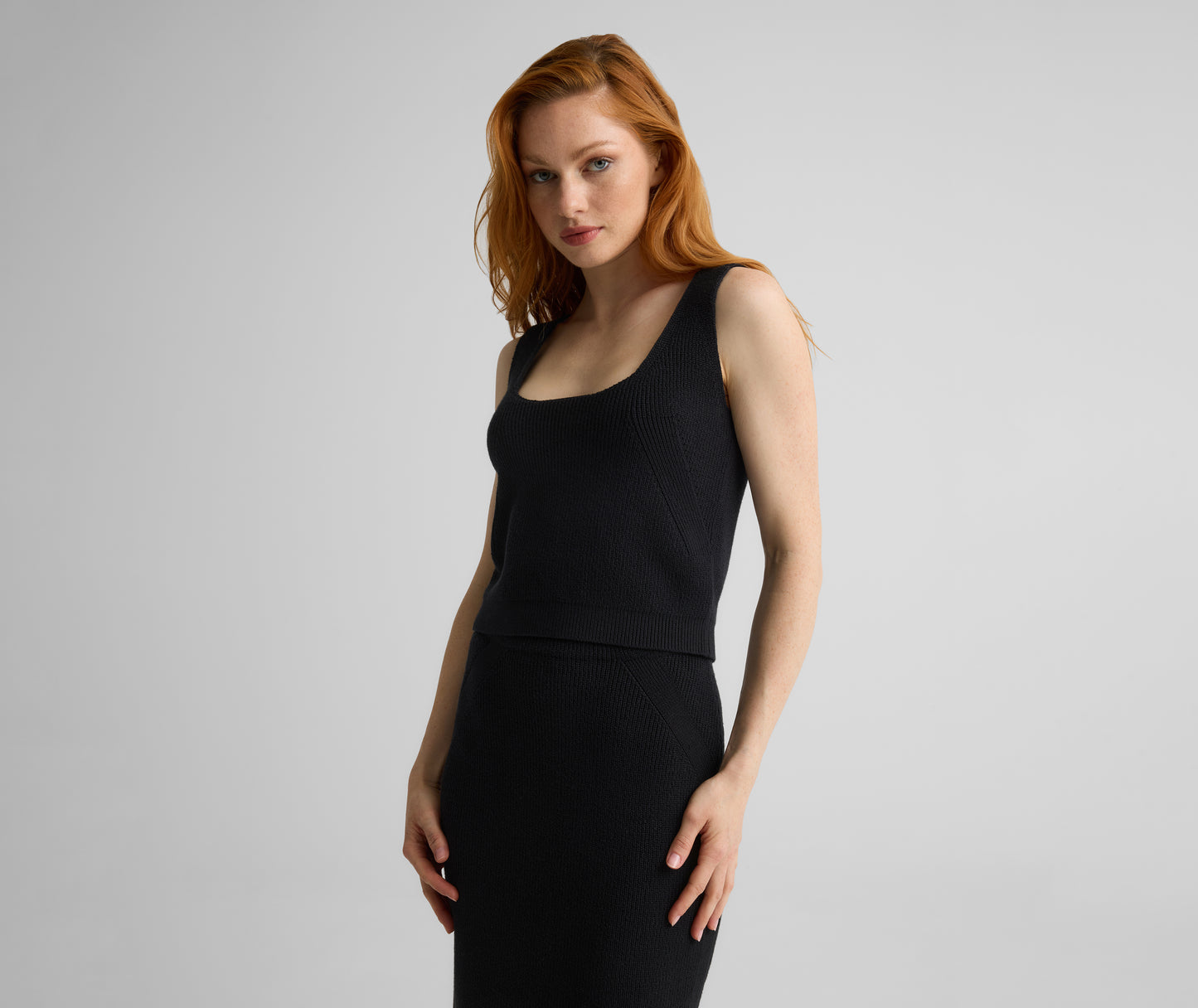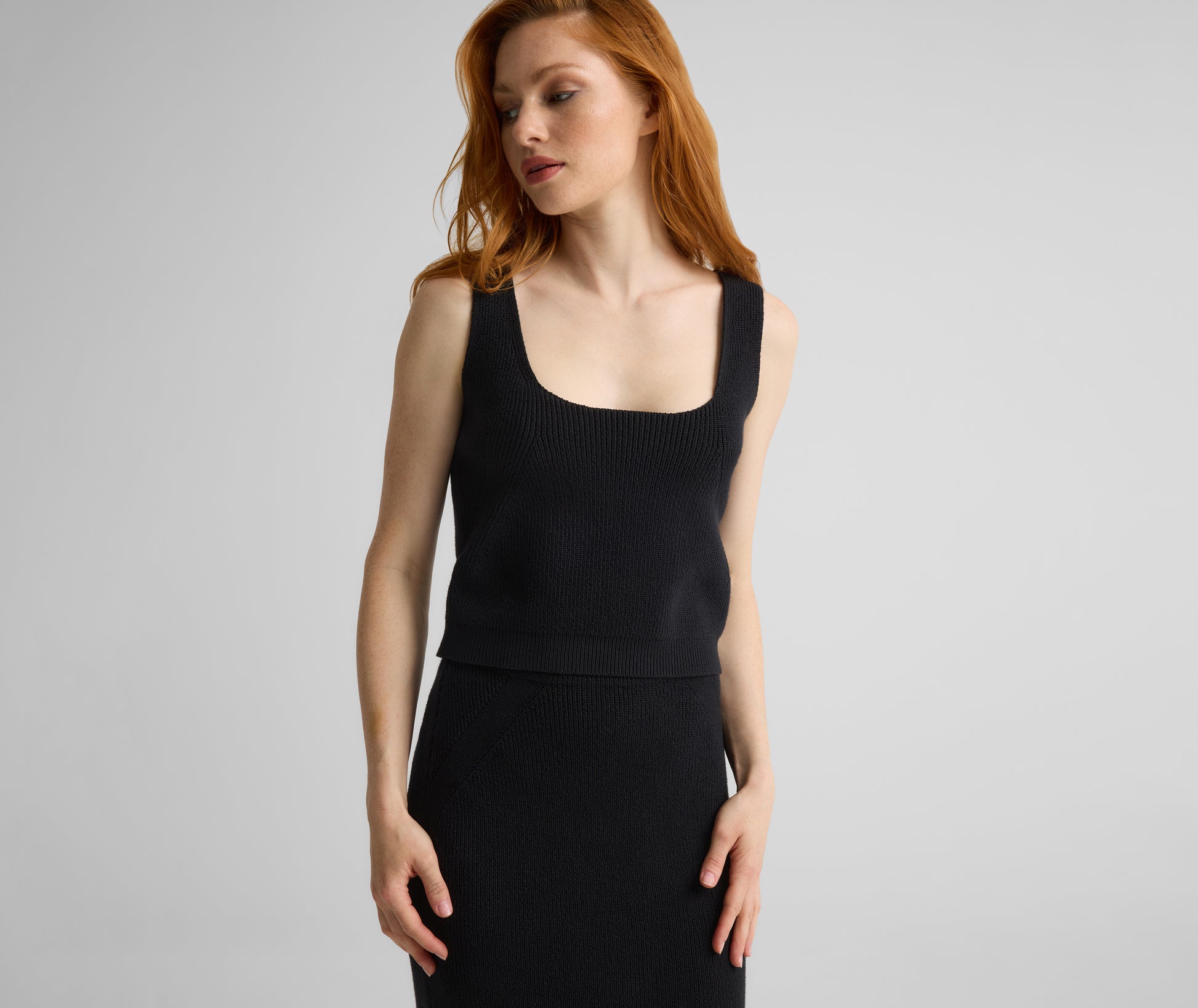 Refined on its own yet perfect for layering, the Abigail combines classic design details with comfortable fabric and fit. Cut to flatter with its scoop neckline and flexible ribbed knit in timeless Black, this sleek shell top will be a go-to piece in your everyday wardrobe. Wear it a multitude of ways, including as a matching set with our Rhea Midi Skirt for a minimalist, monochromatic effect.