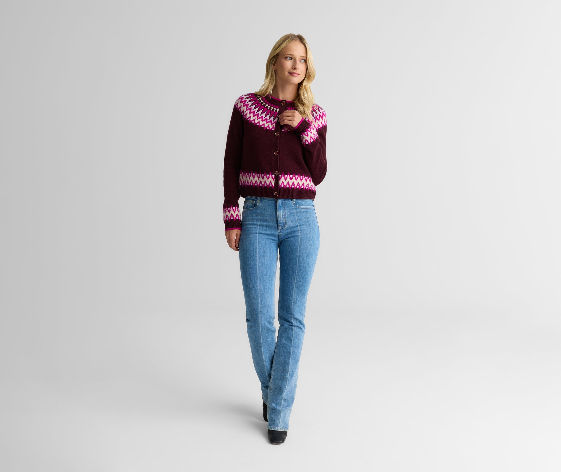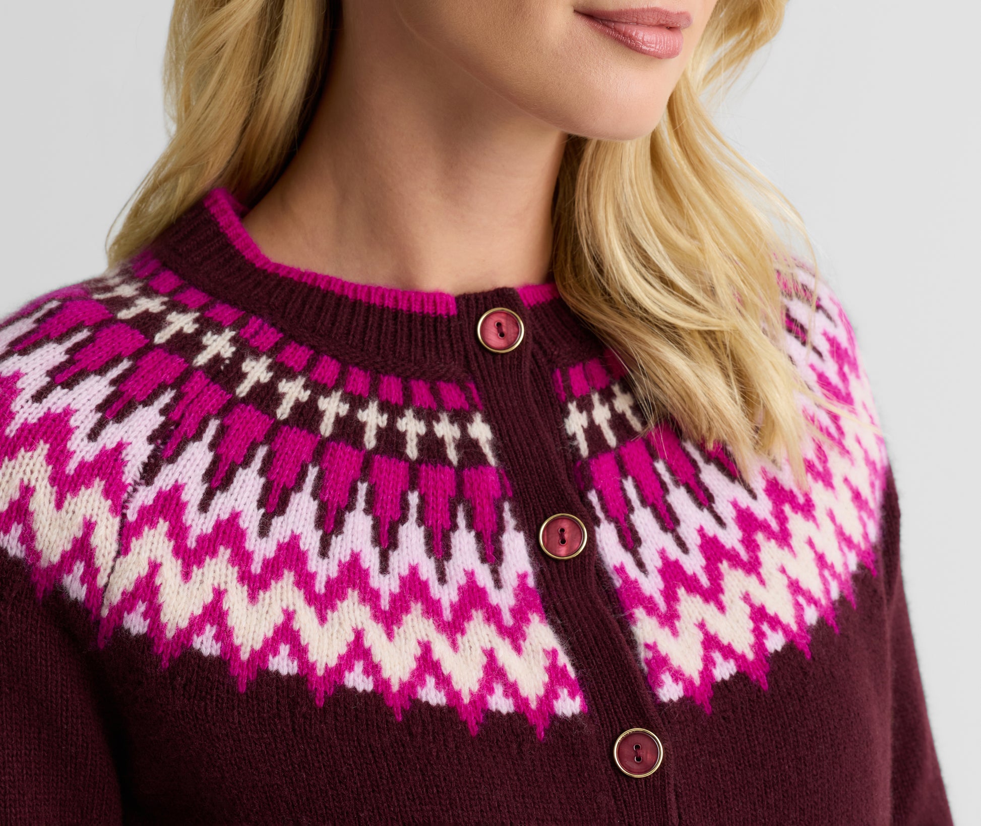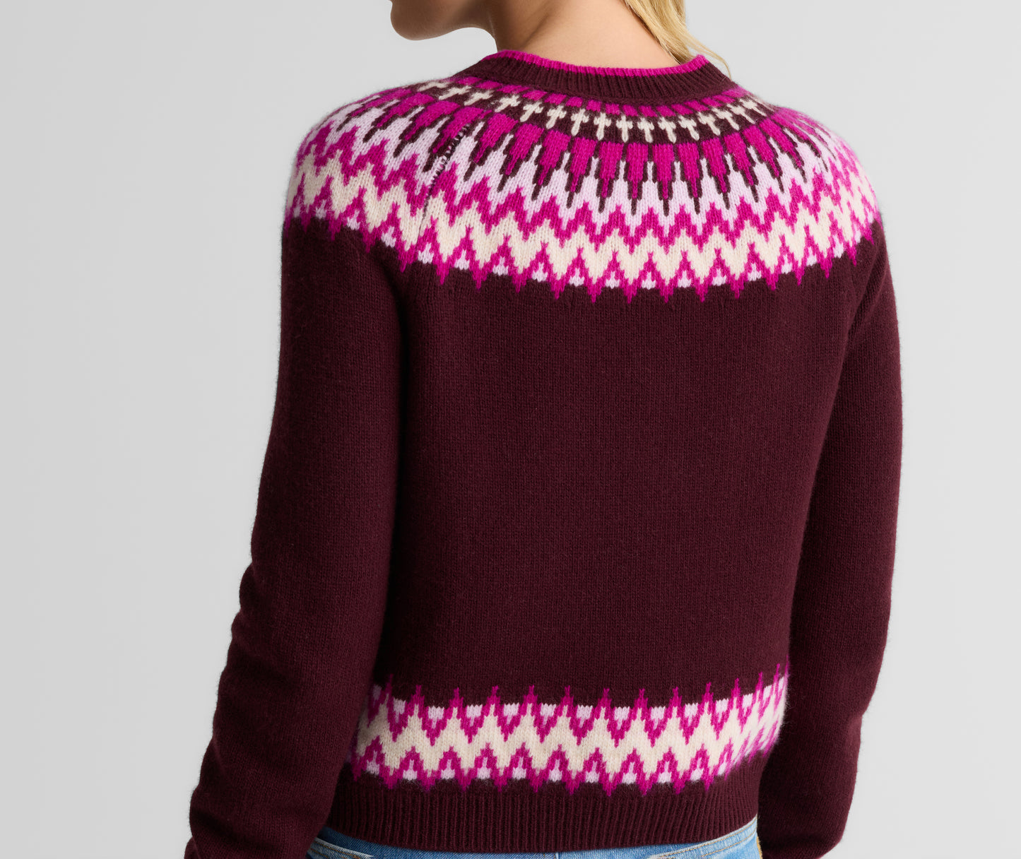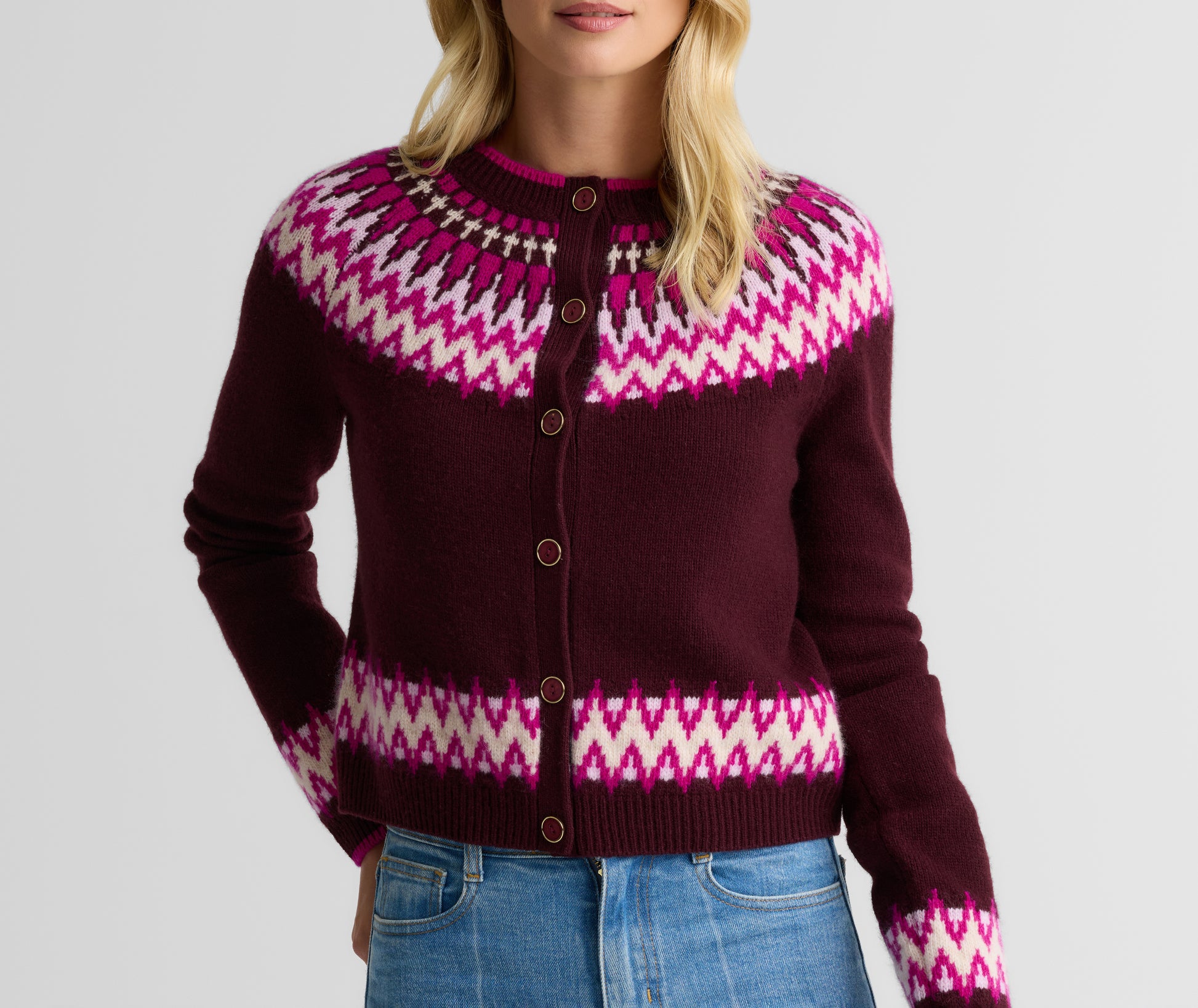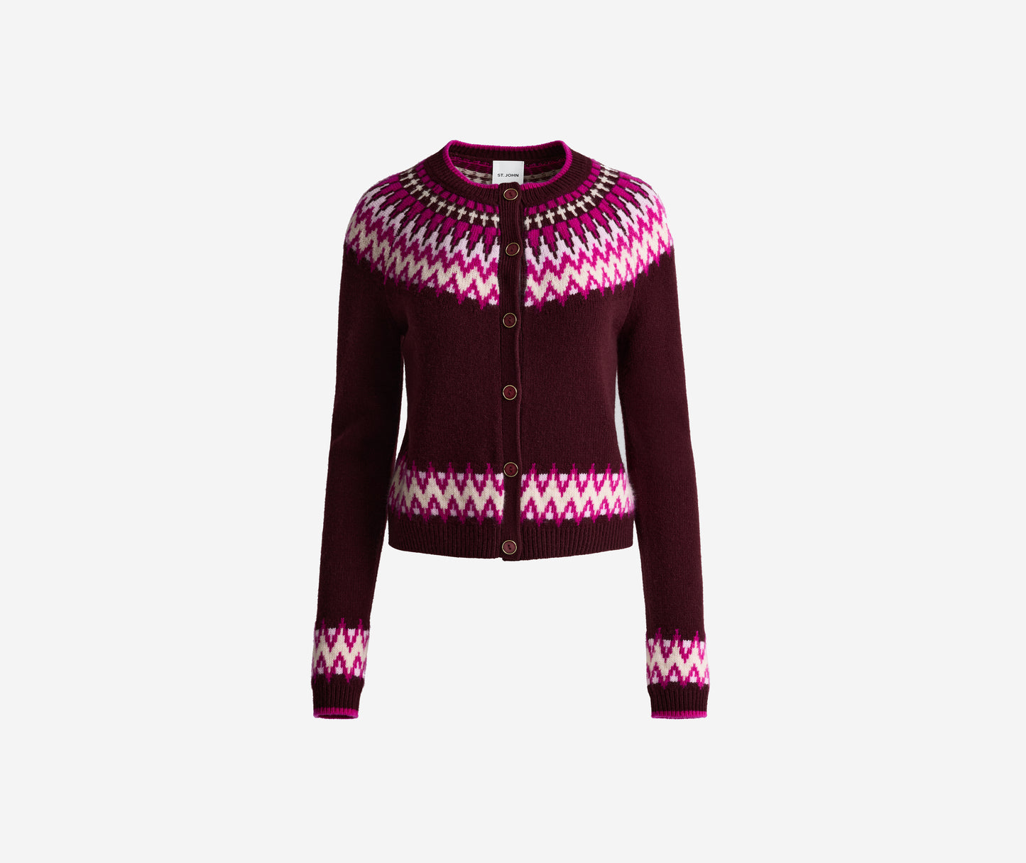 An elevated take on the Fair Isle sweater, the Sally combines classic charm with St. John’s signature sophistication. Made from a supremely soft cashmere blend in rich Bordeaux and finished with gold-rimmed buttons, this cardigan layers beautifully over shells, tees, and blouses to create a cozy yet chic statement.