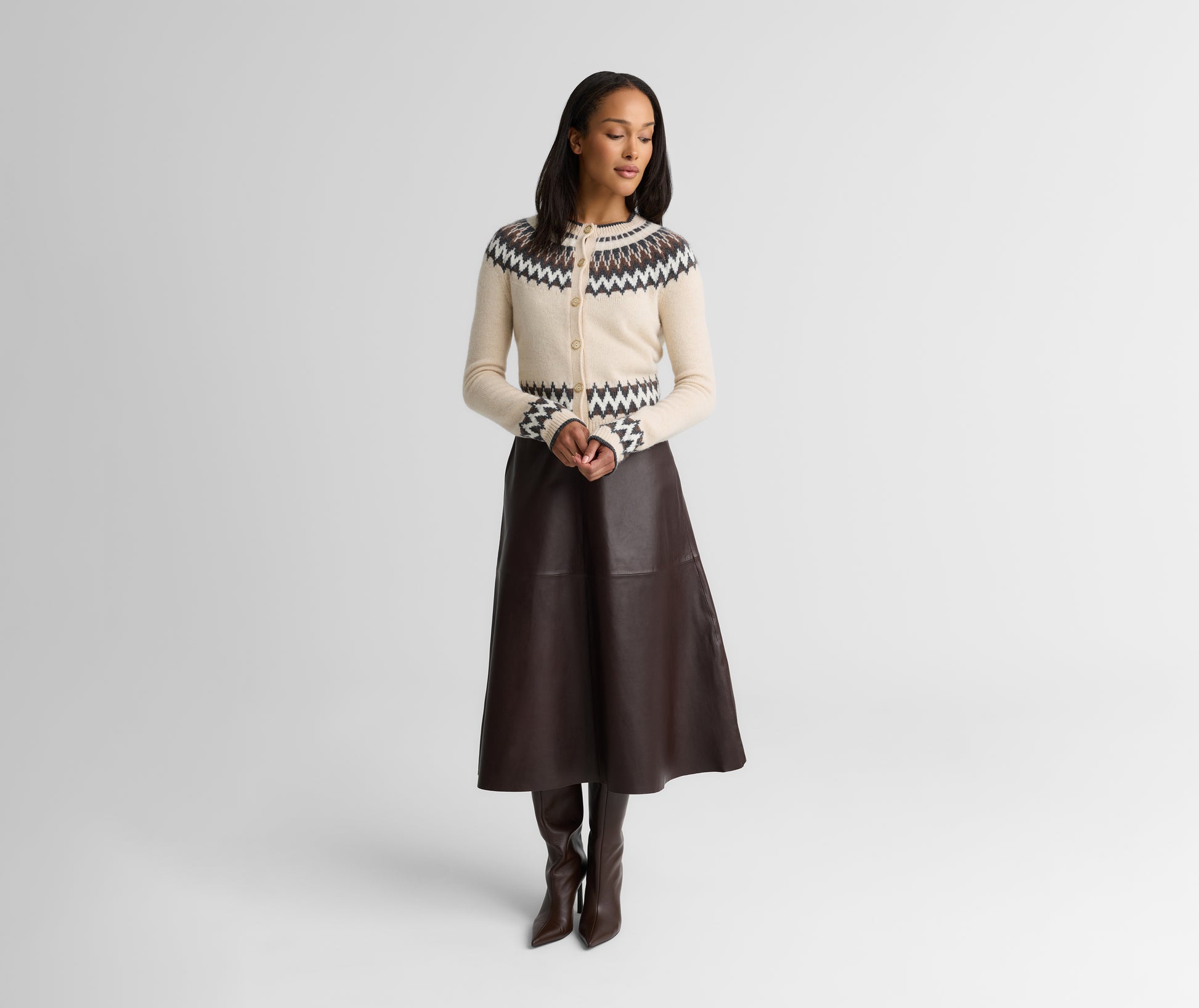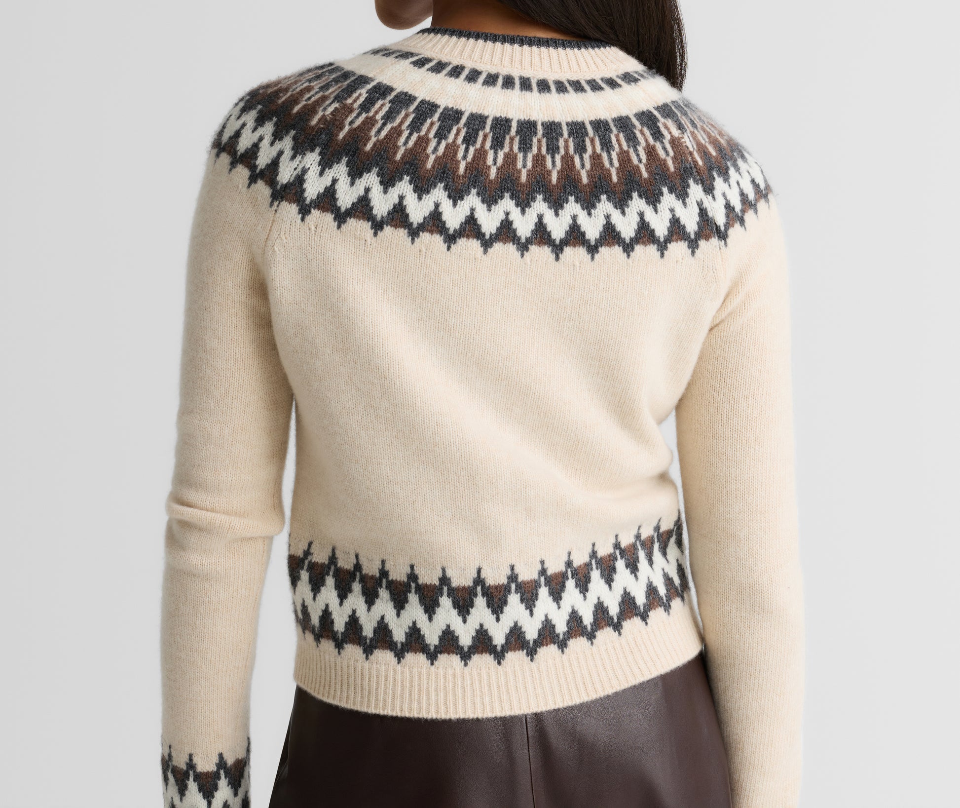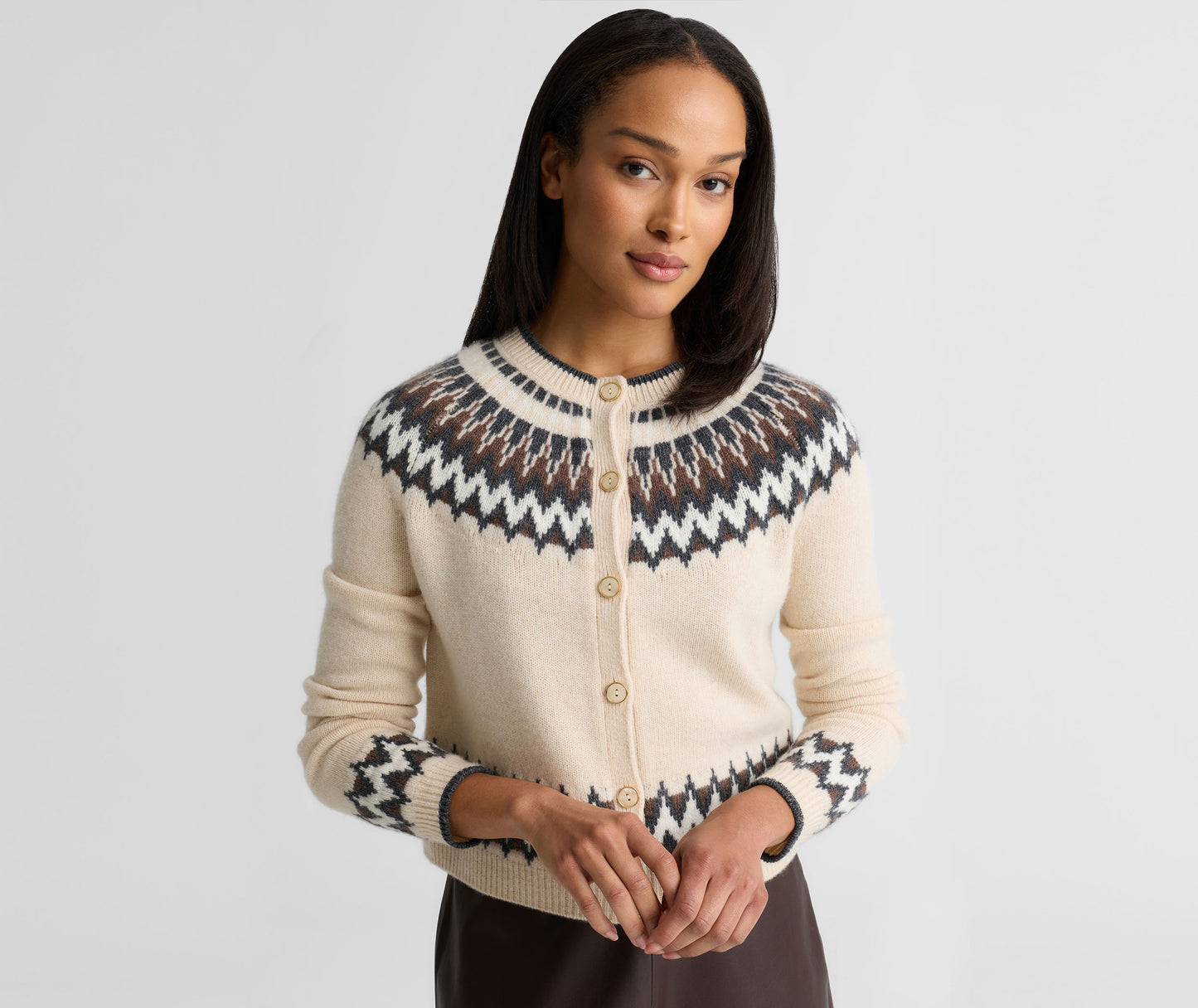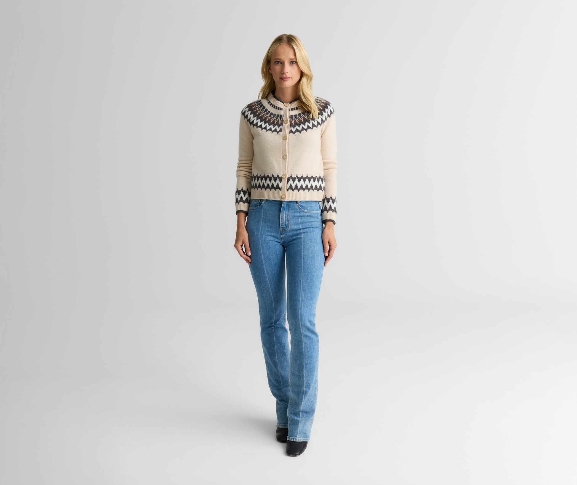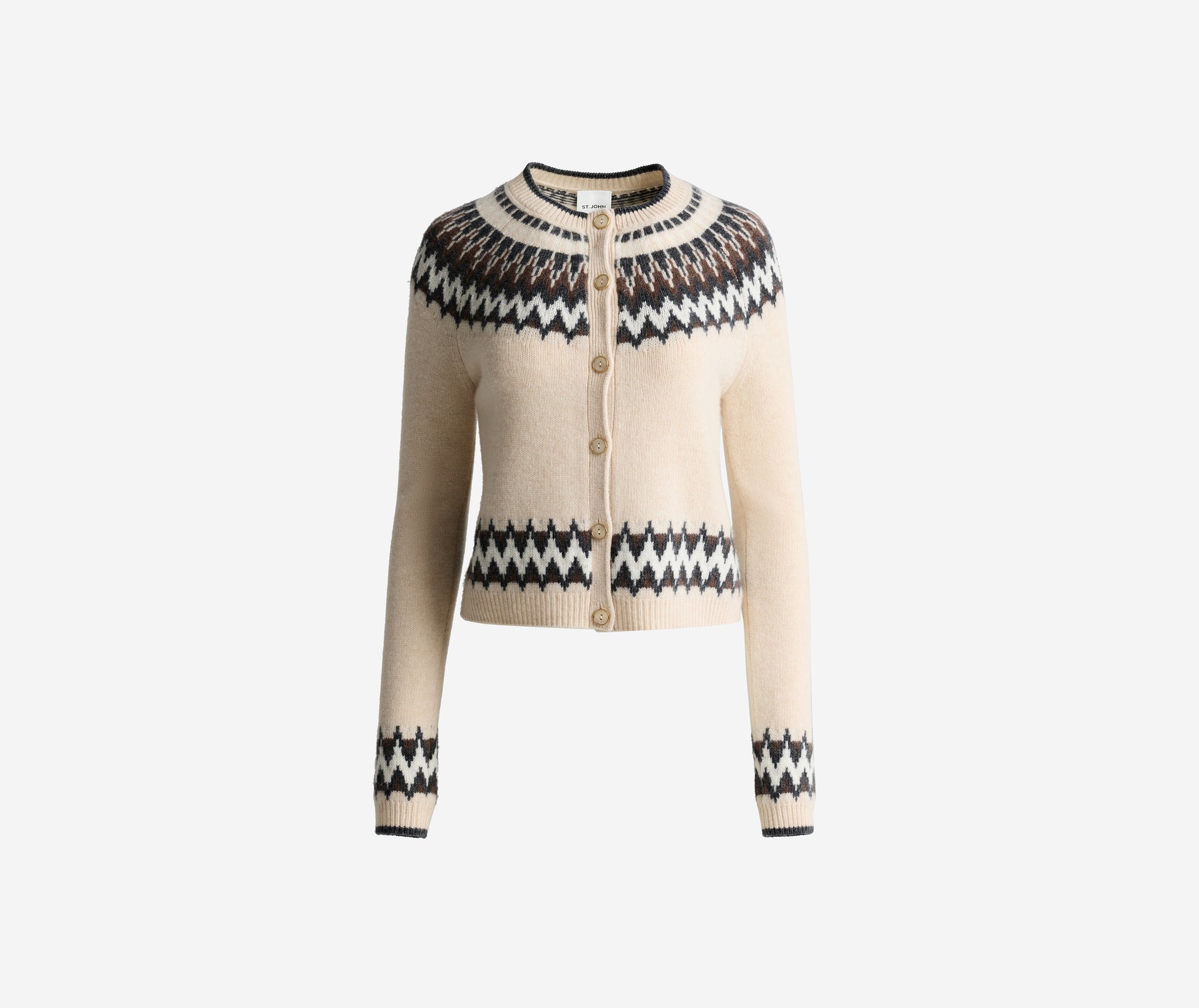 An elevated take on the Fair Isle sweatere, the Sally combines classic charm with St. John’s signature sophistication. Made from a supremely soft cashmere blend in versatile Oatmeal and finished with gold-rimmed buttons, this cardigan layers beautifully over shells, tees, and blouses to create a cozy yet chic statement.