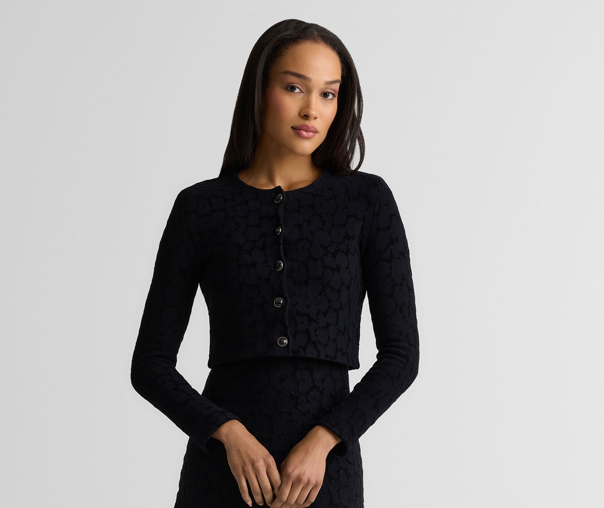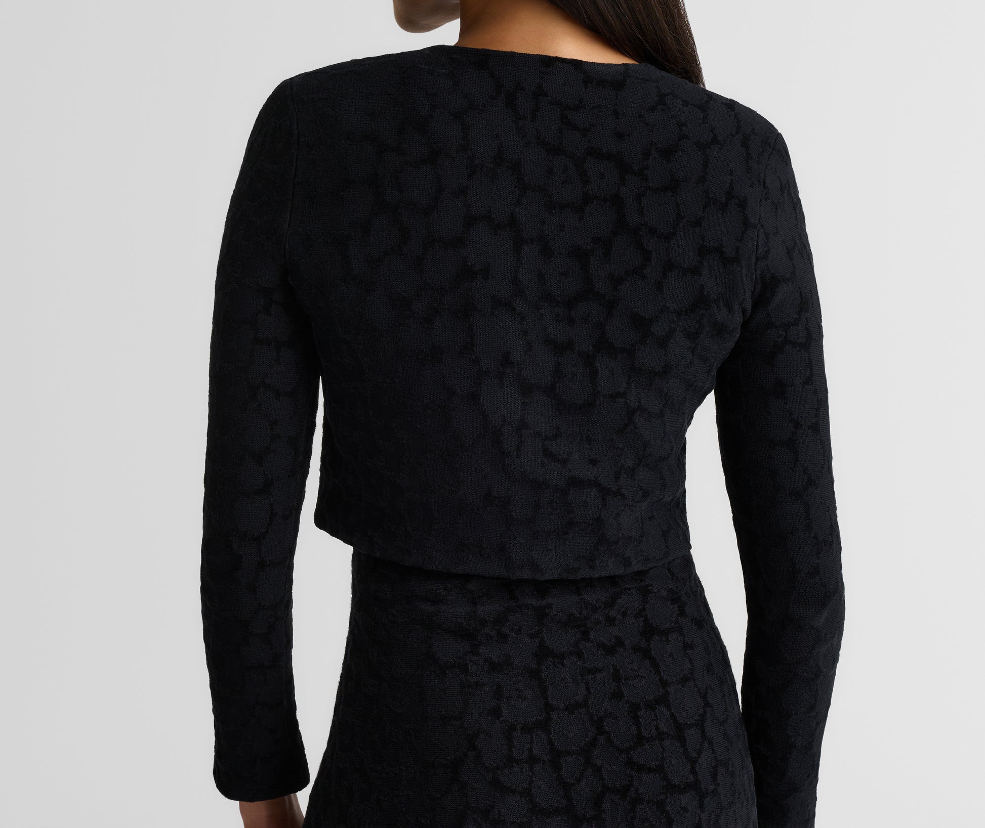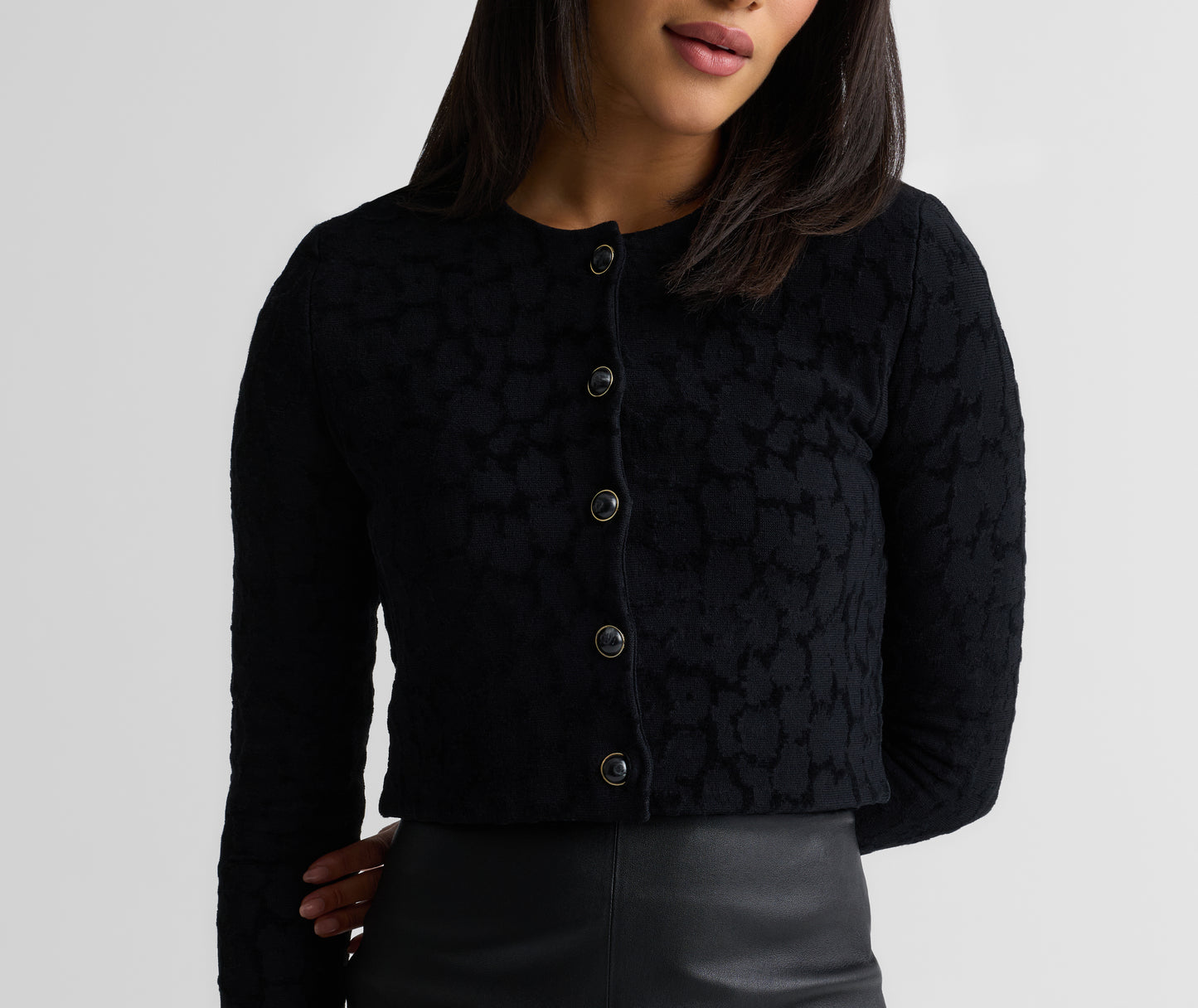 Subtly textured and plush to the touch, the Amber is a timeless staple with a refined edge. Tonal Velvet Leopard Jacquard gives this cropped cardigan its quiet distinction, whether layered over the Belinda Dress for a coordinated look or paired with denim for effortless off-duty moments.