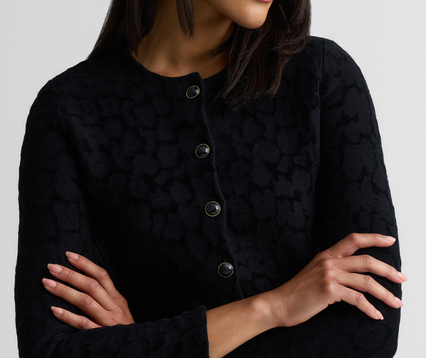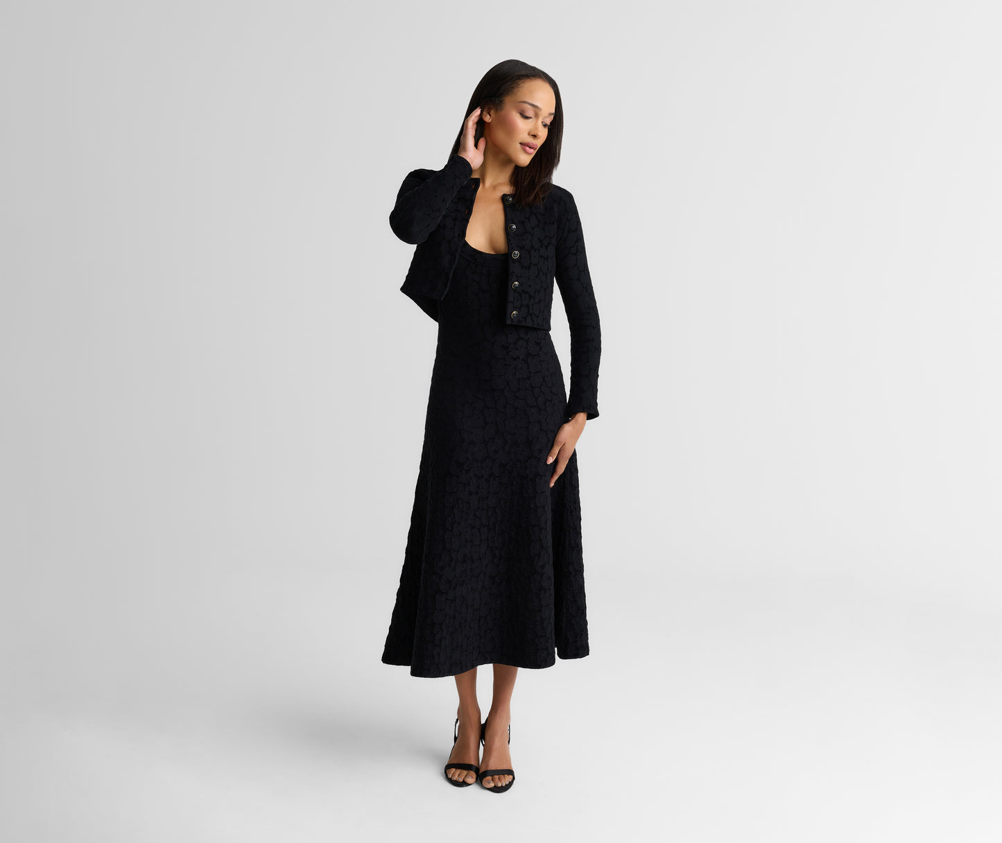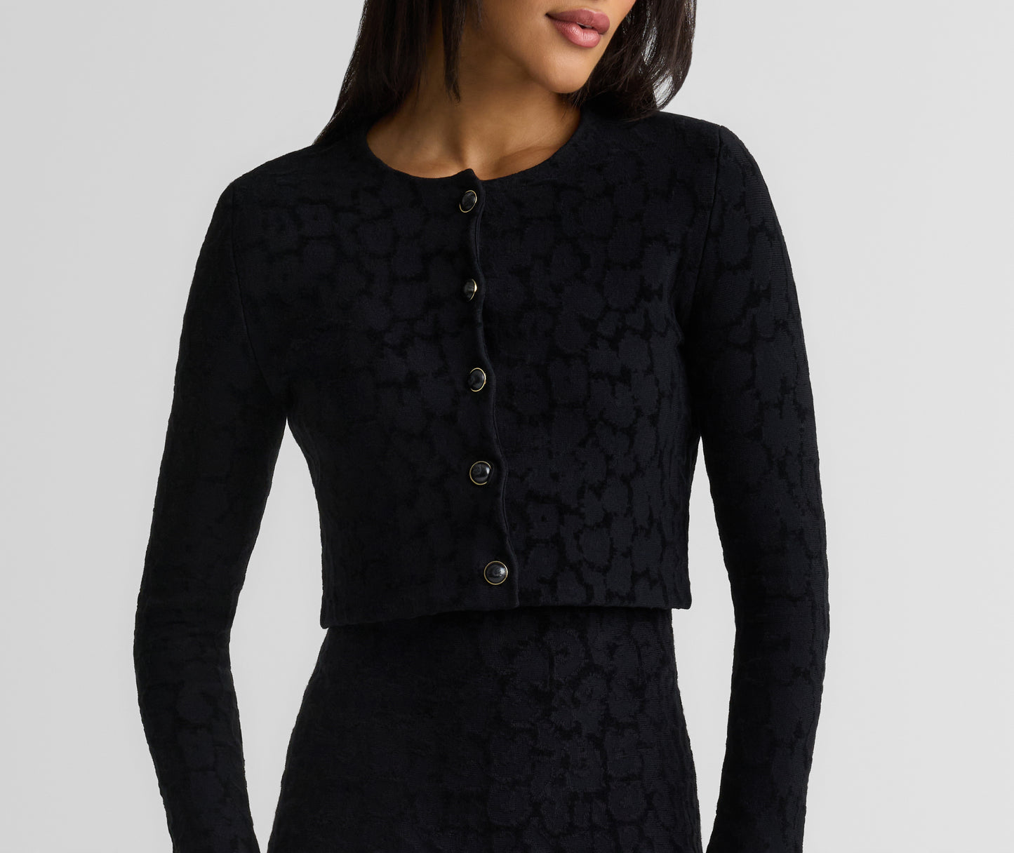 Subtly textured and plush to the touch, the Amber is a timeless staple with a refined edge. Tonal Velvet Leopard Jacquard gives this cropped cardigan its quiet distinction, whether layered over the Belinda Dress for a coordinated look or paired with denim for effortless off-duty moments.