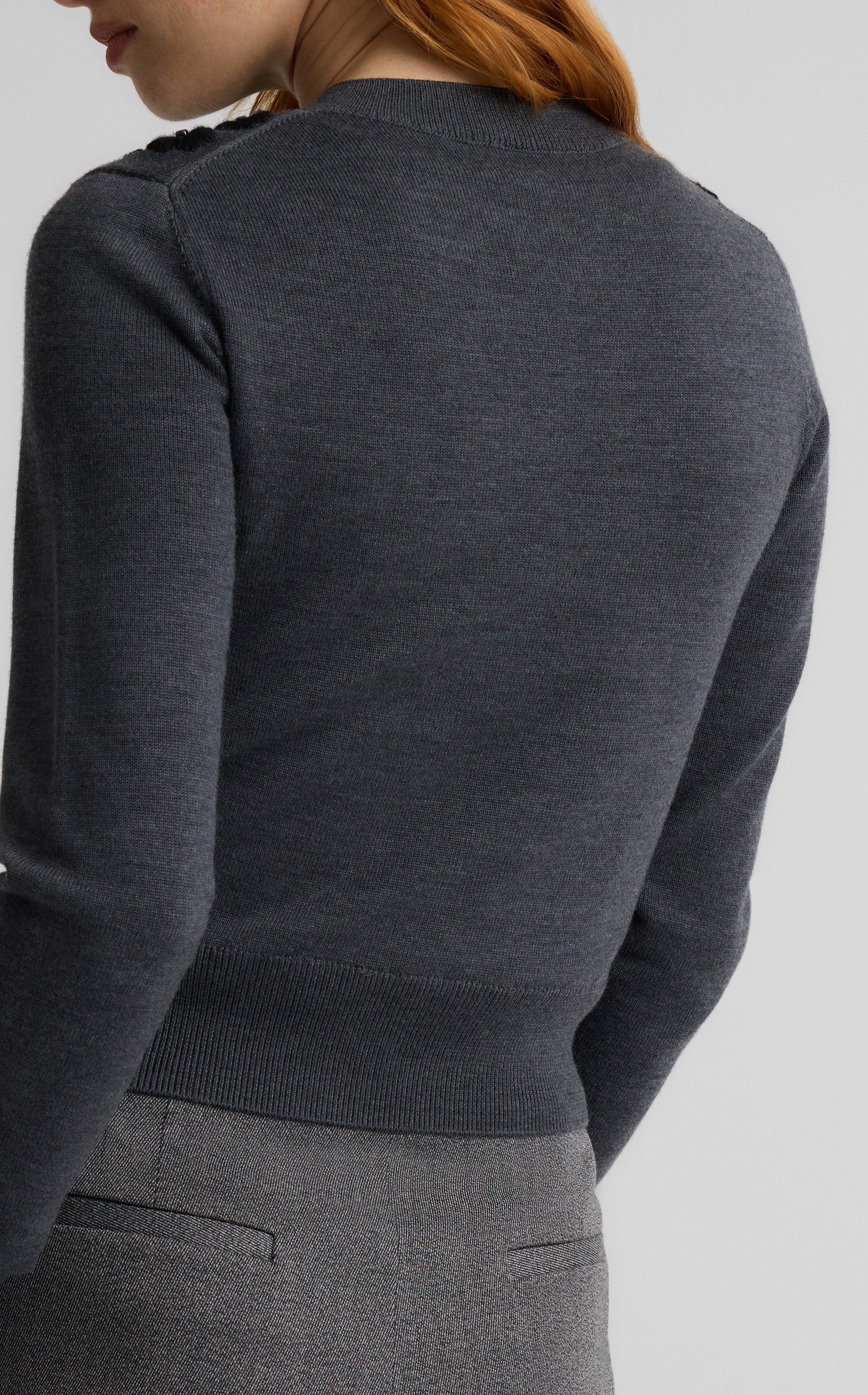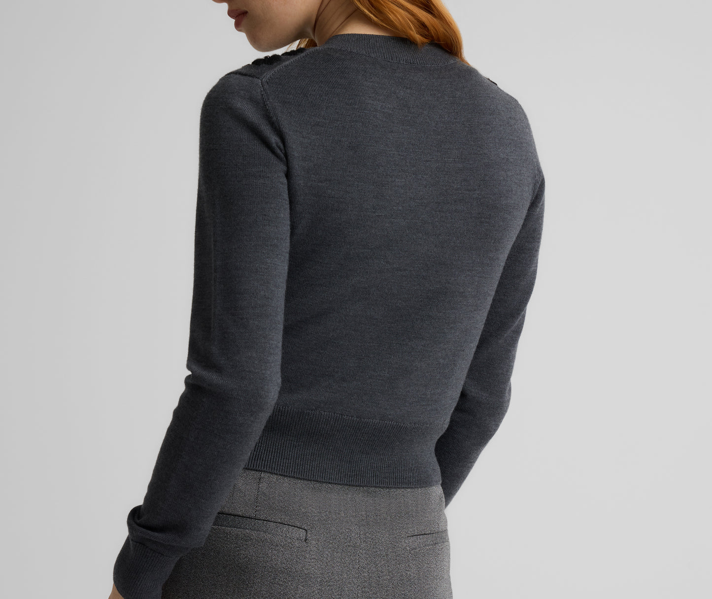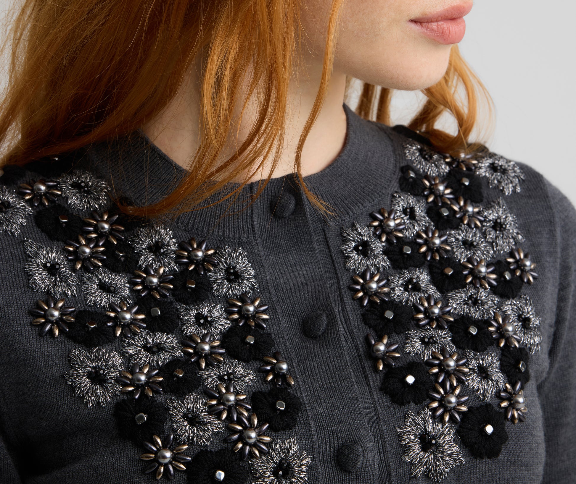 A cardigan like no other in your closet, the Seraphina was meticulously crafted to elevate everything from your go-to denim to sleek pencil skirts and beyond. Made from a whisper soft wool silk blend in versatile Medium Grey Melange with delicate embroidery and hand beading in an intricate floral motif, this clean and classic silhouette shines with every thoughtful detail.