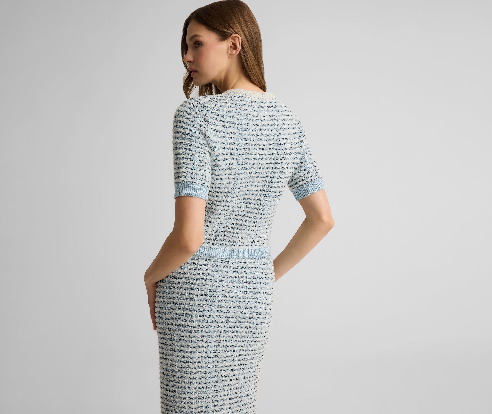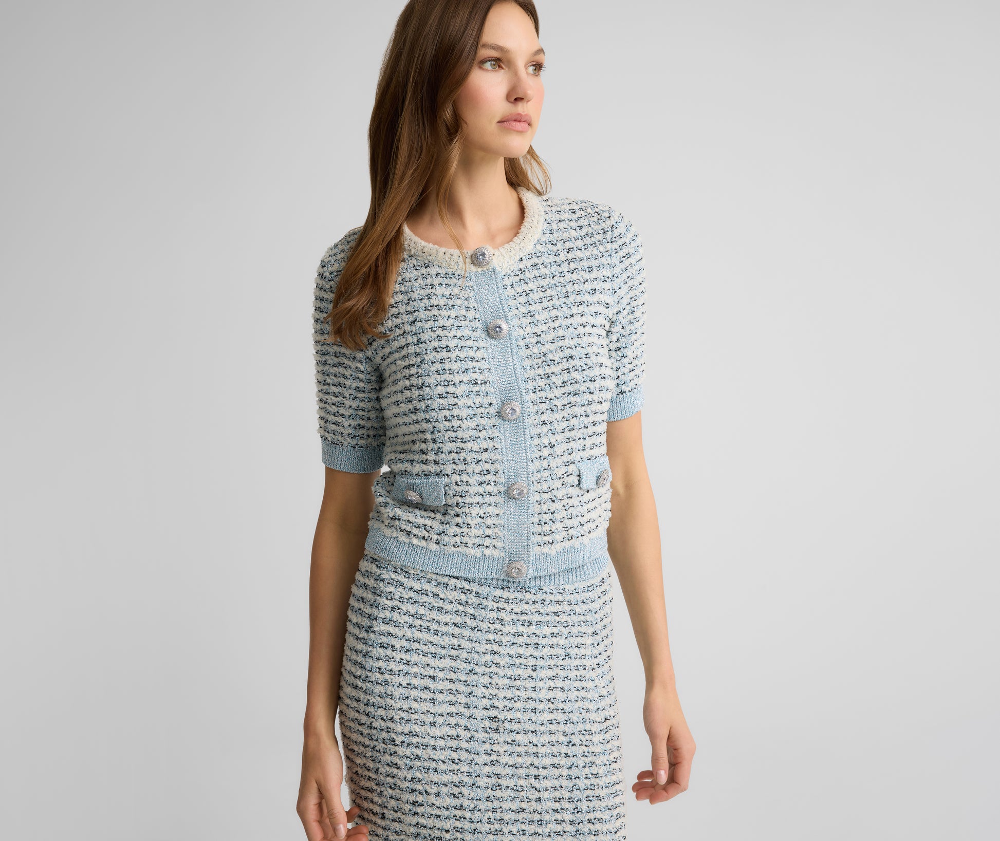 Equally romantic and sophisticated, the Silvie exemplifies the nostalgic charm of knit evening wear. Crafted in fluttery, softly shimmering Brighton Knit accented with jeweled buttons, this sweater makes an elegant pairing with the Sadie Skirt for formal occasions, but is just as dynamic for dressing up casual separates.