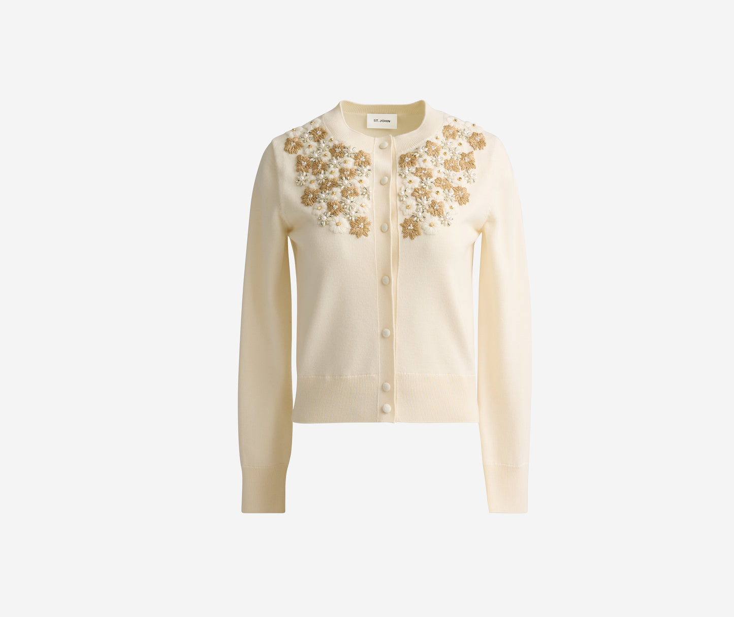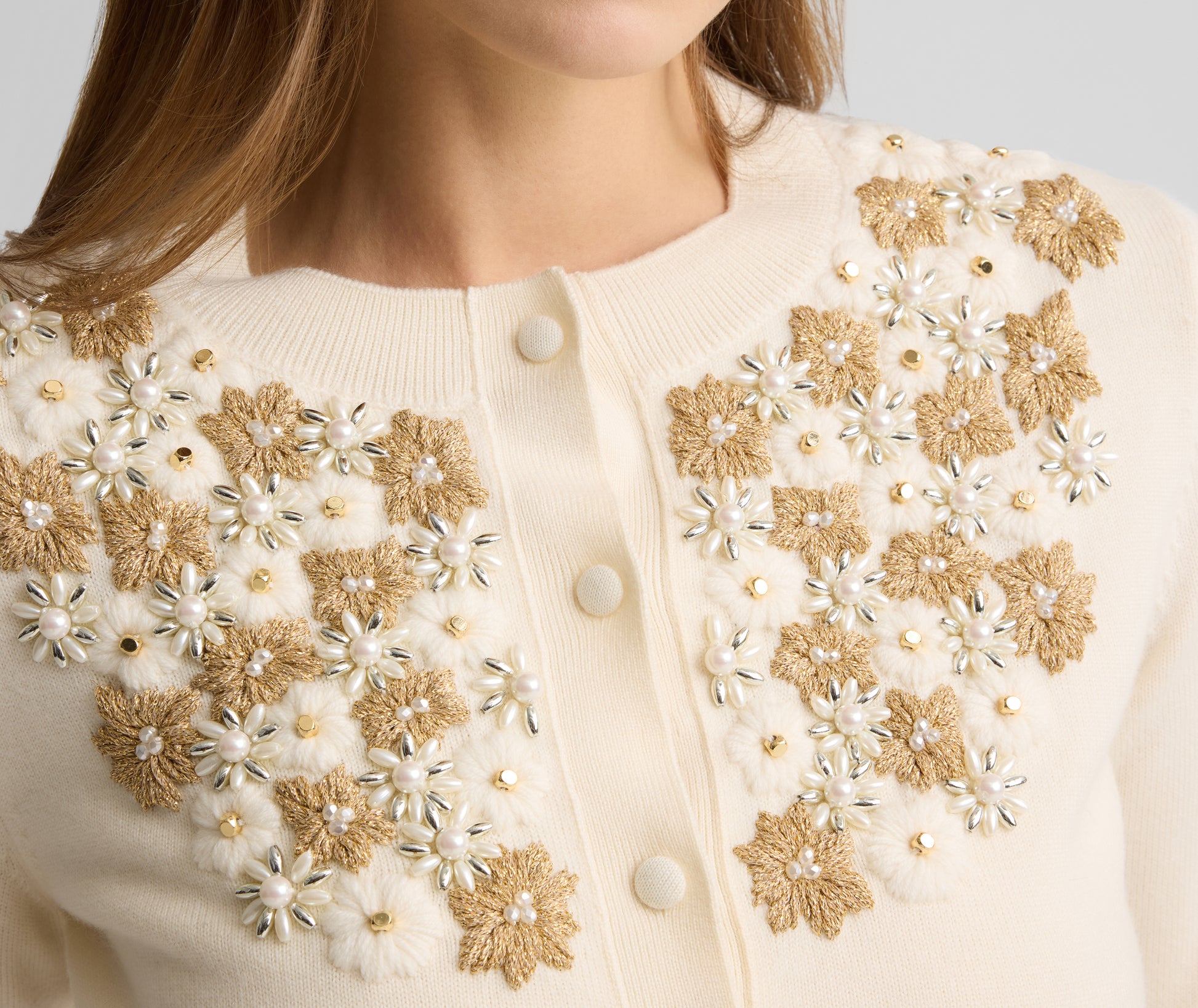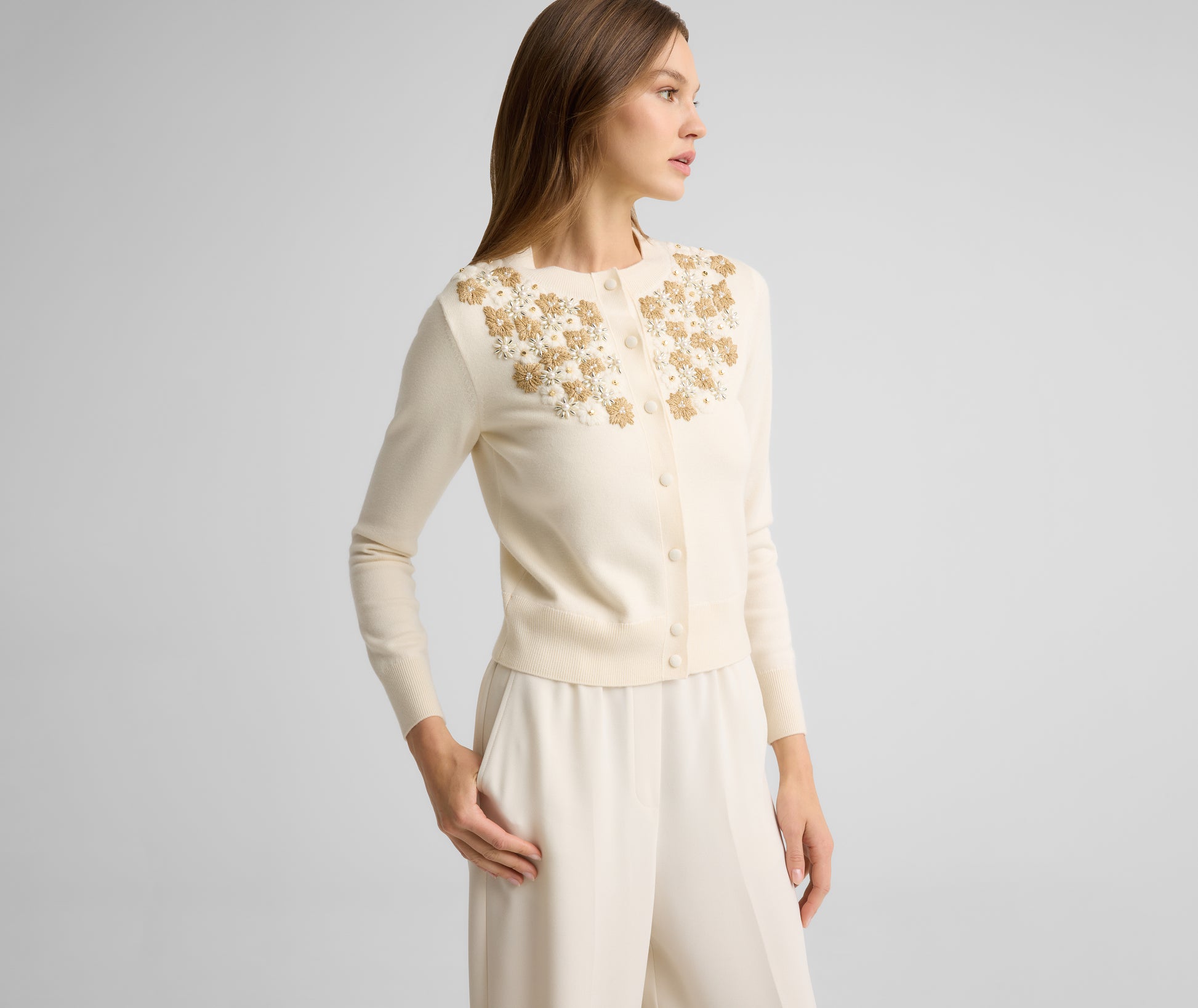 A cardigan like no other in your closet, the Seraphina was meticulously crafted to elevate everything from your go-to denim to sleek pencil skirts and beyond. Made from a whisper soft wool silk blend in versatile Ecru with delicate embroidery and hand beading in an intricate floral motif, this clean and classic silhouette shines with every thoughtful detail.
