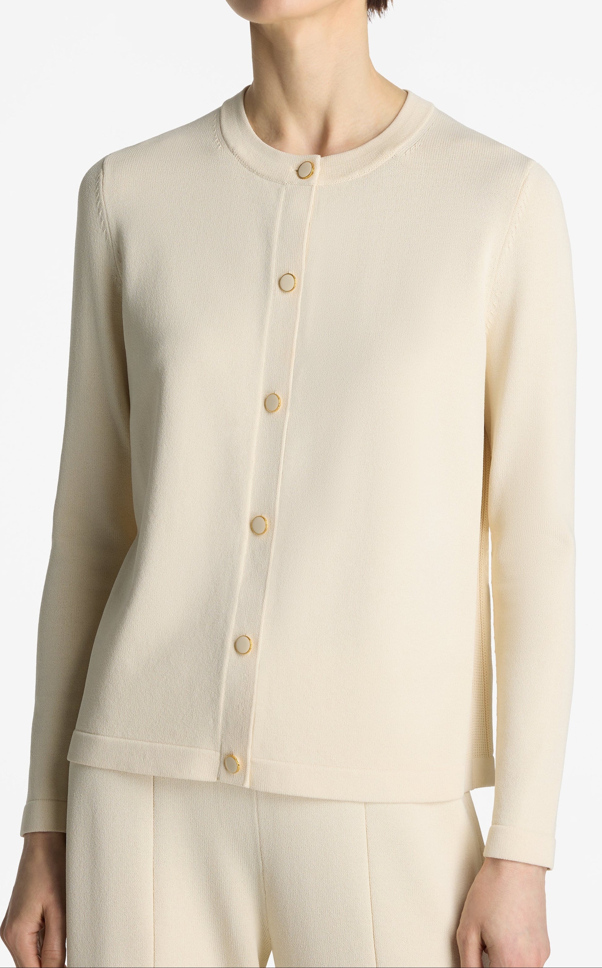Meet your new favorite cardigan. Crafted in Santiago Knit and dotted with St. John's signature buttons, this innovative weave holds its shape in this forever classic sweater.