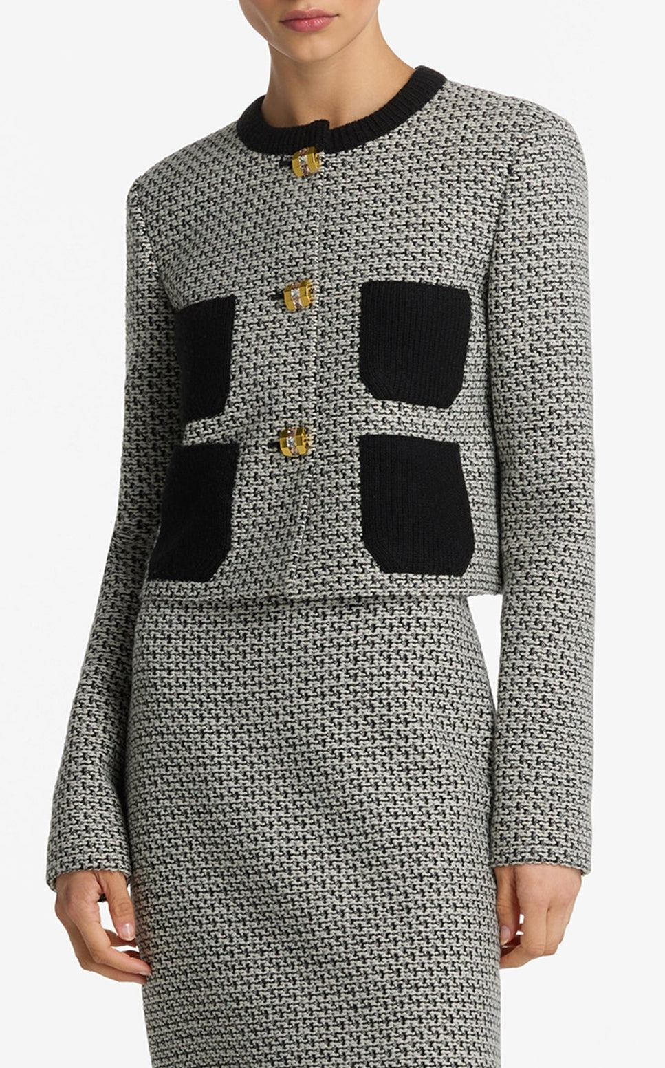 A contrast neckline and patch pockets dress up this textured Italian tweed knit short jacket, finished with large buttons up the front.