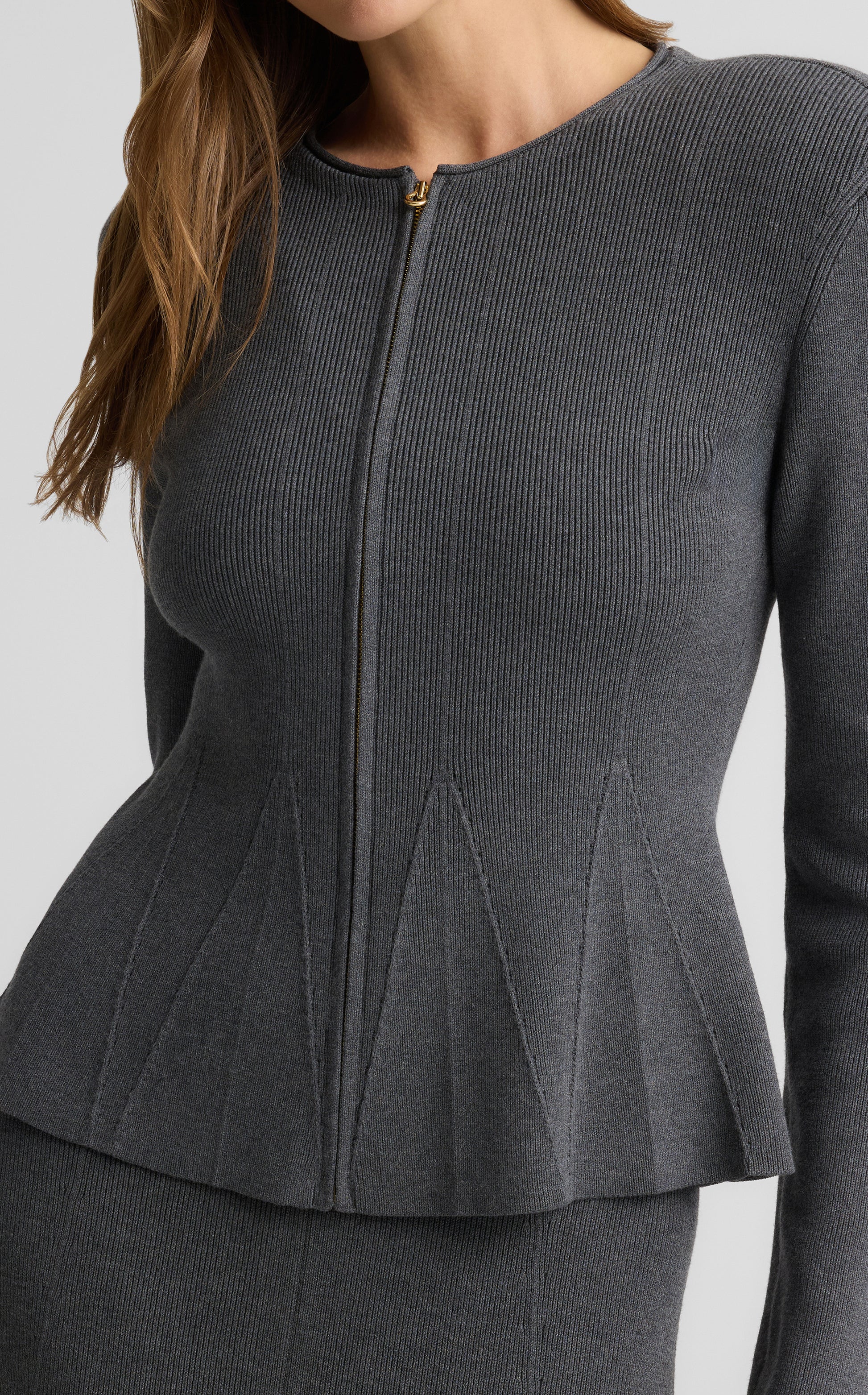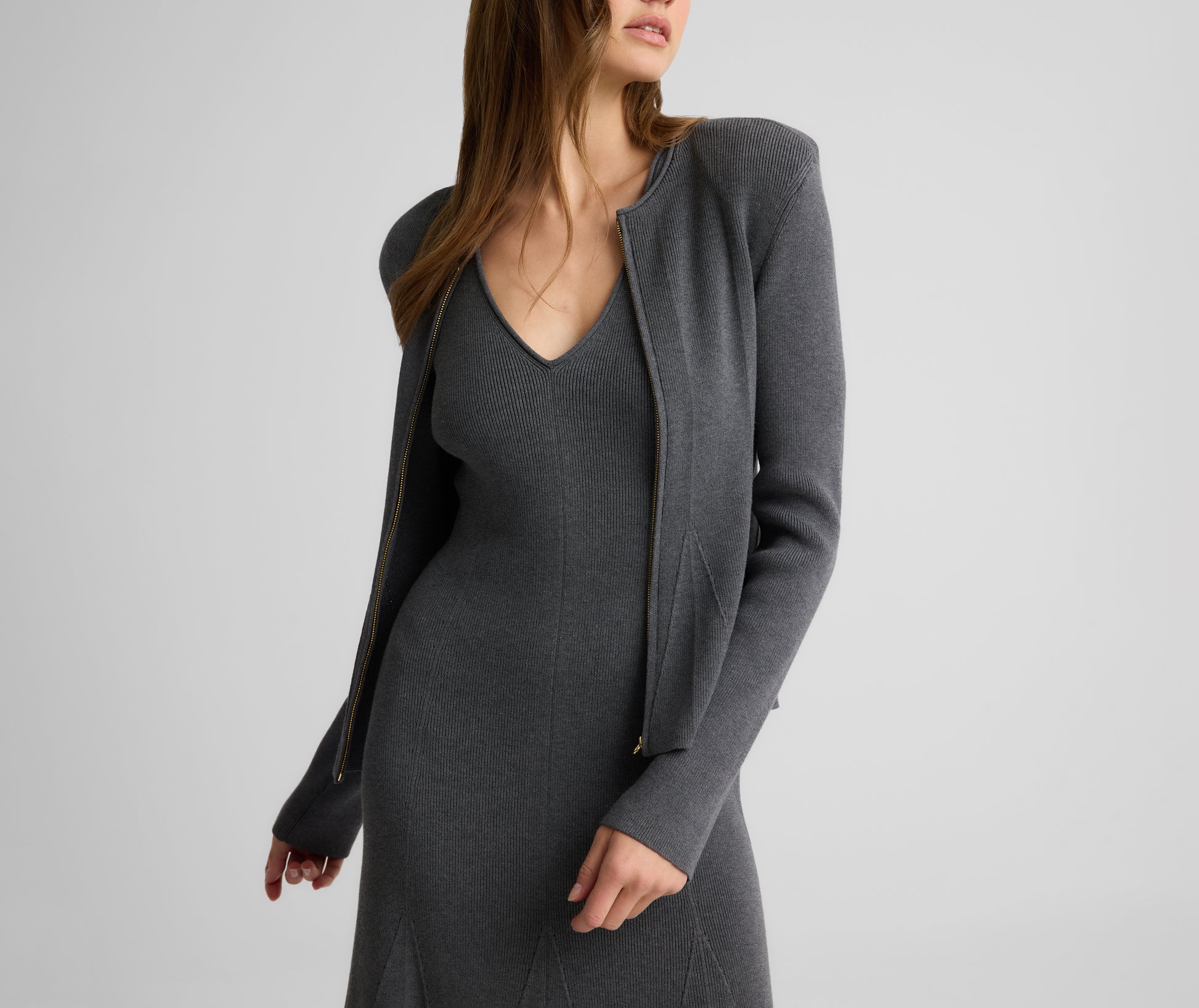 The Maura redefines power dressing by perfectly balancing softness and strength. With its structured shoulders and godet details, this zip-up jacket presents a defined shape while the delicate ribbed knit offers a flexible, comfortable fit. Layer over the Velma Dress for a bold and refreshing alternative to traditional suiting.