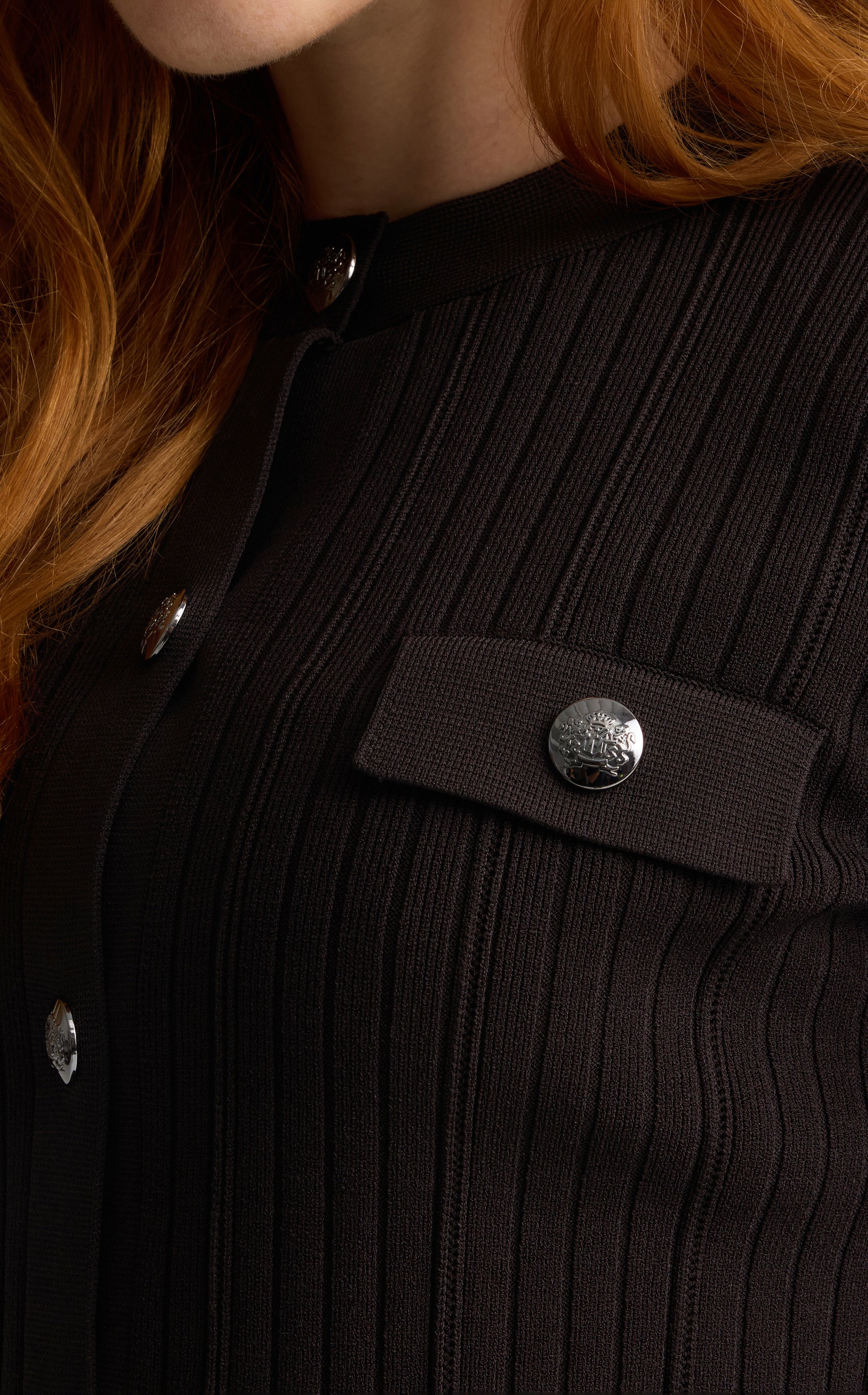 Sleek yet soft, the Libby combines a tailored silhouette with a flexible fit, courtesy of our curve-hugging Robinson Rib Knit. Finished with lustrous metallic buttons and decorative pockets, this jacket adds a luxurious lightweight layer to casual and formal attire alike.