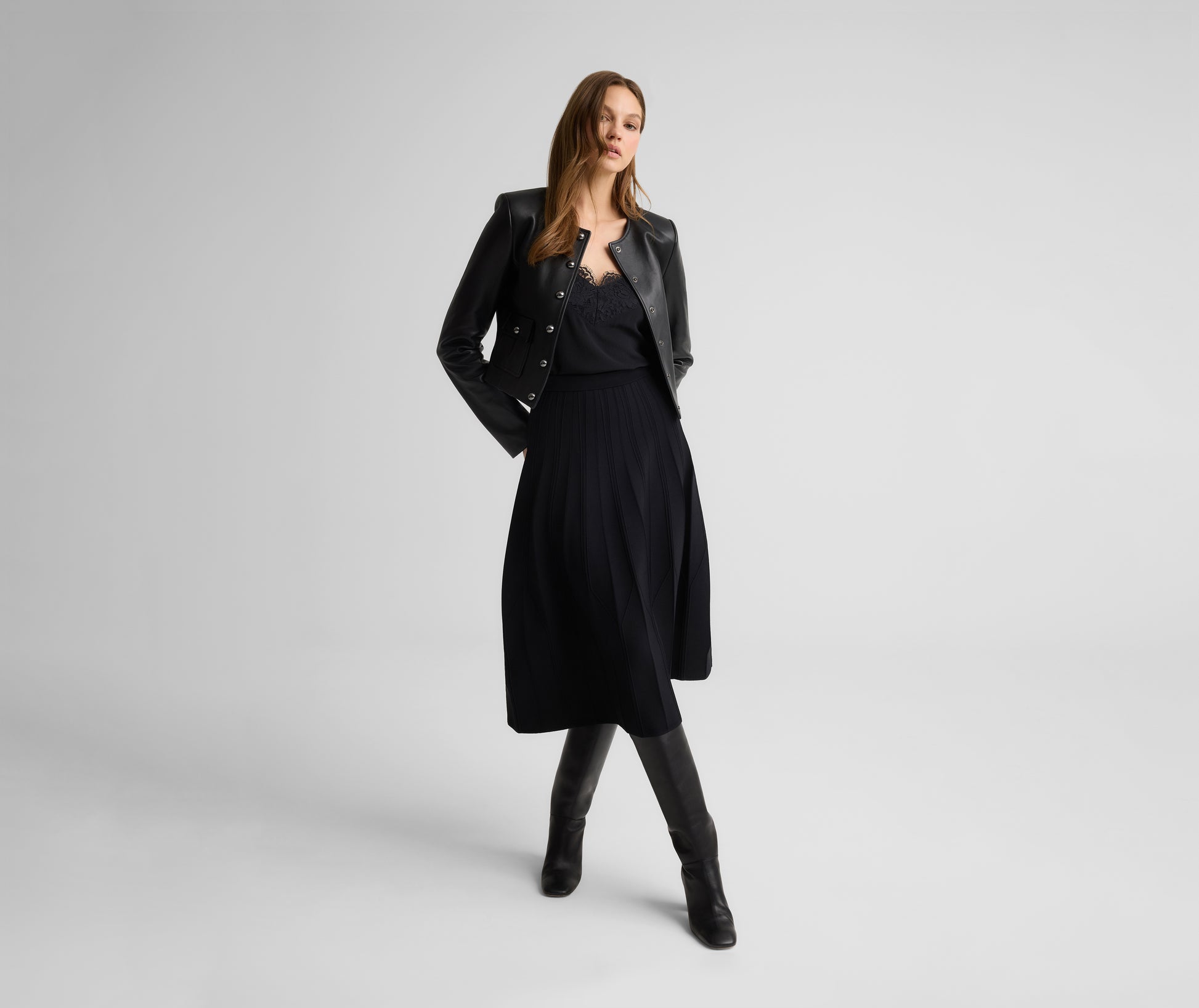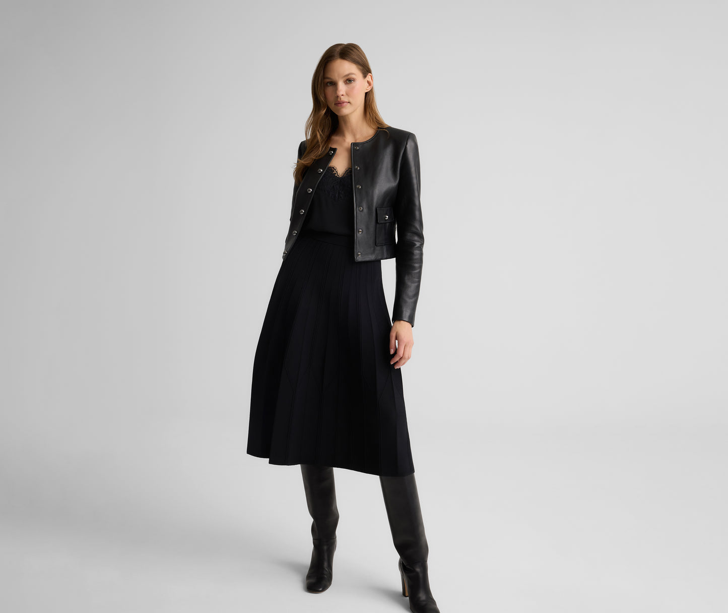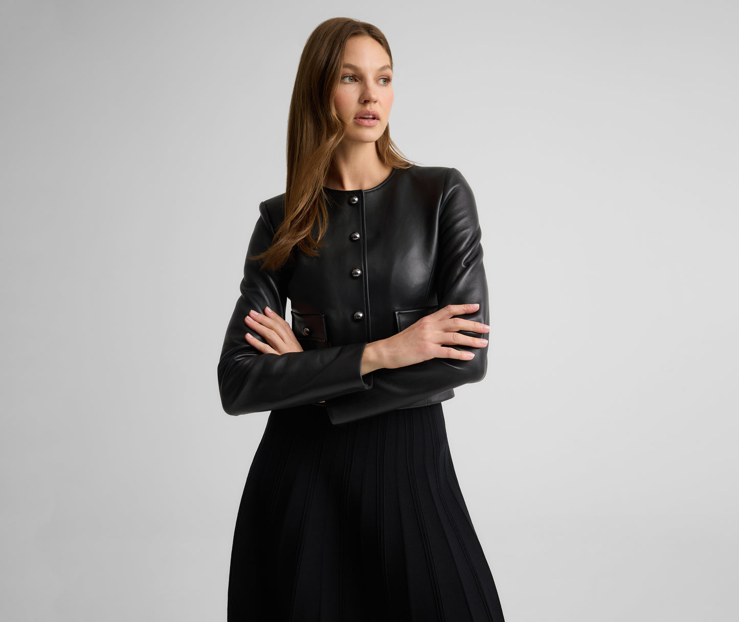 The Nadine reimagines the classic leather jacket through a refined lens. A clean silhouette meets an inherently edgy yet luxe material accented with sleek metal buttons, resulting in a bold layer that's both modern and timeless. Wear with the Leona Pant for a head-to-toe leather look, or over lace trimmed camisoles for a cool contrast.