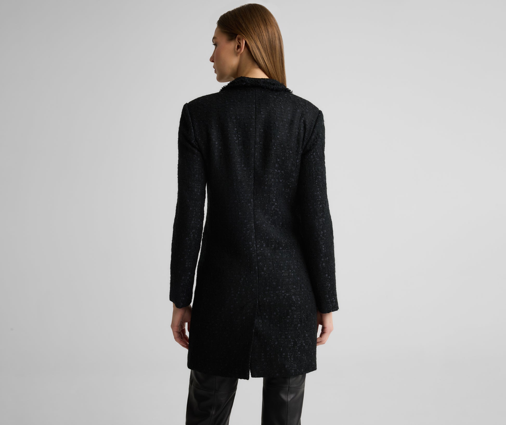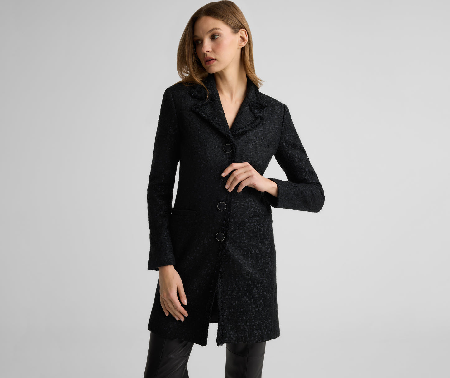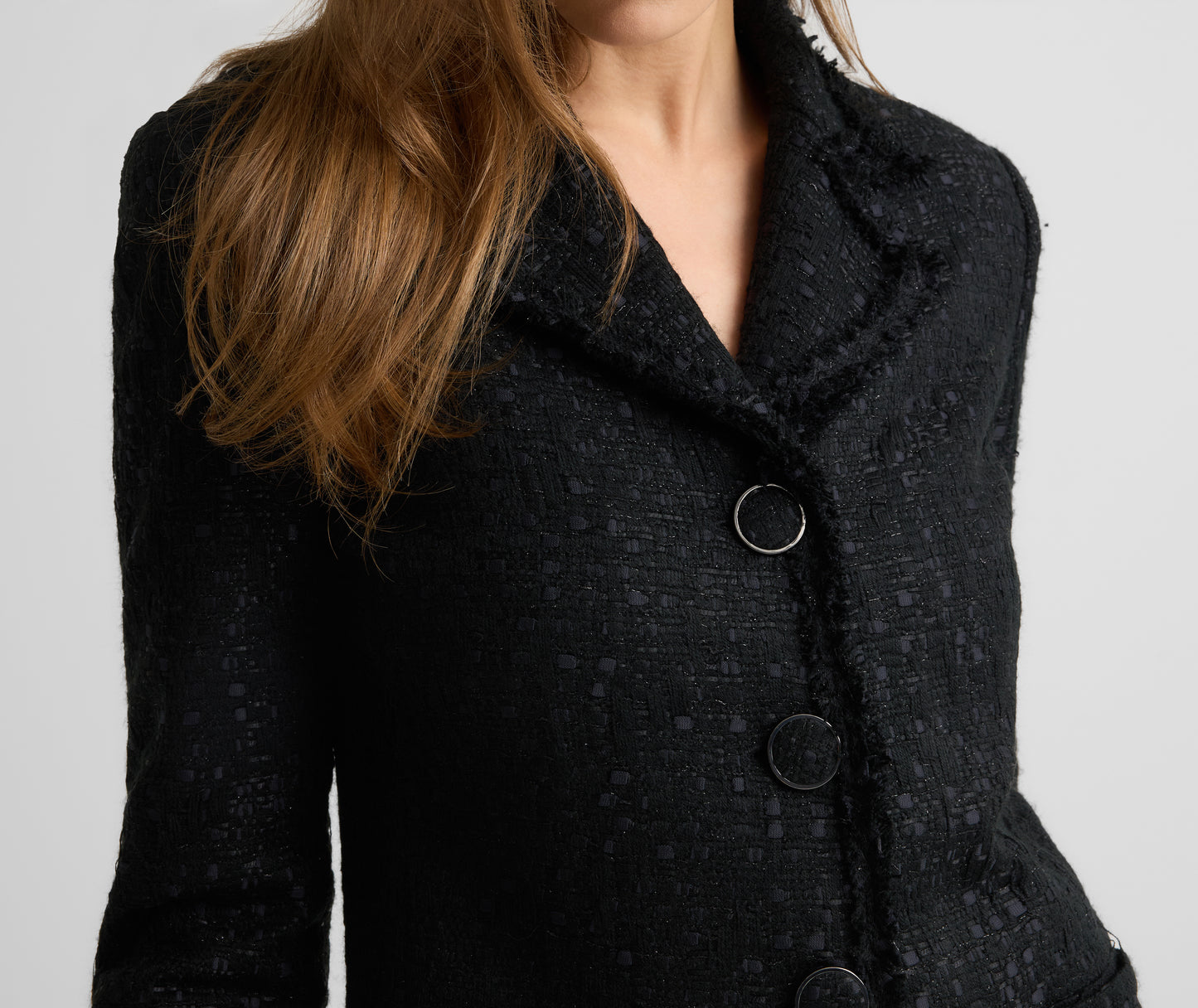 Complete your look with the Hattie for instant polished perfection. This thigh-length jacket is cut from subtly dimensional Canyon Tweed in classic Black and finished with fabric-covered buttons and fringed trim for an elevated effect, whether layered over tailored pants and tops or timeless sheath dresses.