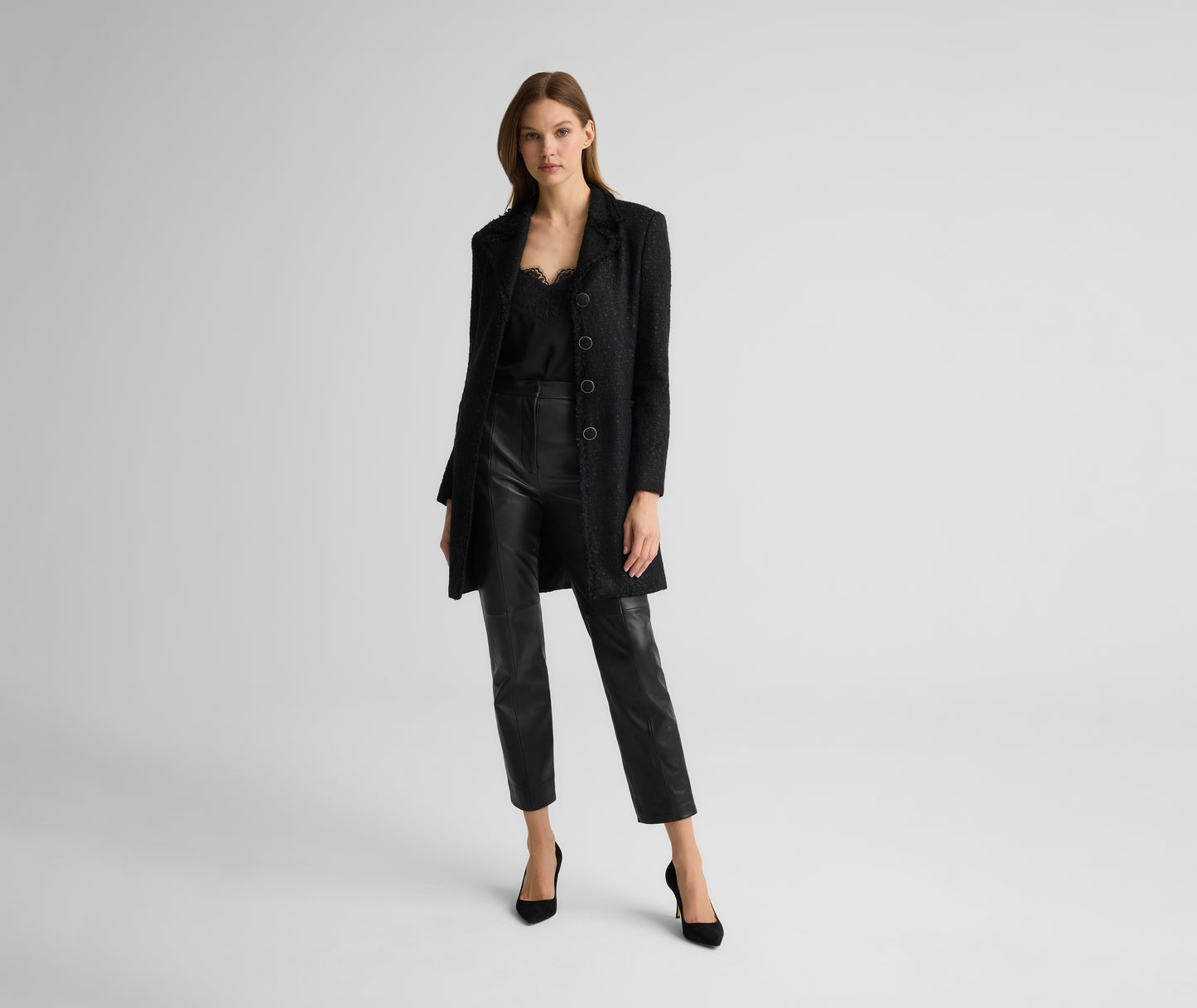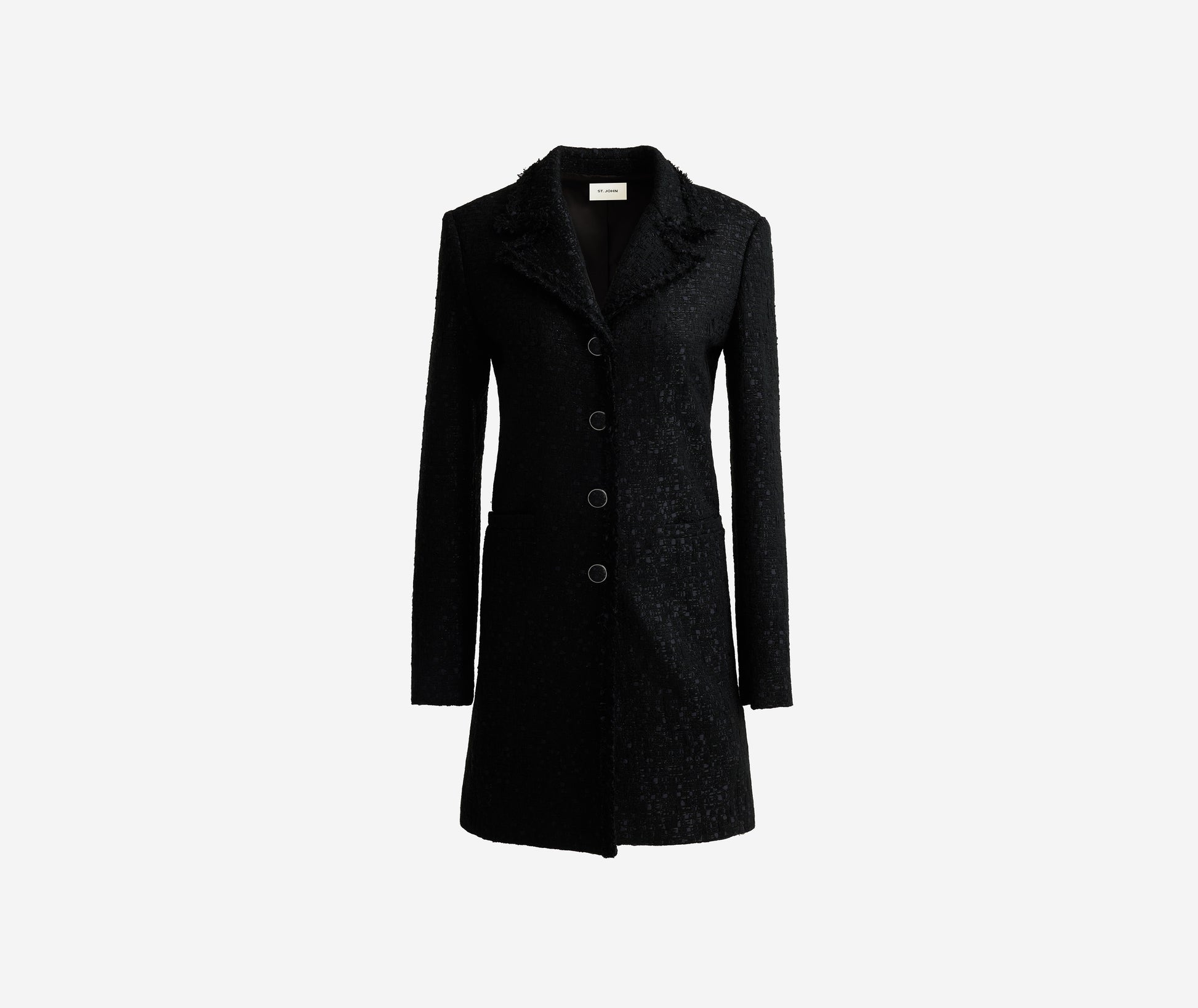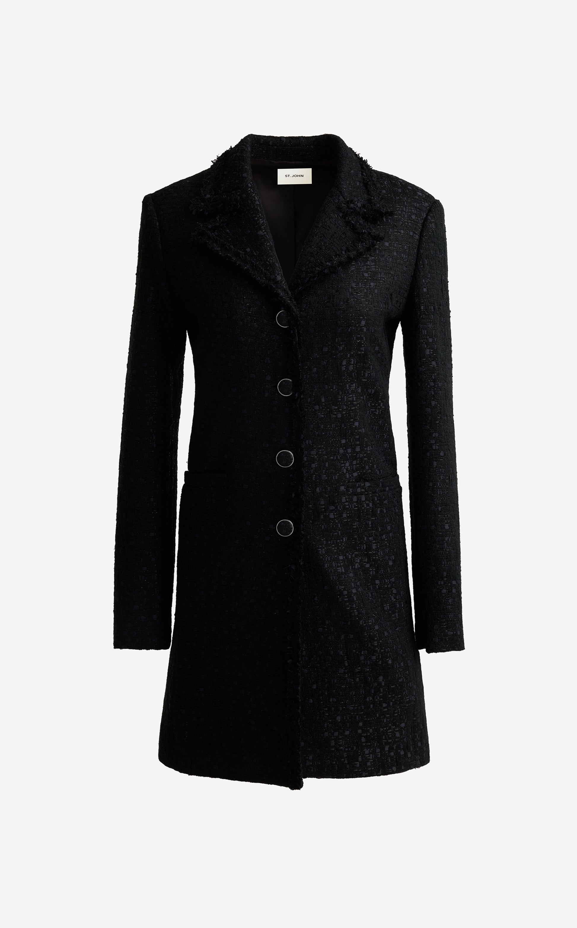 Complete your look with the Hattie for instant polished perfection. This thigh-length jacket is cut from subtly dimensional Canyon Tweed in classic Black and finished with fabric-covered buttons and fringed trim for an elevated effect, whether layered over tailored pants and tops or timeless sheath dresses.