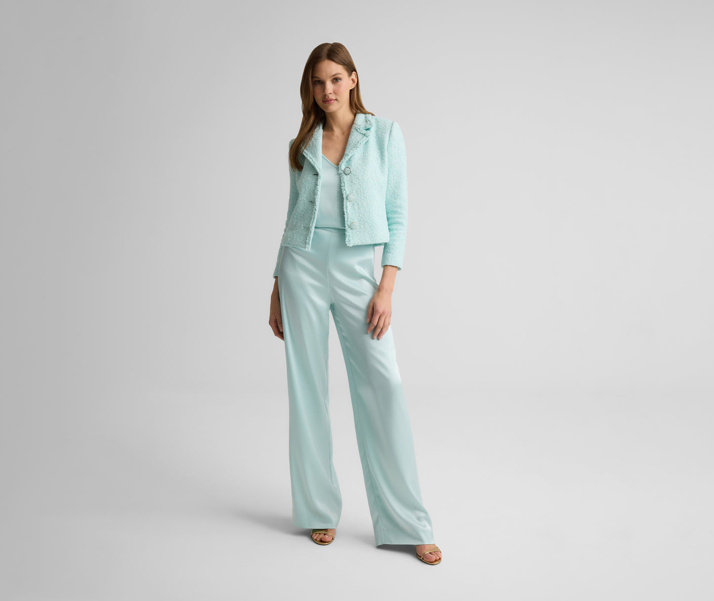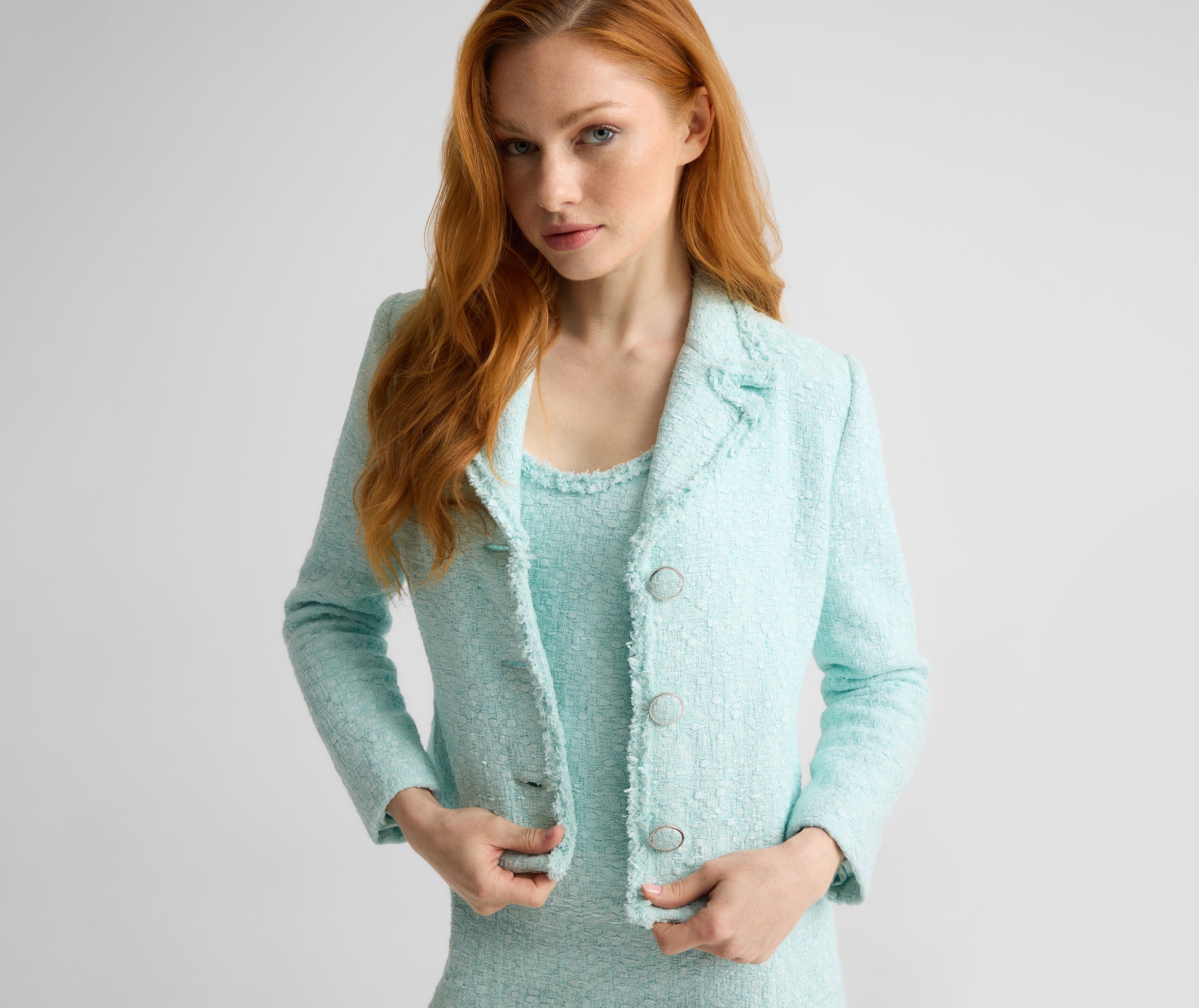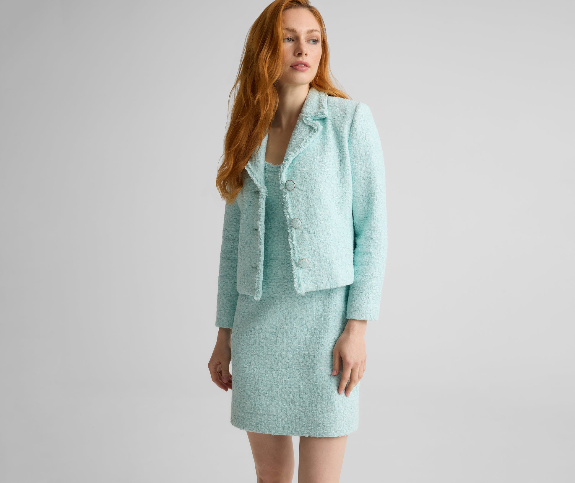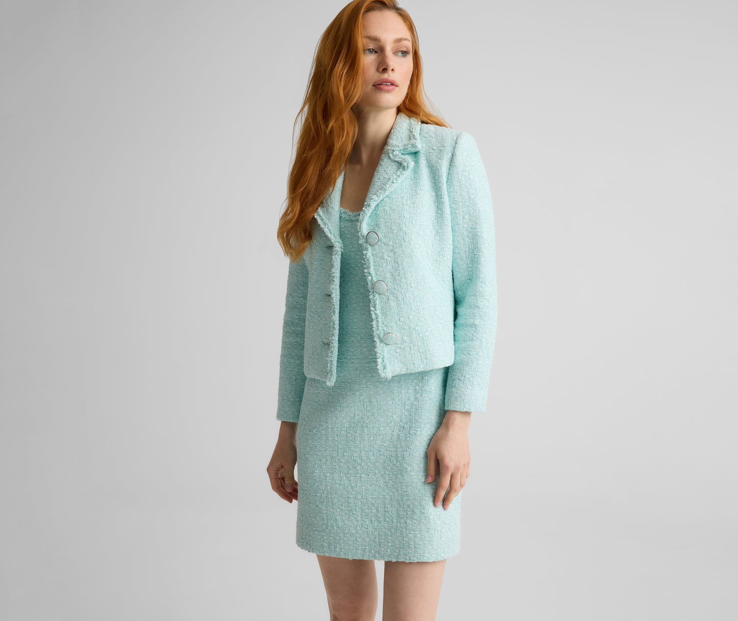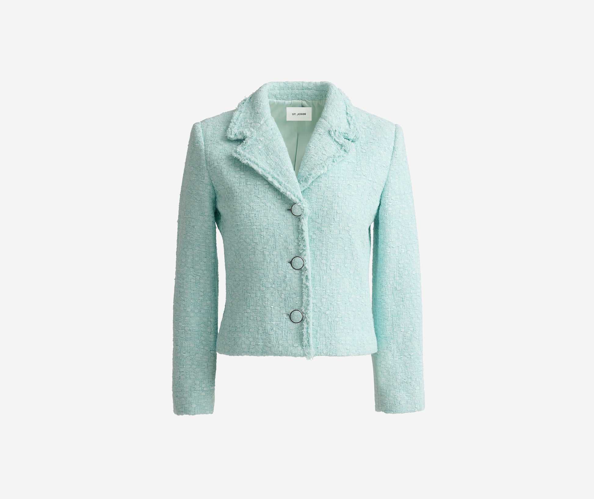 The Clara revisits a staple of the refined woman's wardrobe with St. John's signature touches. Elevated details including gold-rimmed buttons, bracelet-length sleeves, and fringed trim makes this boxy tweed jacket a luxurious layer to top off denim and casual tops, but it also pairs with the Dorene Dress to make the most sophisticated set.
