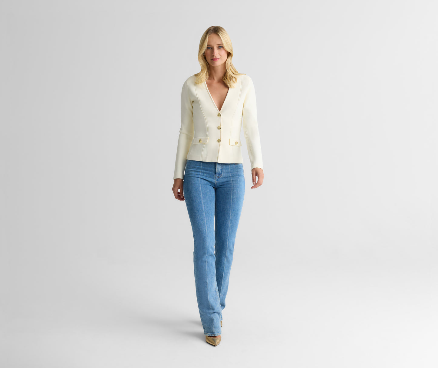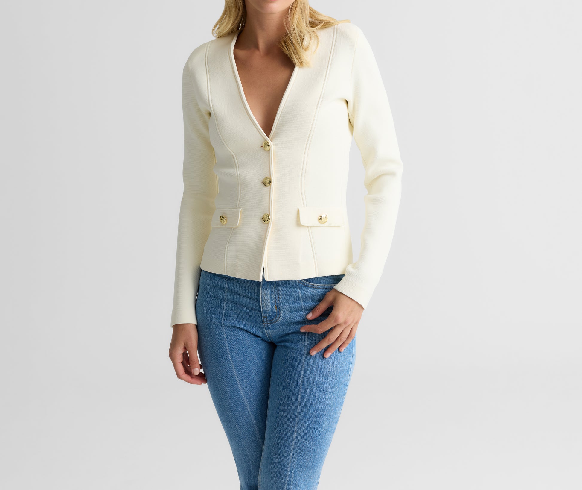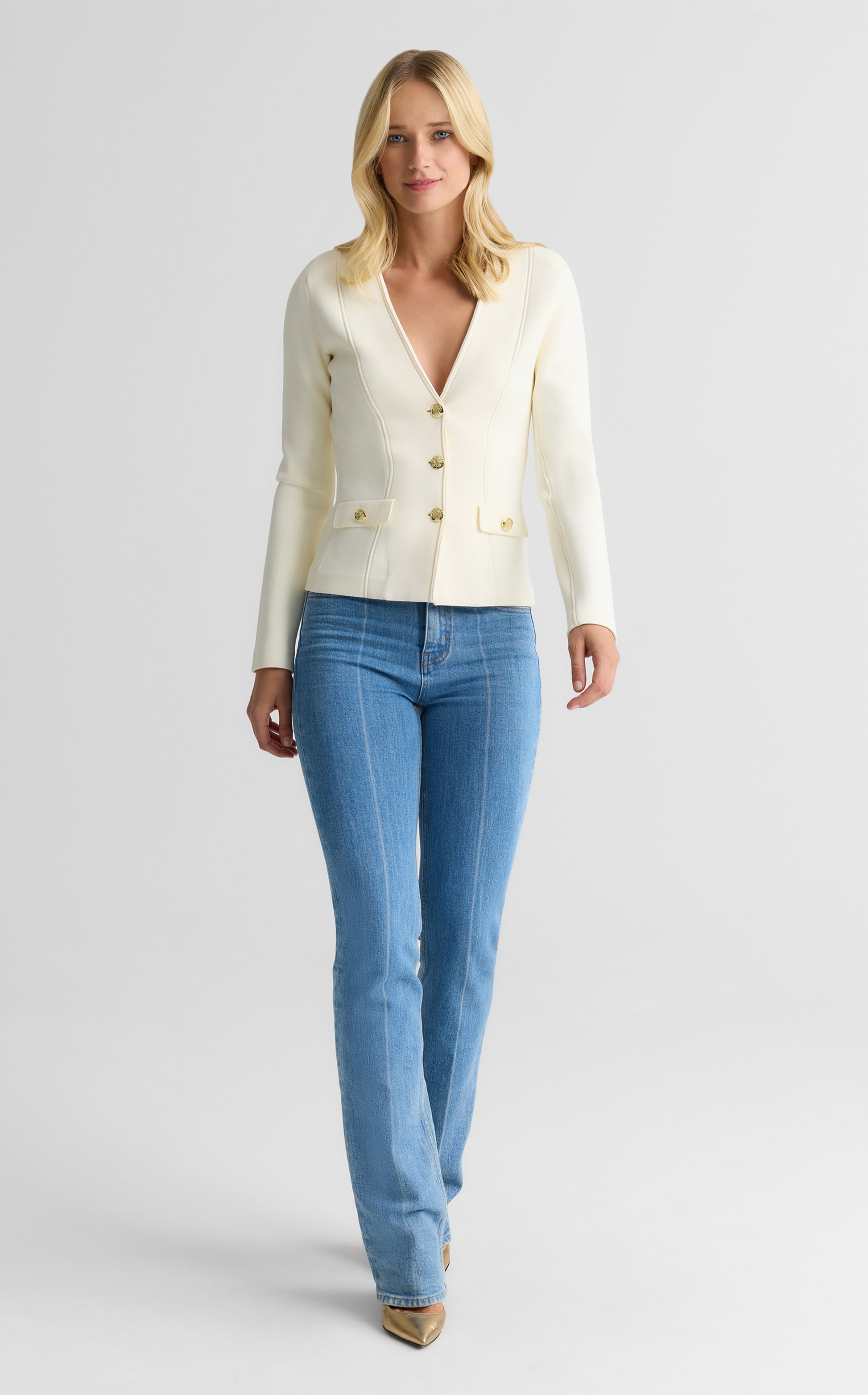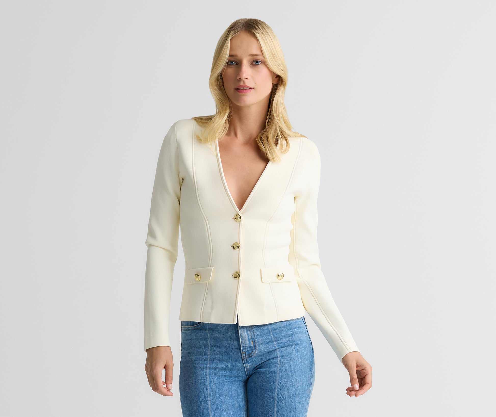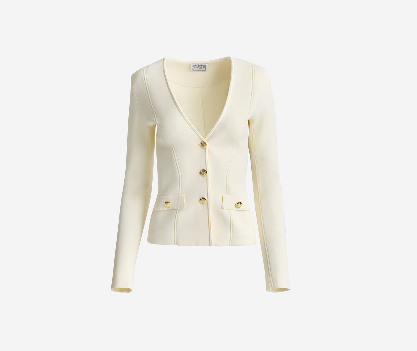 Inspired by an archival design and updated for the modern woman, the Kay is a timeless style laced with nostalgia. Santa Roma Knit in crisp Ecru gives this clean, flattering jacket its sleek look and flexible fit that takes you from the office to off-duty with the utmost ease—especially when paired with the coordinating Nina Skirt.