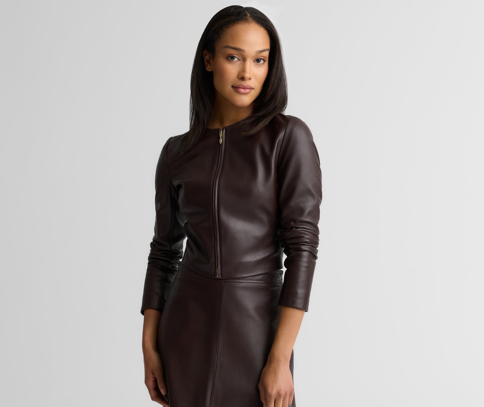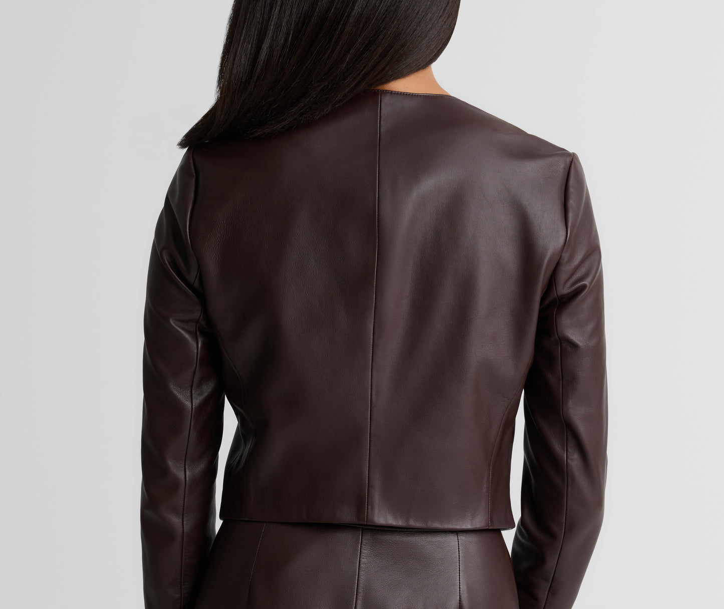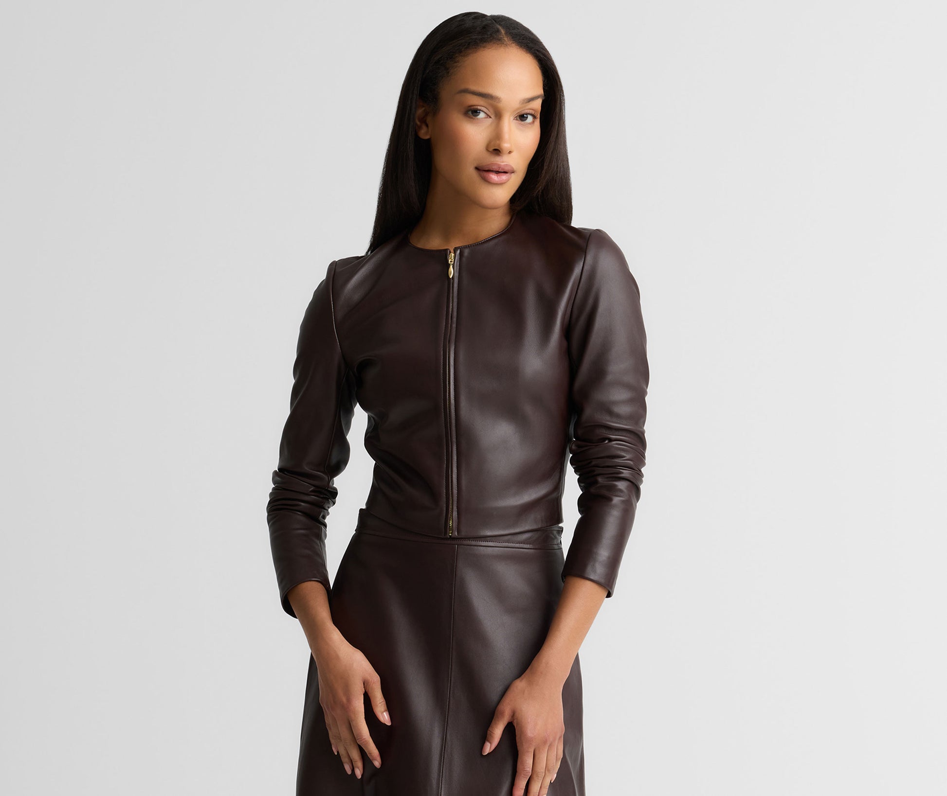 The Clarissa effortlessly combines understated edge with timeless sophistication. This buttery soft Nappa leather jacket features a clean, cropped silhouette that pairs perfectly with the coordinating Rowan Skirt, but also adds a refined toughness to everything from denim and floaty dresses.