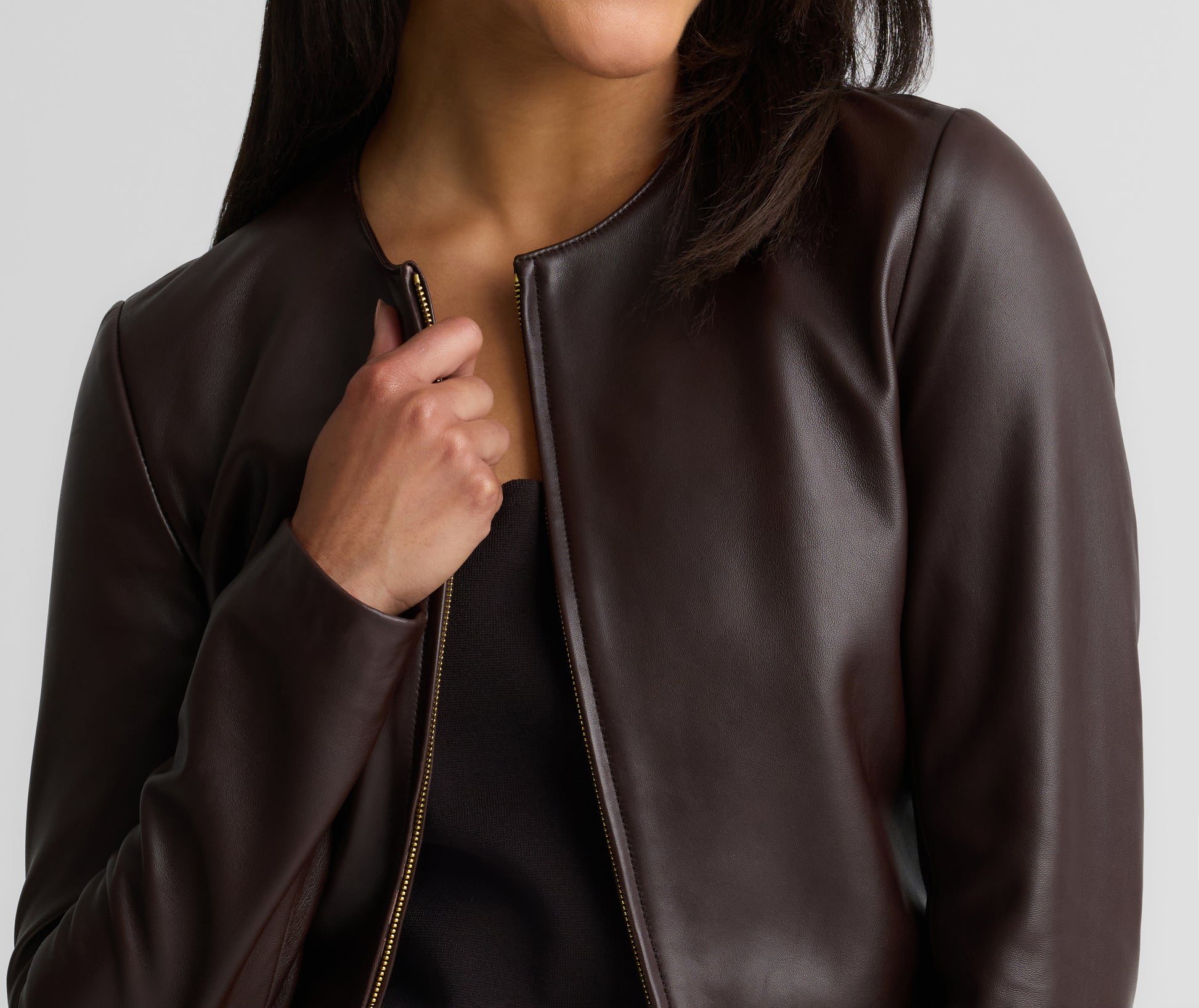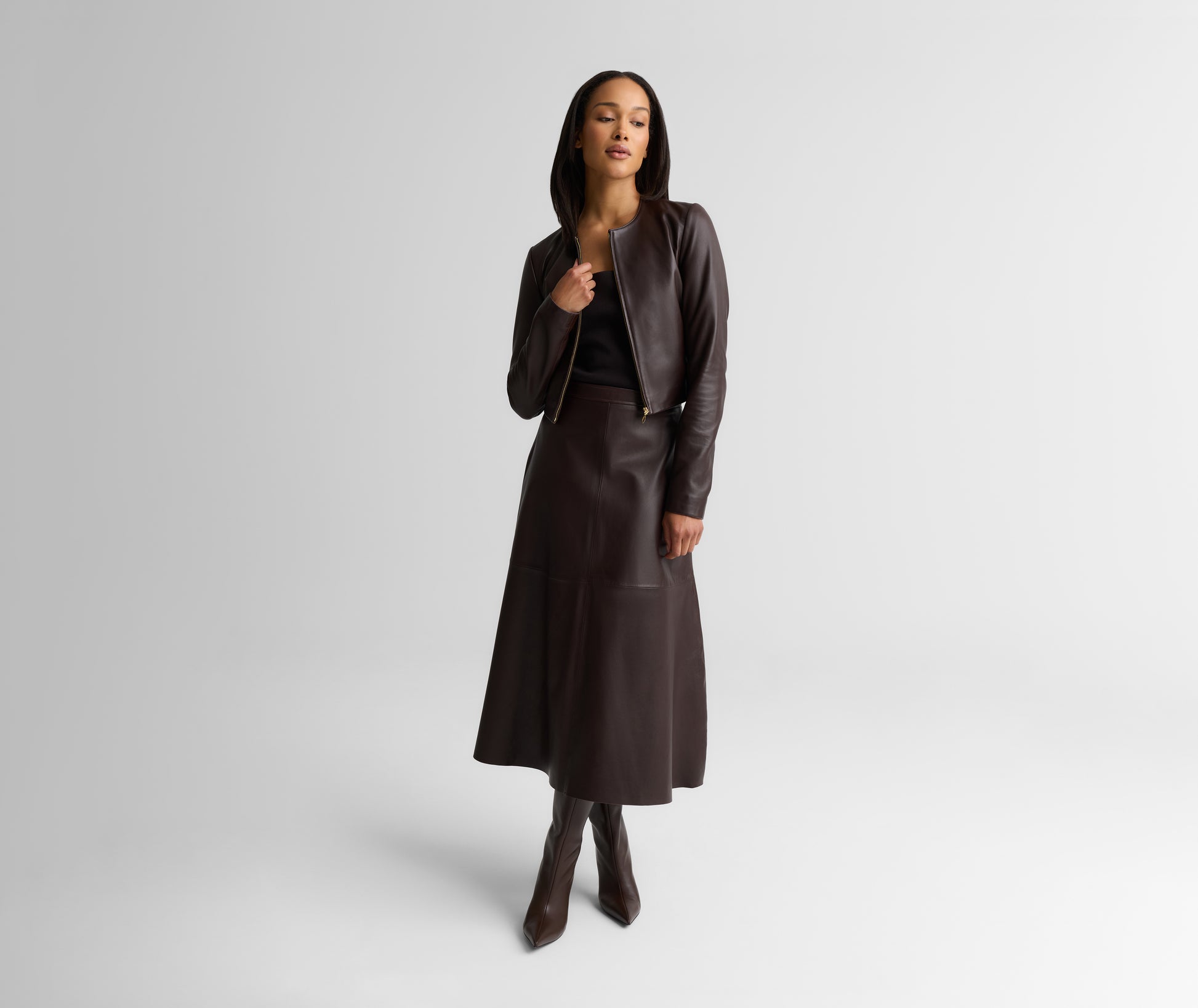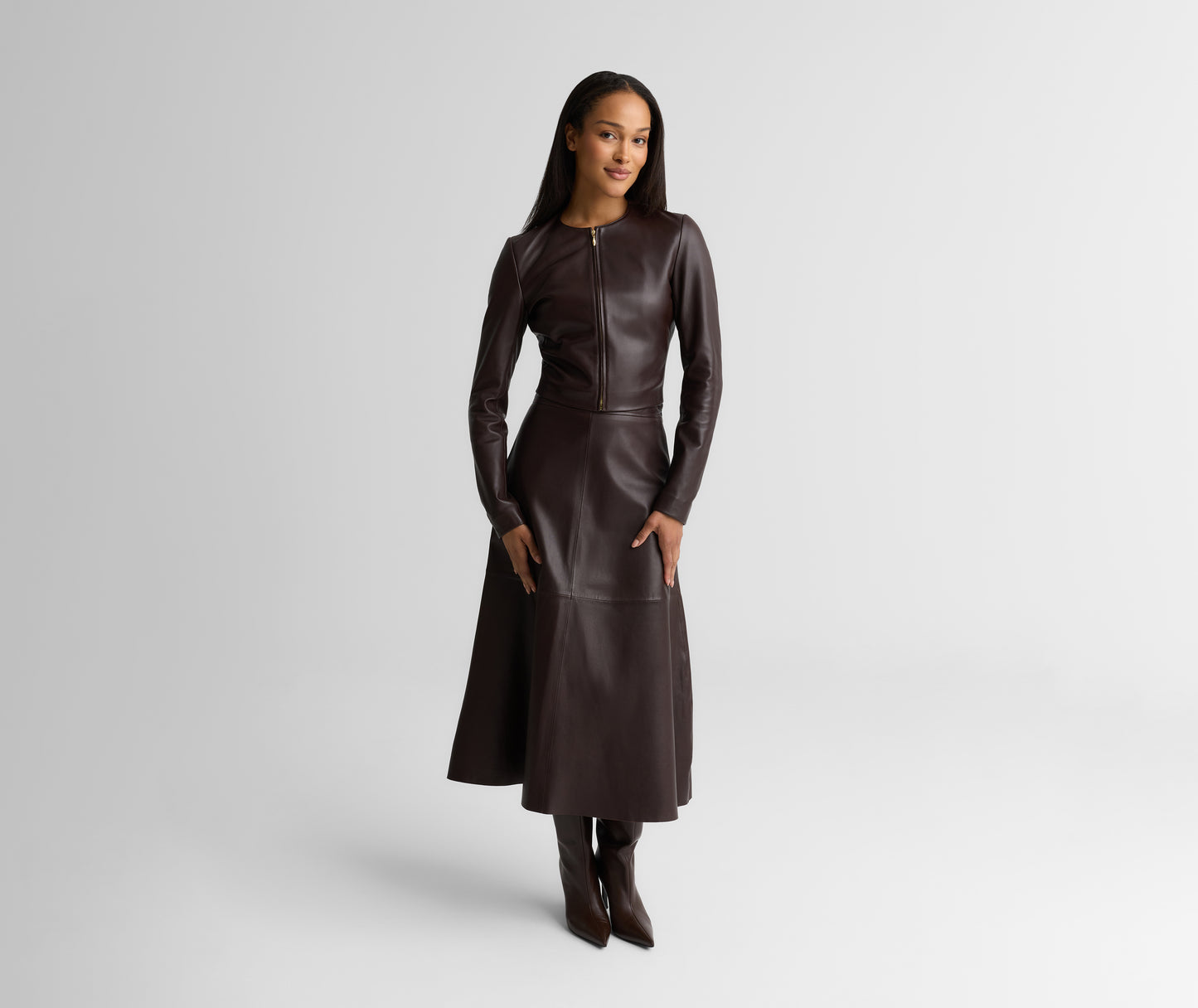 The Clarissa effortlessly combines understated edge with timeless sophistication. This buttery soft Nappa leather jacket features a clean, cropped silhouette that pairs perfectly with the coordinating Rowan Skirt, but also adds a refined toughness to everything from denim and floaty dresses.