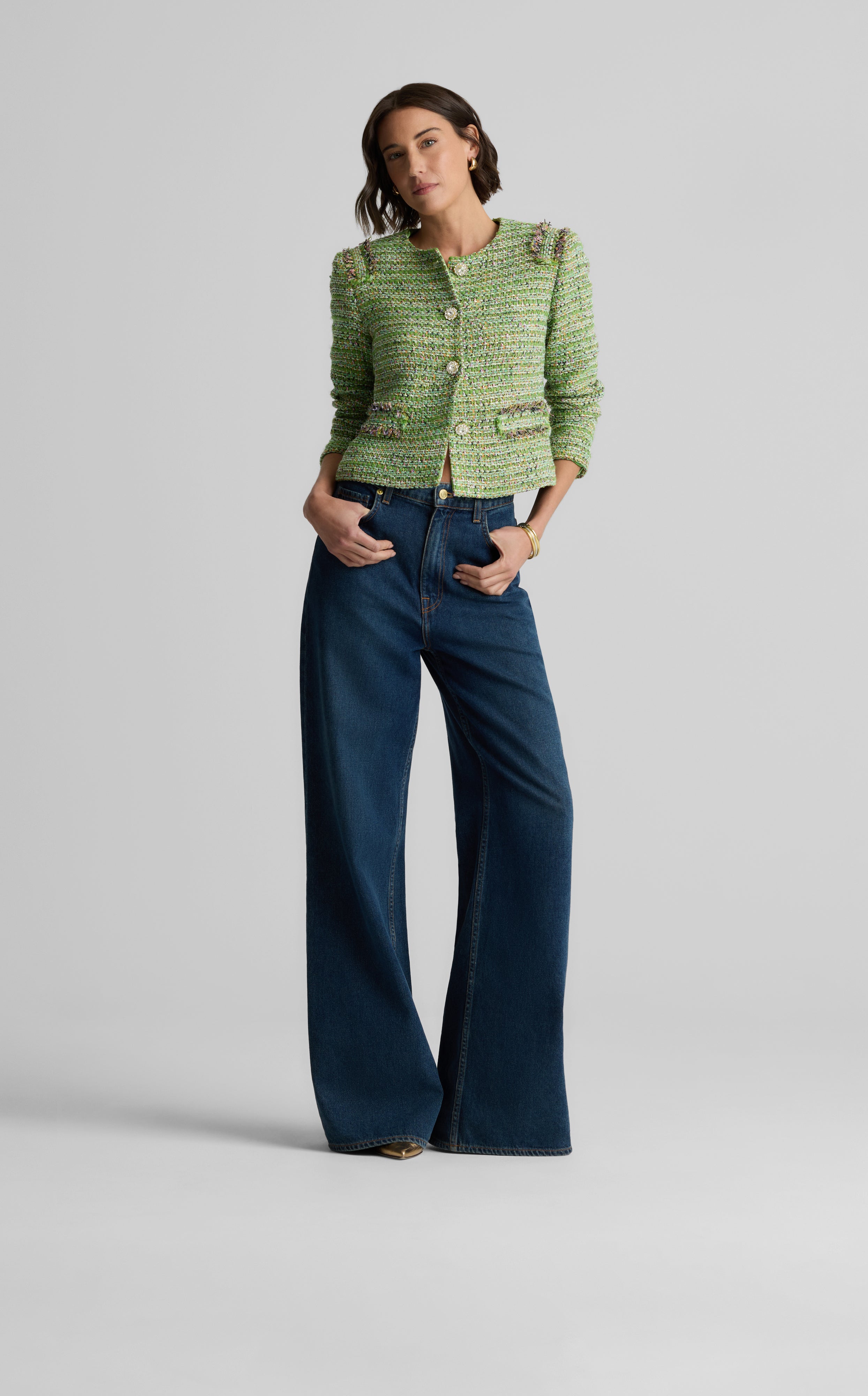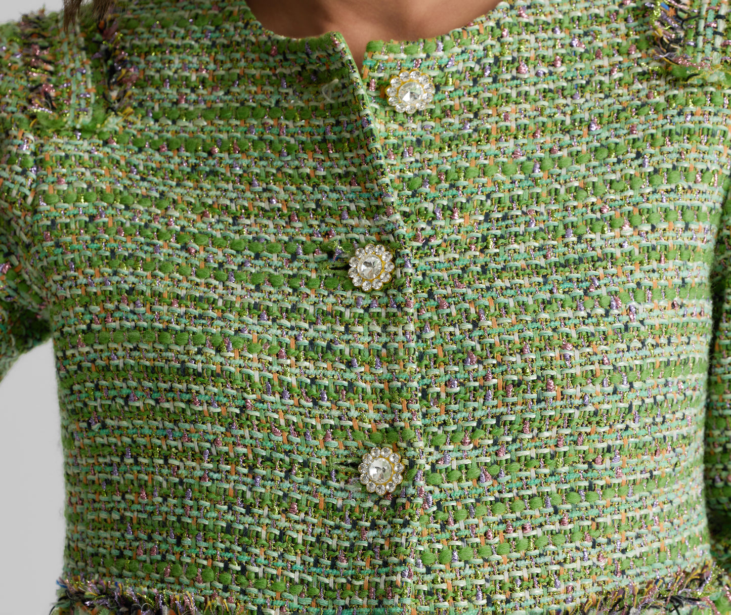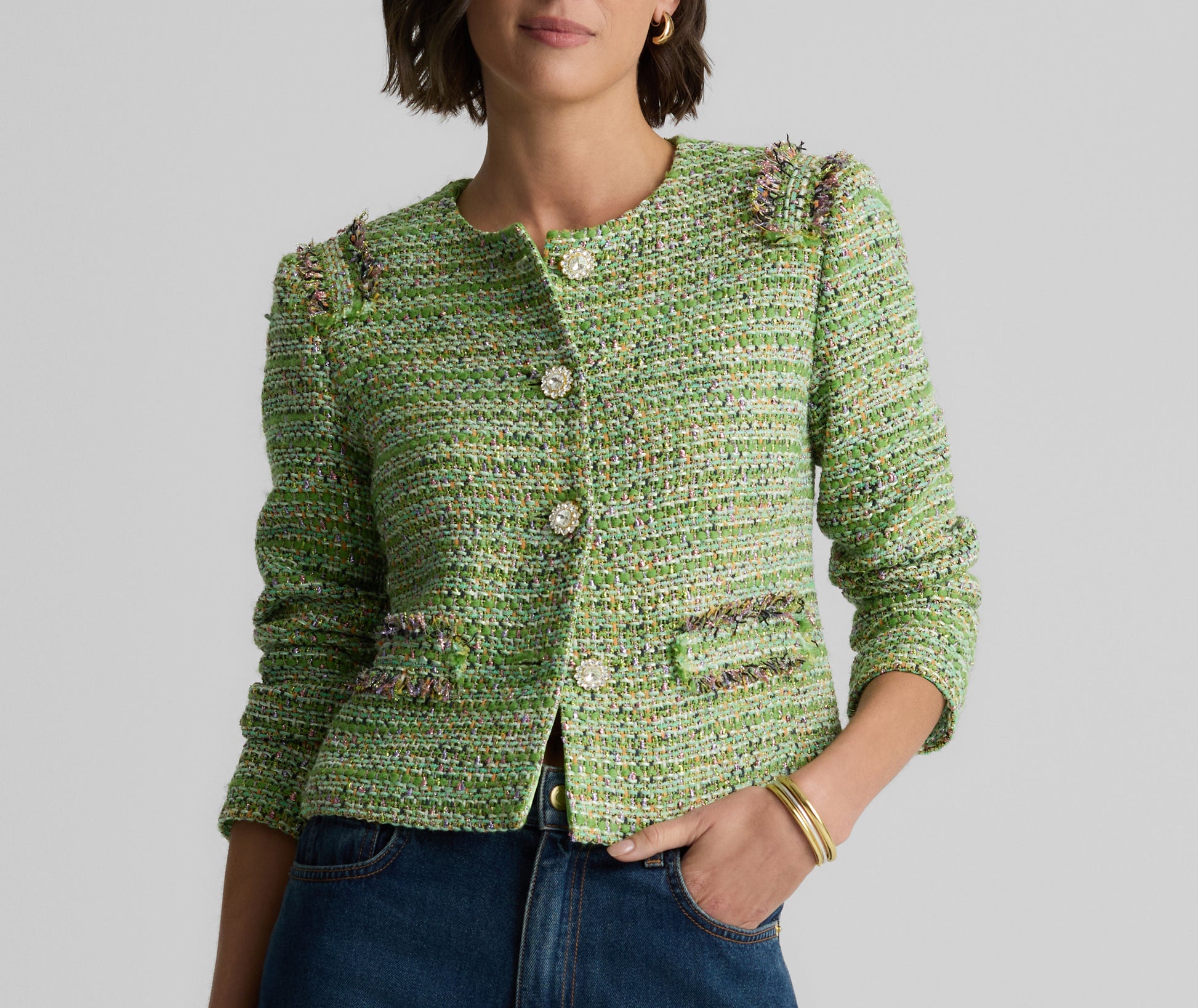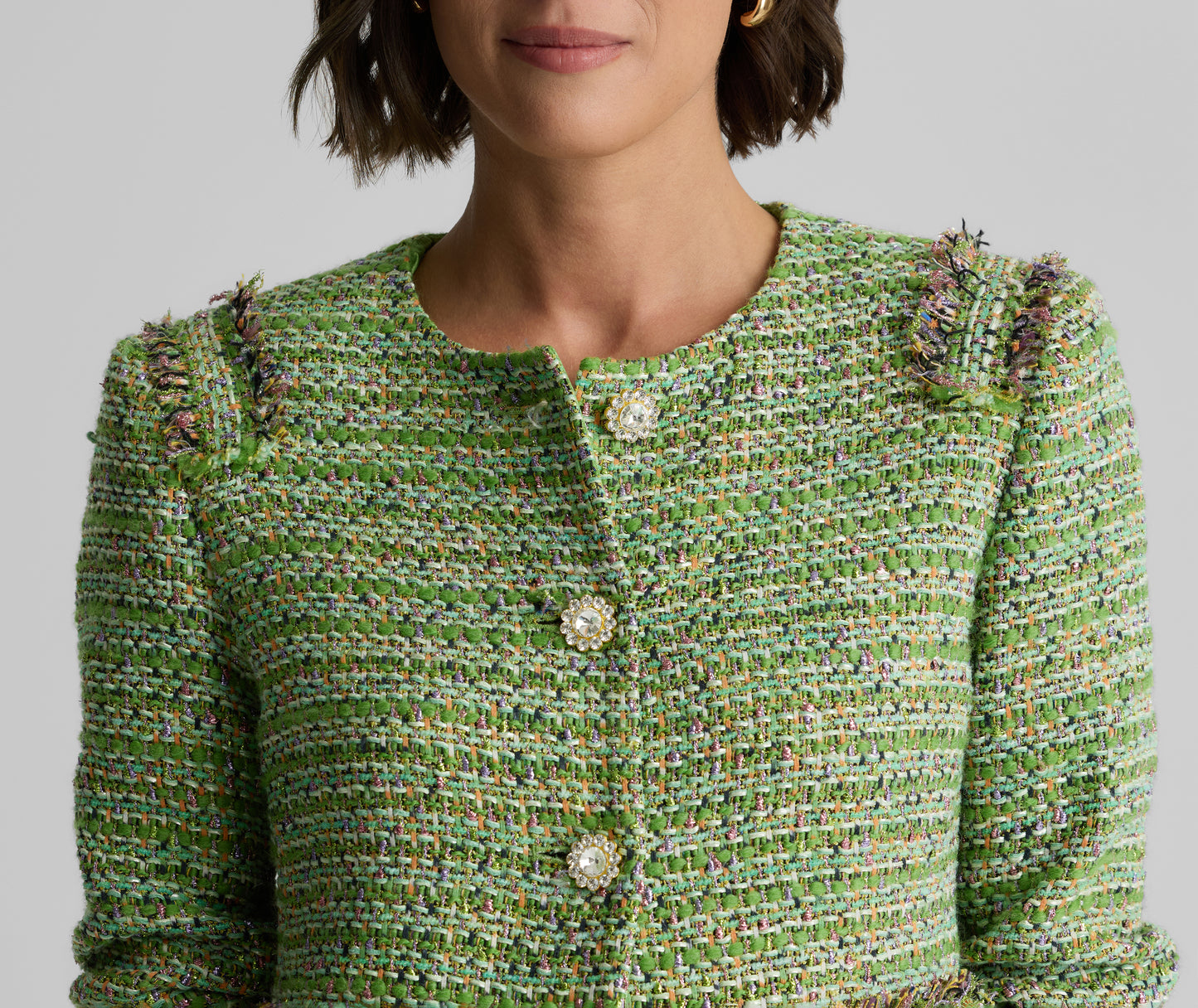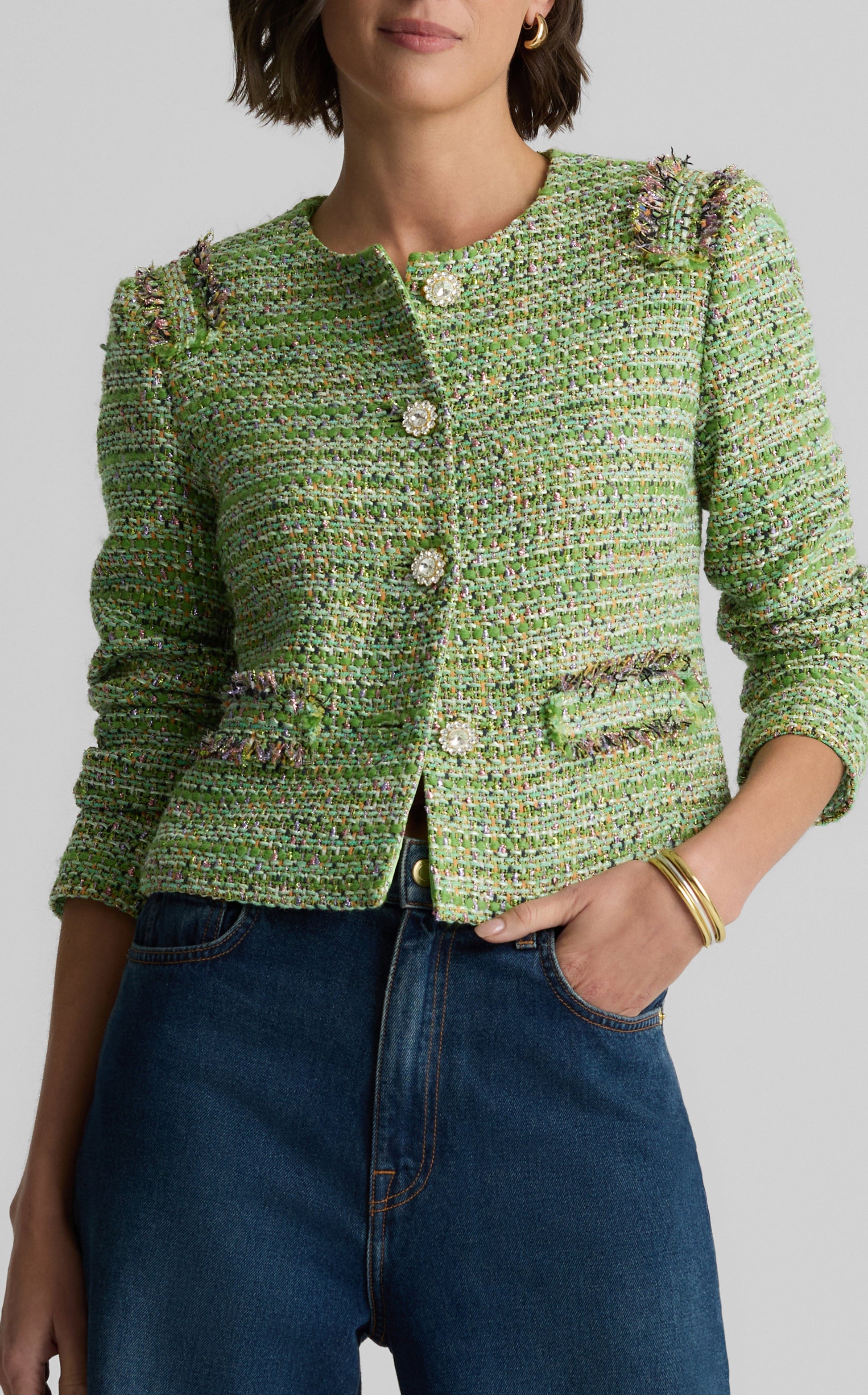 The Arden takes a timeless tweed staple to glamorous new heights. Made in our metallic striped Lenox Tweed and embellished with bejeweled buttons and fringe detail, this crewneck, straight sleeve jacket makes for a striking addition to your evening wear collection.