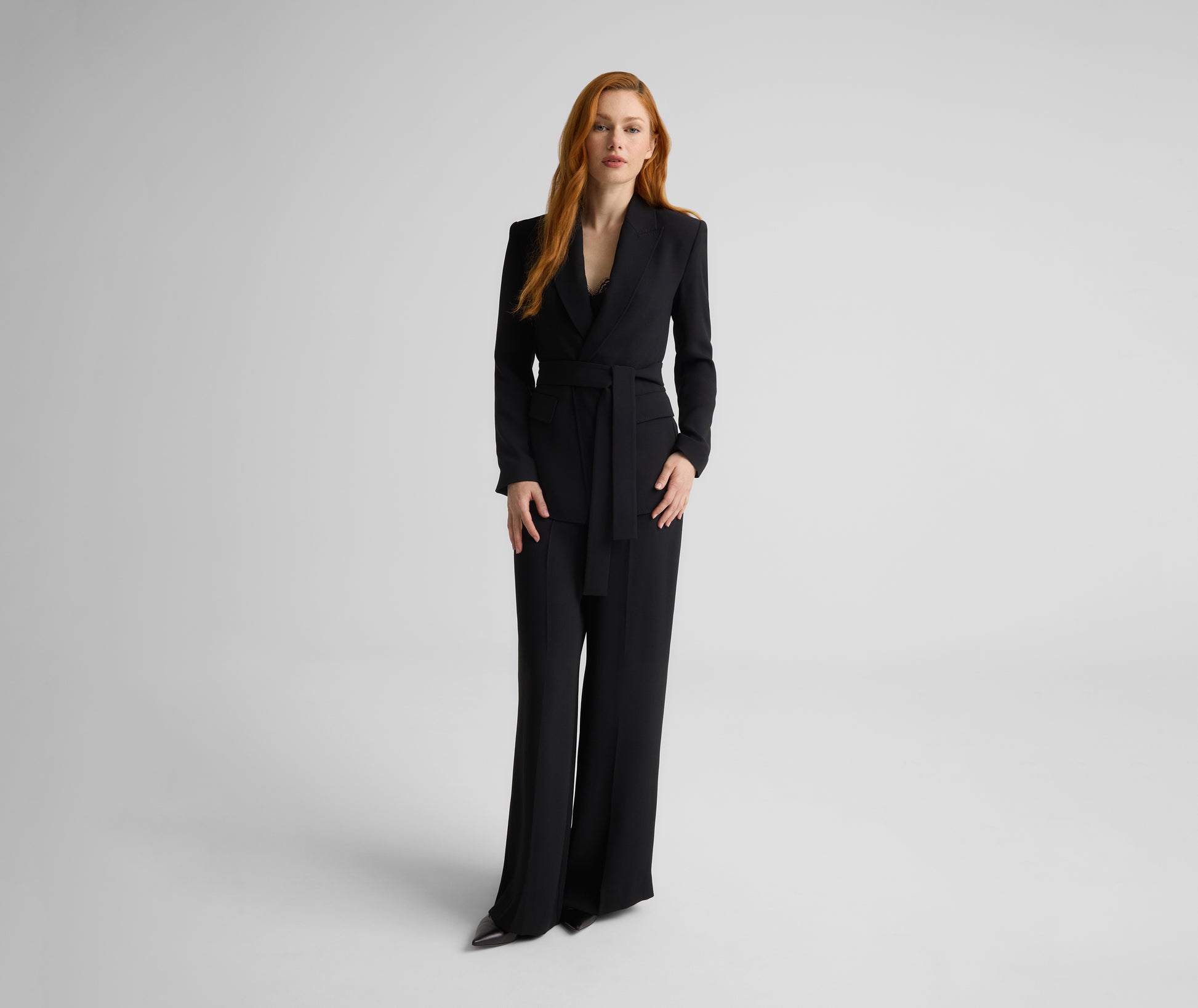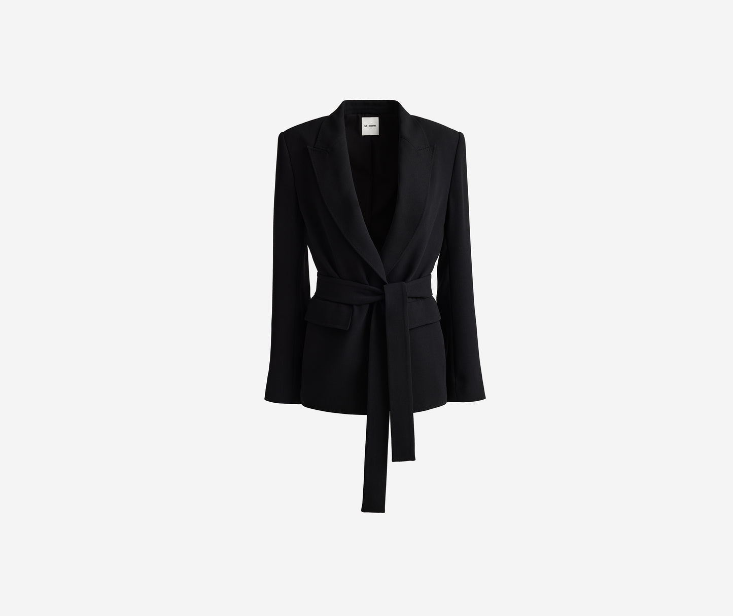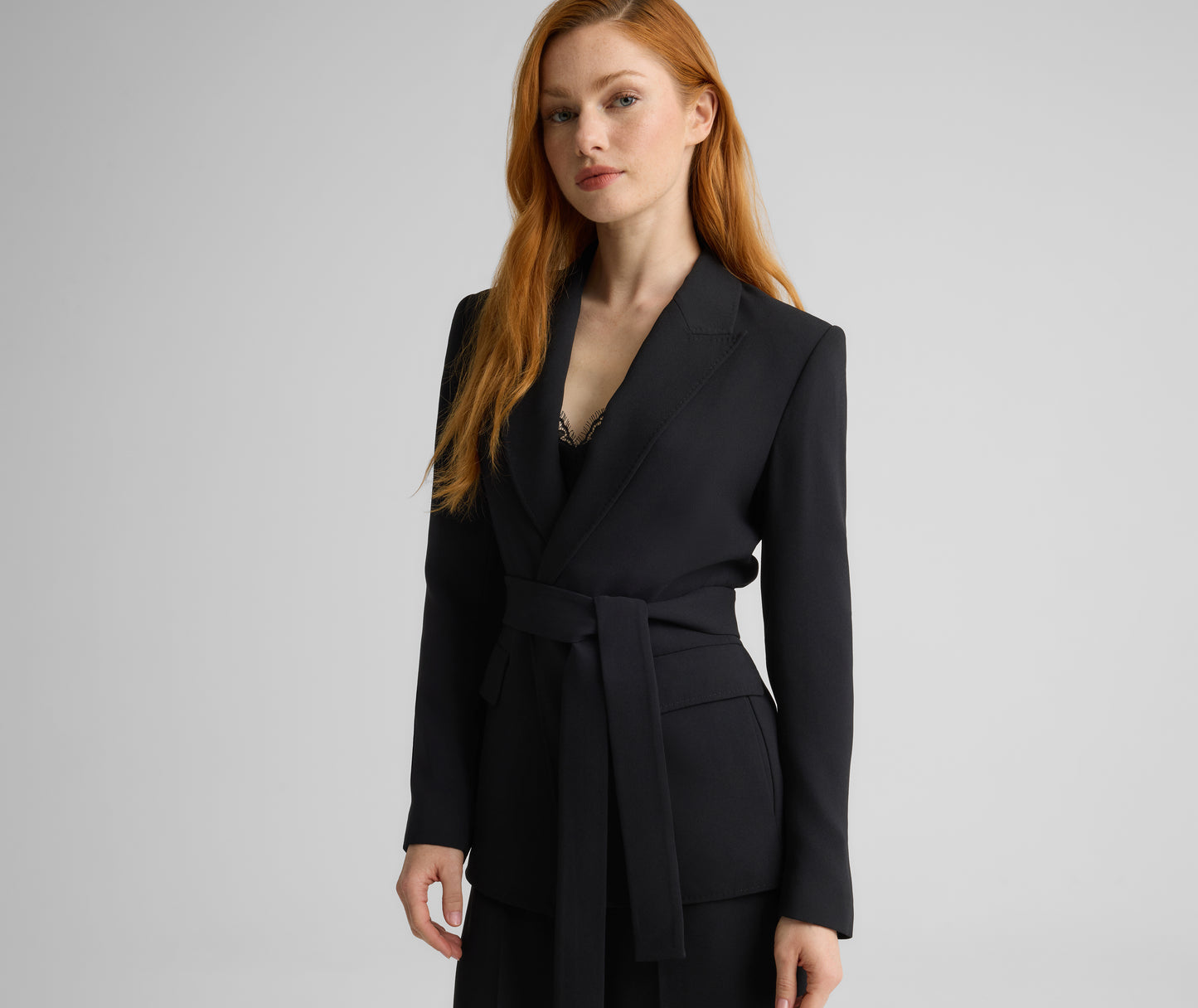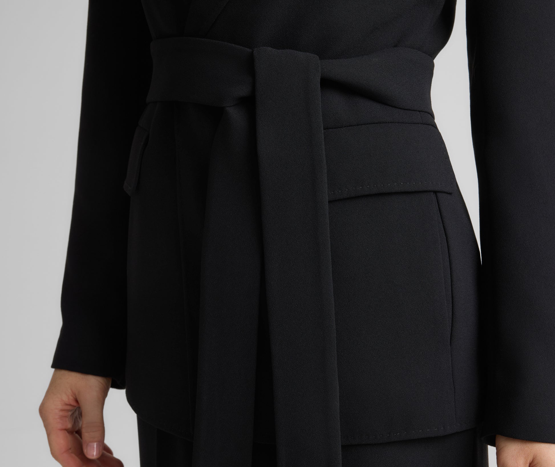 The Juliana puts a softer spin on traditional tailoring. Made from fluid Satin Back Crepe in timeless Black to drape effortlessly on the body, this evening-ready jacket features a tie waist for the most flattering fit. Wear as a luxurious layer over formal dresses or pair with the matching Tabitha Pant for a graceful take on the tux.