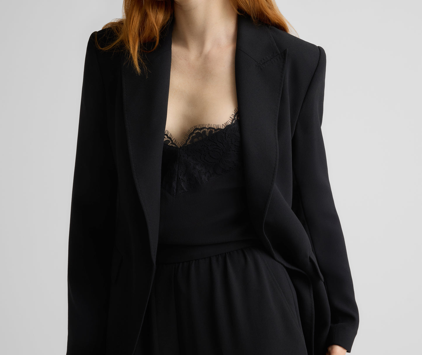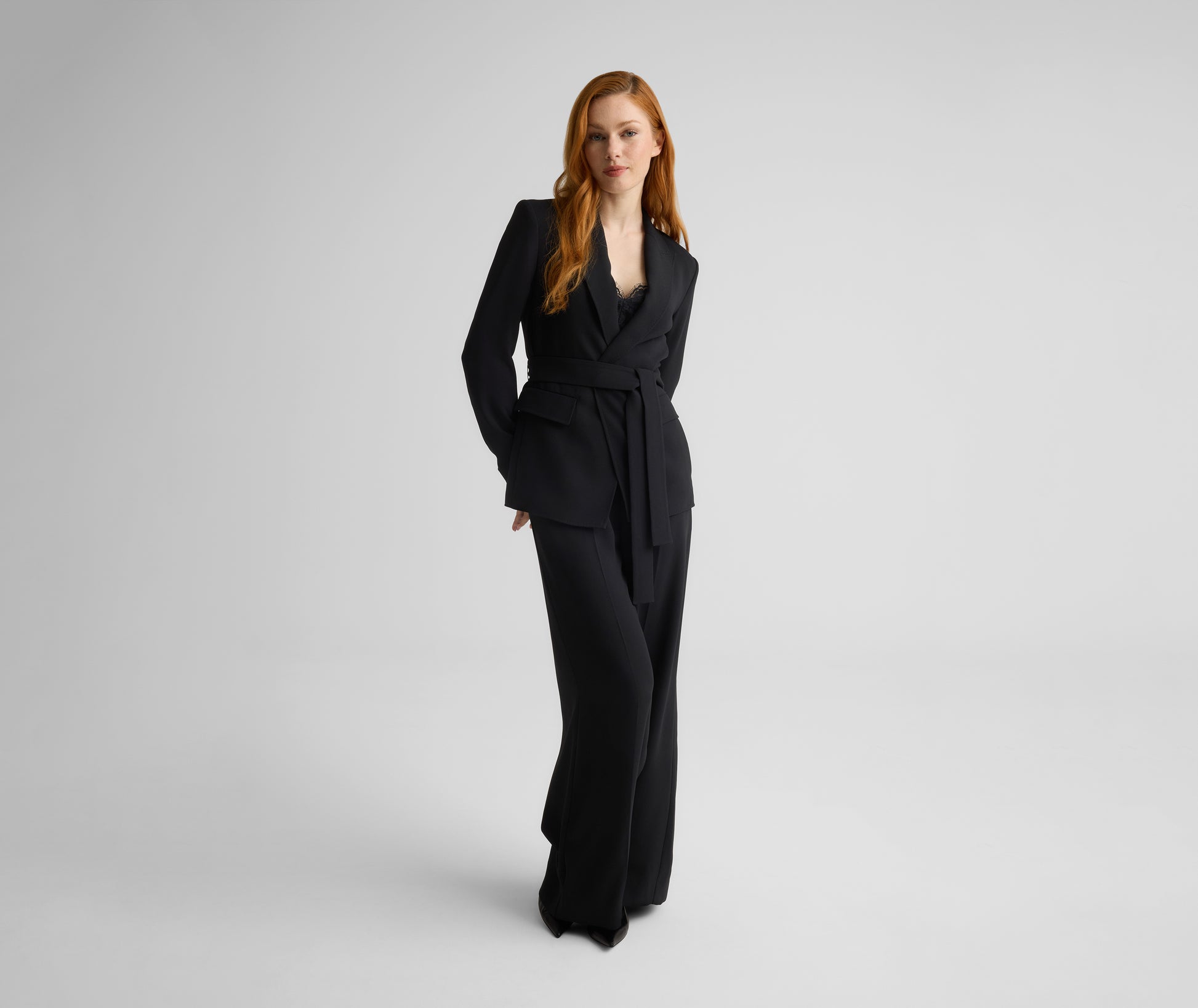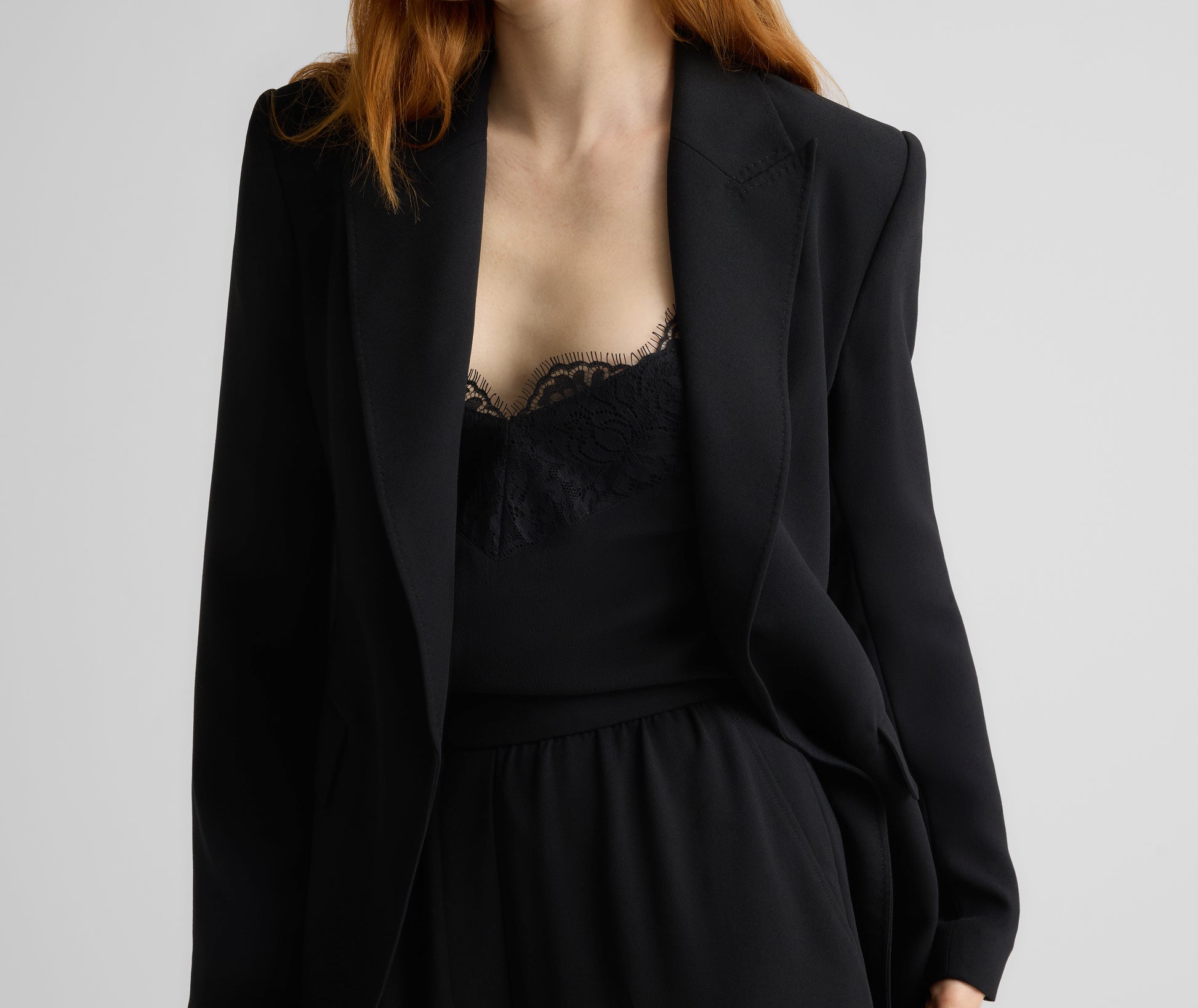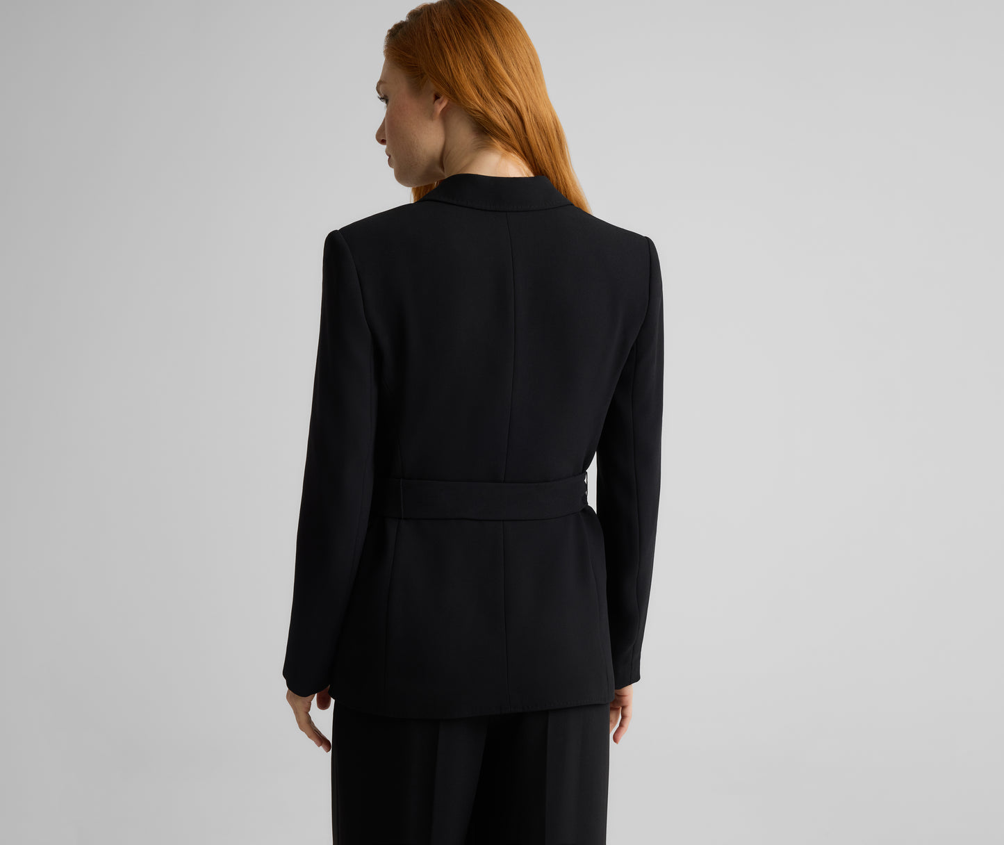 The Juliana puts a softer spin on traditional tailoring. Made from fluid Satin Back Crepe in timeless Black to drape effortlessly on the body, this evening-ready jacket features a tie waist for the most flattering fit. Wear as a luxurious layer over formal dresses or pair with the matching Tabitha Pant for a graceful take on the tux.