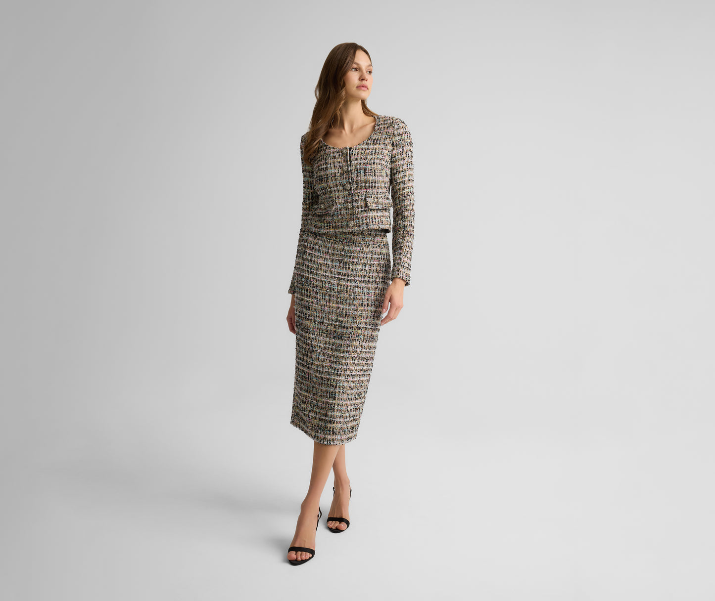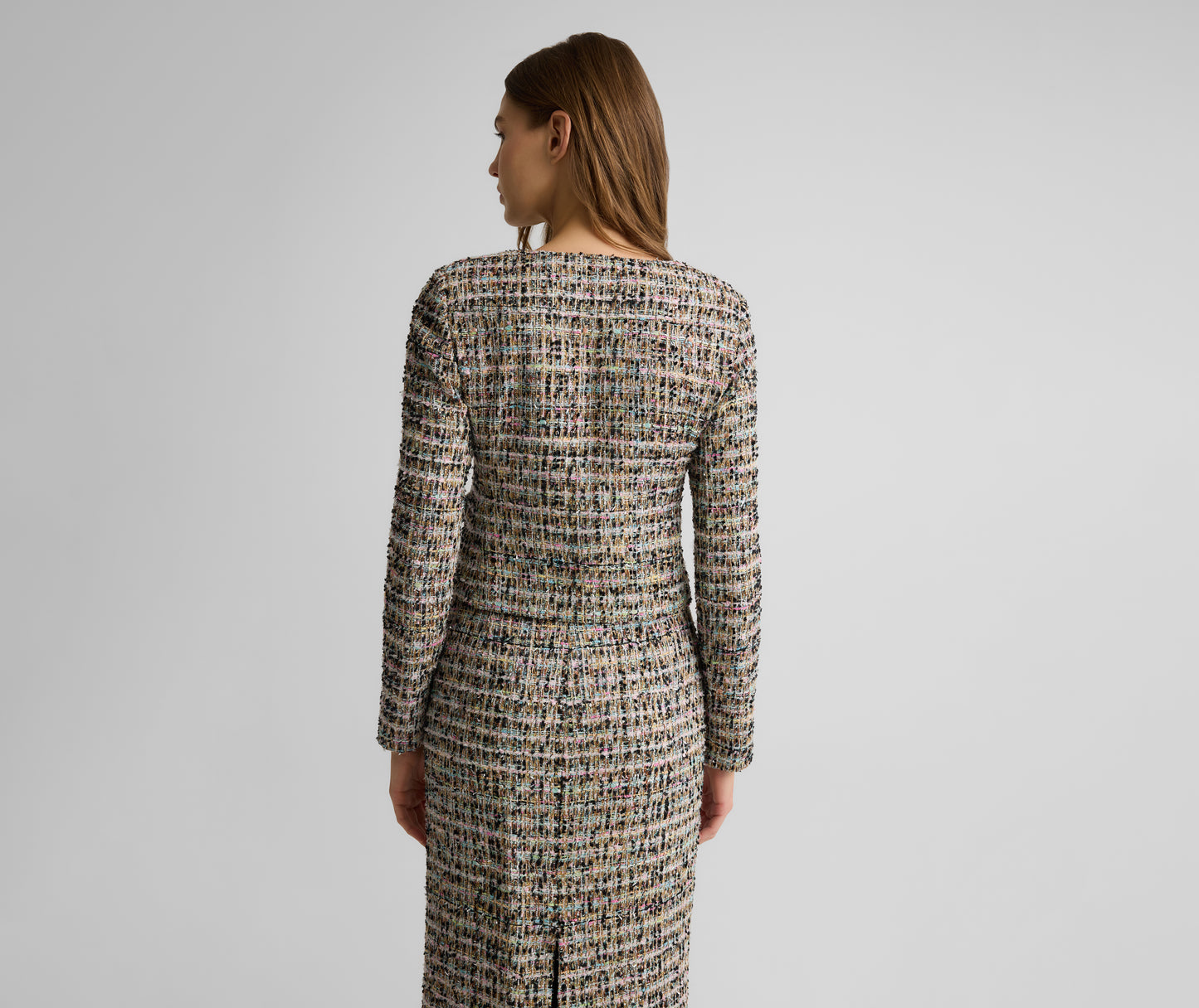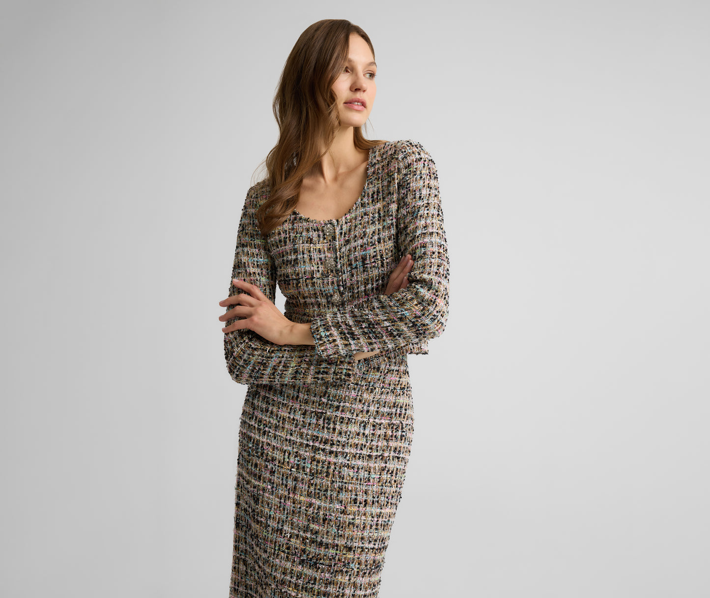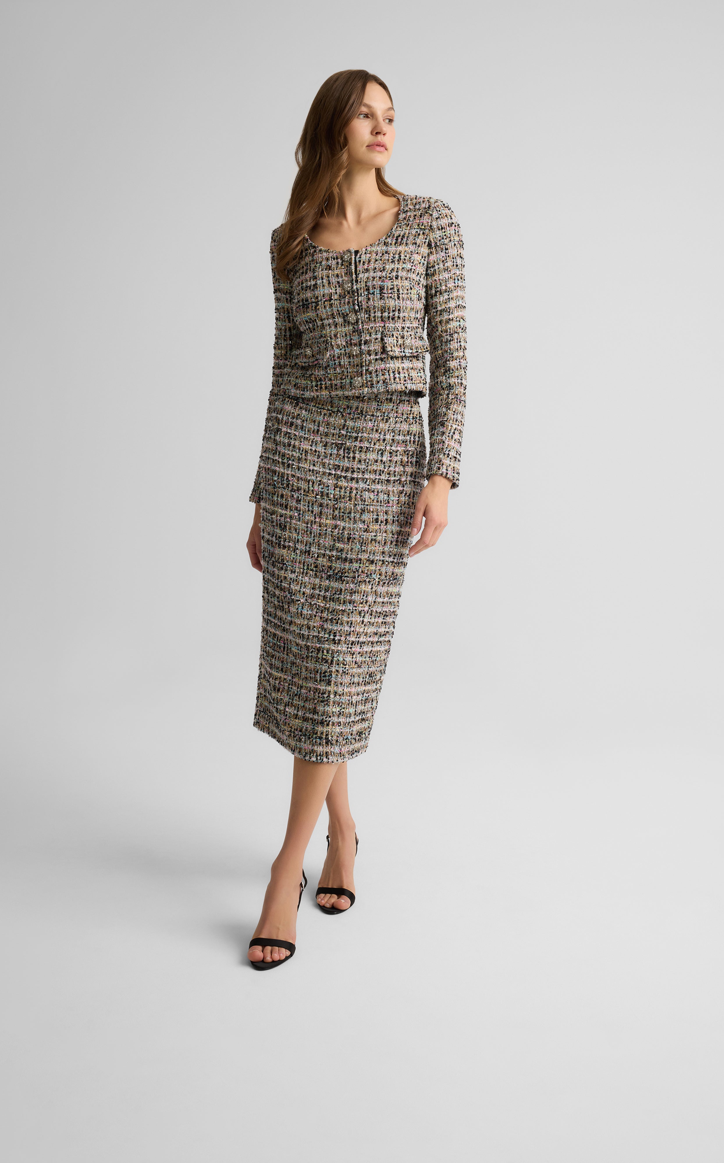 With all the elements of classic tweed jacket plus elevated details that bring it effortlessly into the evening, the Ulyissa Jacket was designed to catch the eye in every setting. This clean, fitted silhouette is crafted in Cienega Tweed for a textured finish and subtle iridescent sheen that's enhanced by dazzling buttons. Wear with the Loren Skirt as a striking formal wear set or layer over laid-back separates to turn up the glamour.