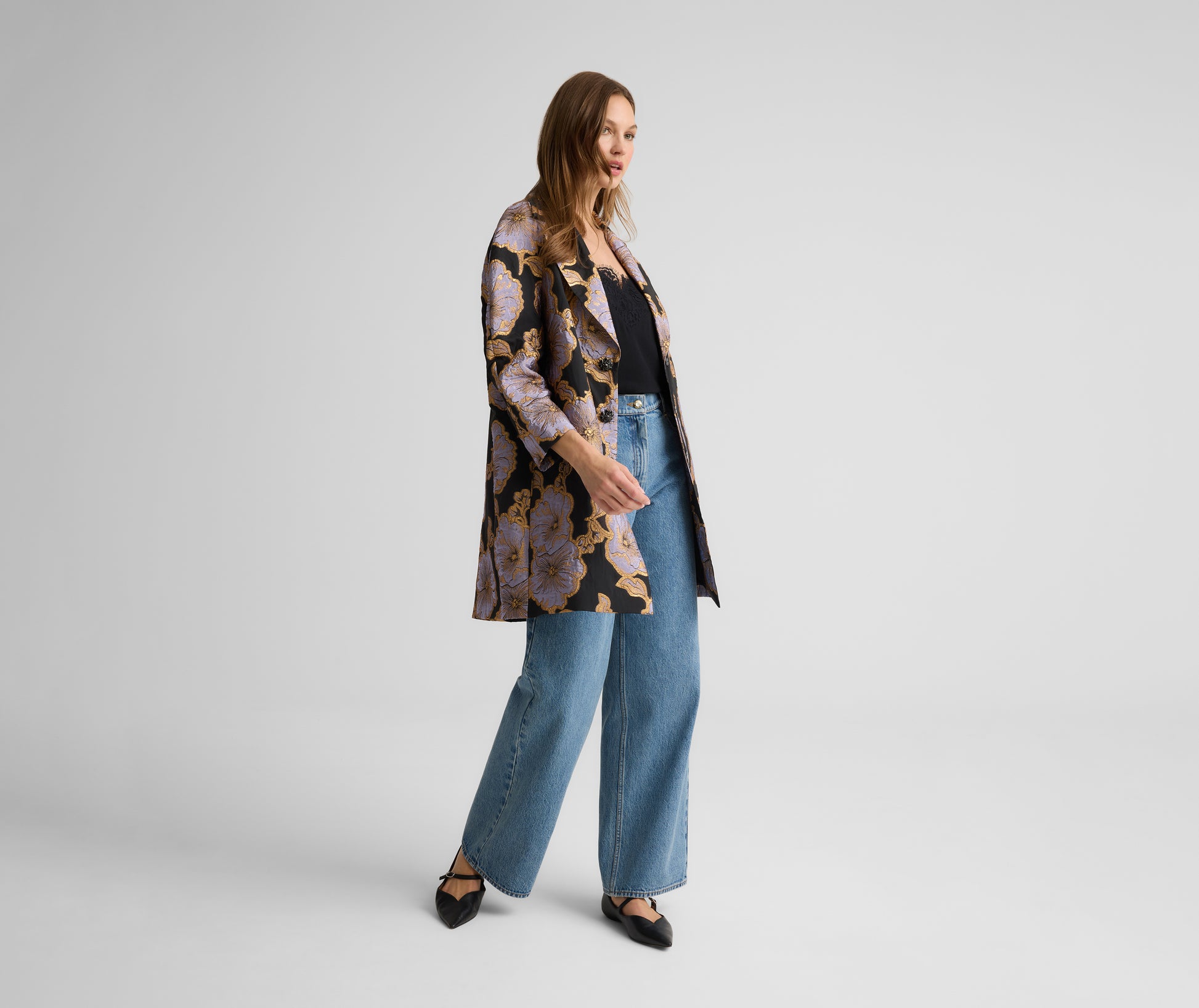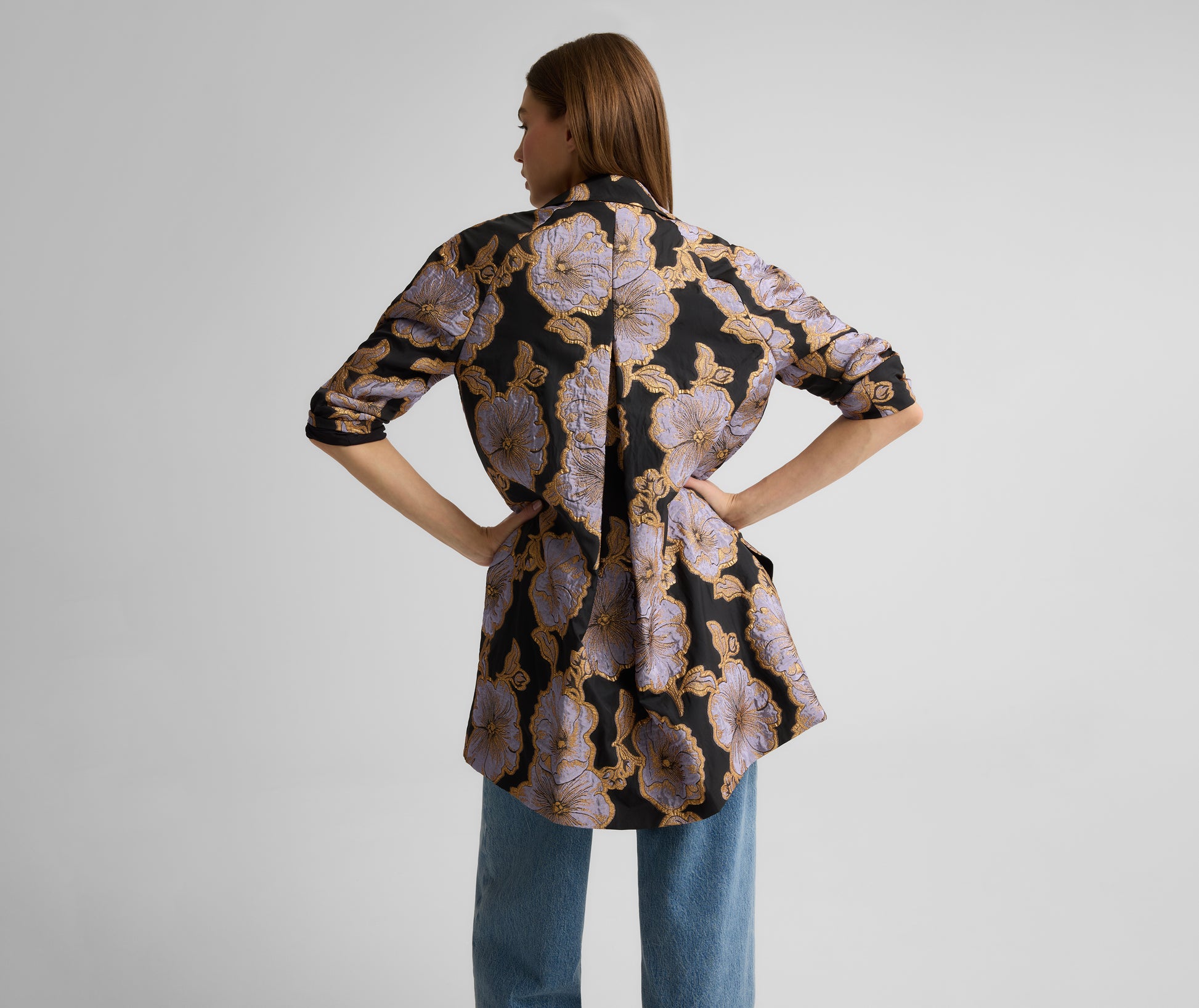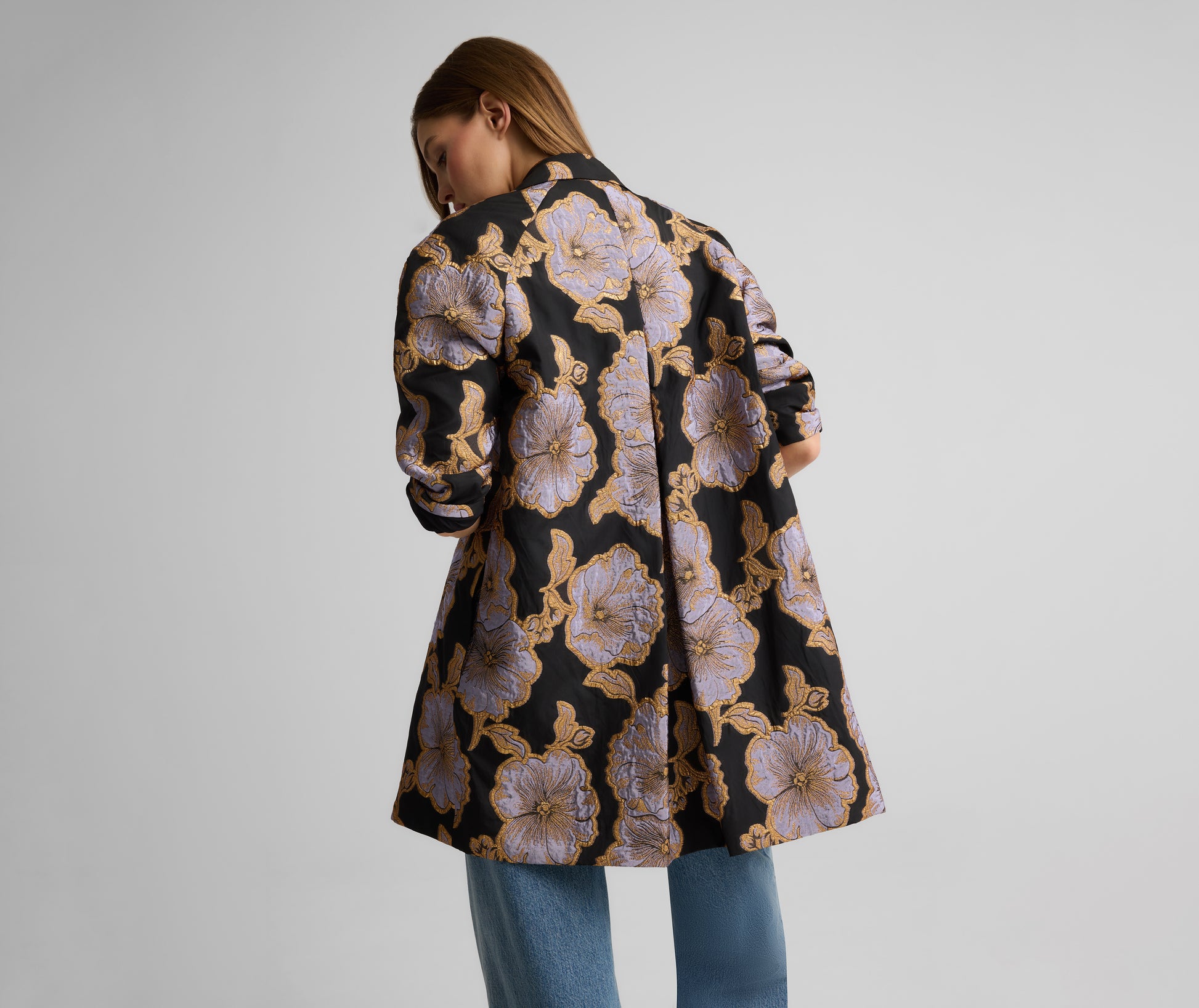 With its voluminous silhouette and oversized floral print, the Maxine exudes opulence. Crafted from our slightly shimmering bespoke Poppy Floral Jacquard, this opera jacket makes a striking statement, whether dressed down with casual separates or layered over your most elegant evening wear.
