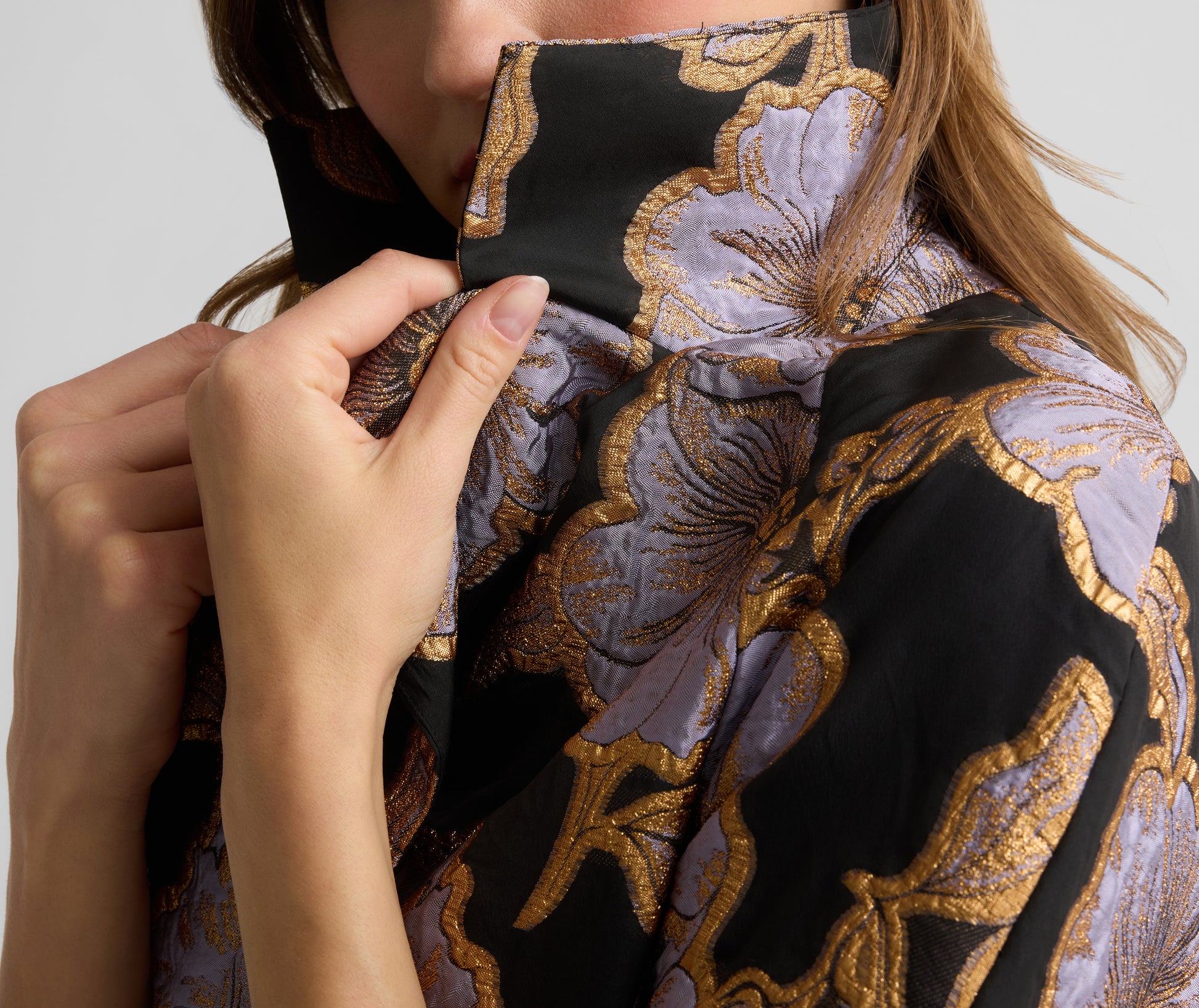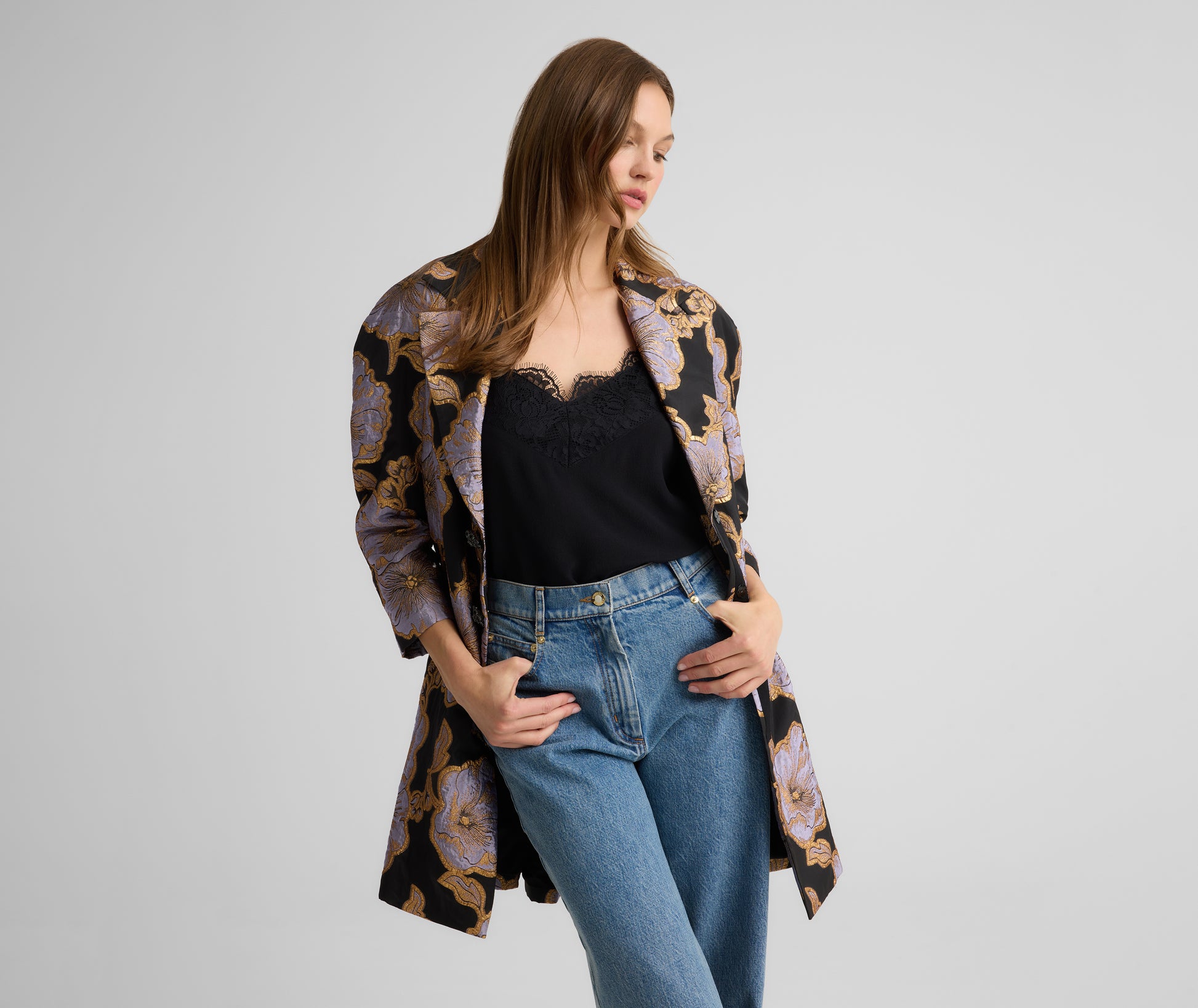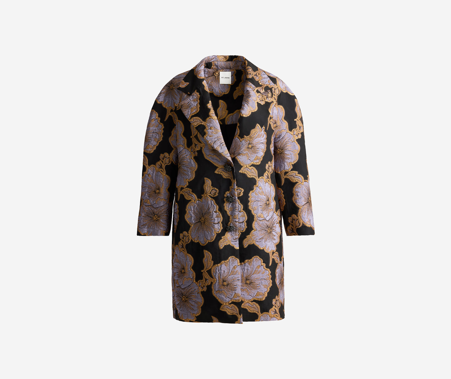 With its voluminous silhouette and oversized floral print, the Maxine exudes opulence. Crafted from our slightly shimmering bespoke Poppy Floral Jacquard, this opera jacket makes a striking statement, whether dressed down with casual separates or layered over your most elegant evening wear.